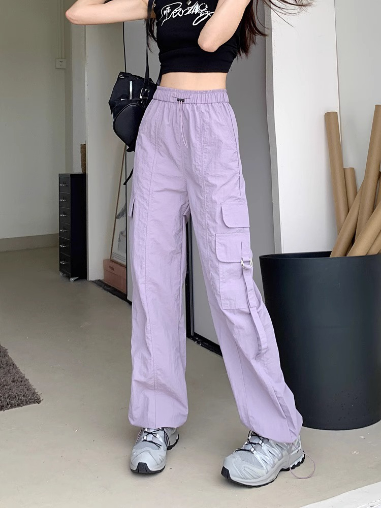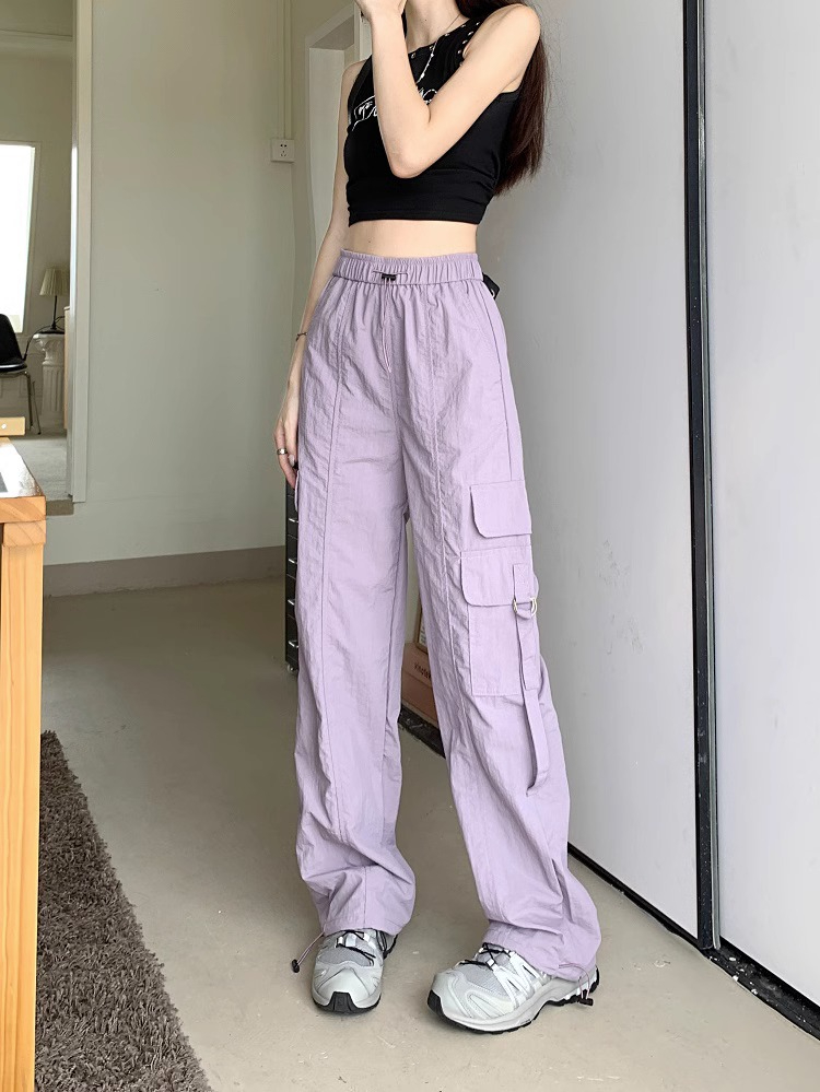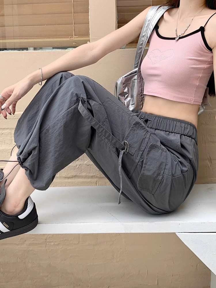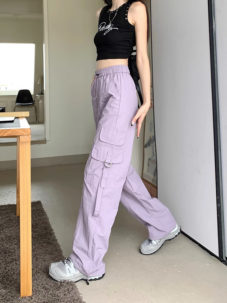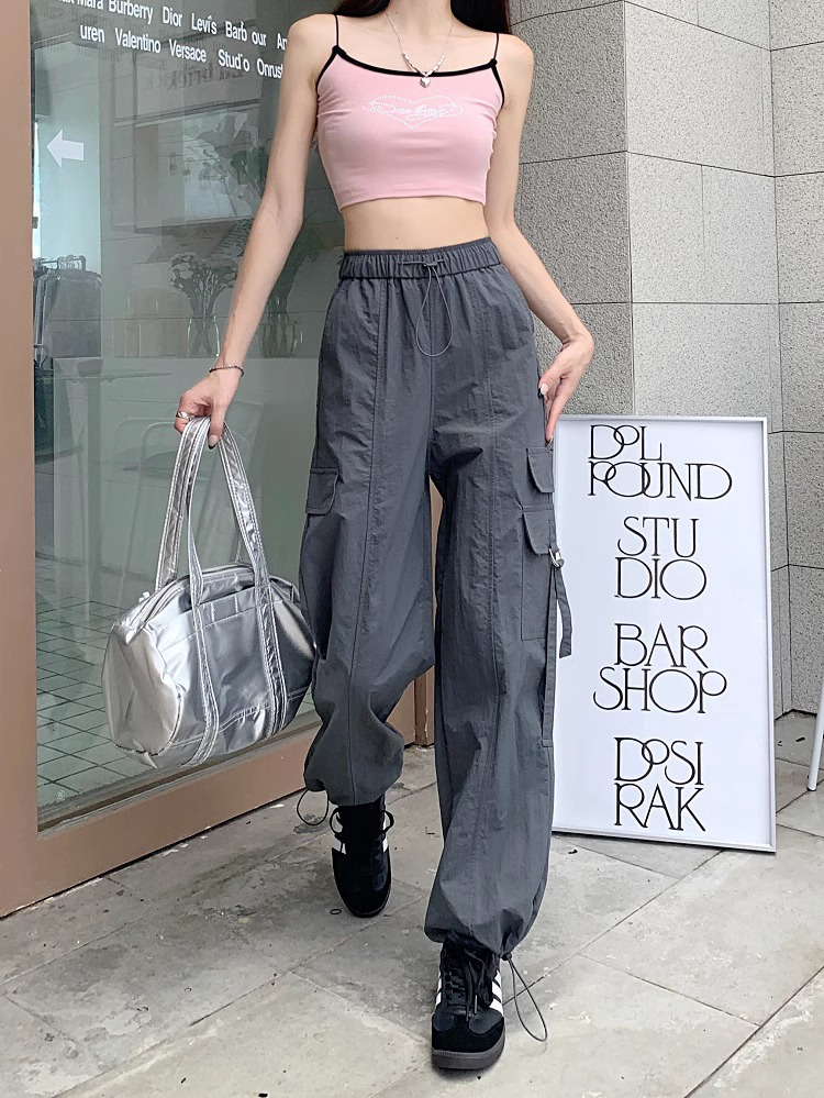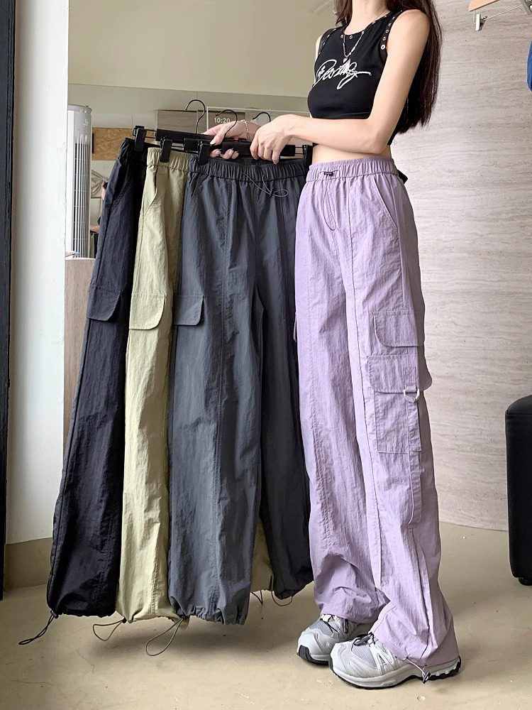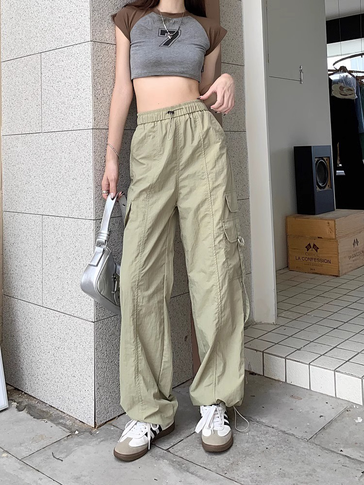 PF3424#工装裤子夏季 新款高腰宽松抽绳阔腿休闲裤子女直筒长裤