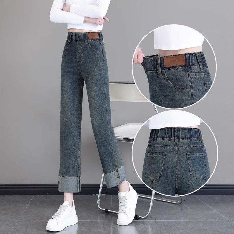 PF3474#松紧腰牛仔裤女烟管裤 新款高腰卷边小个子九分大码直筒裤子
