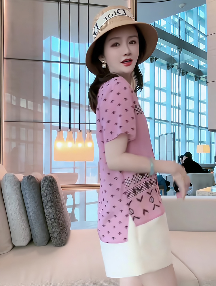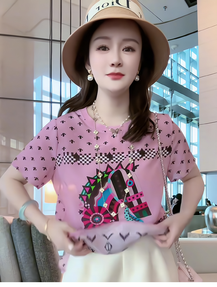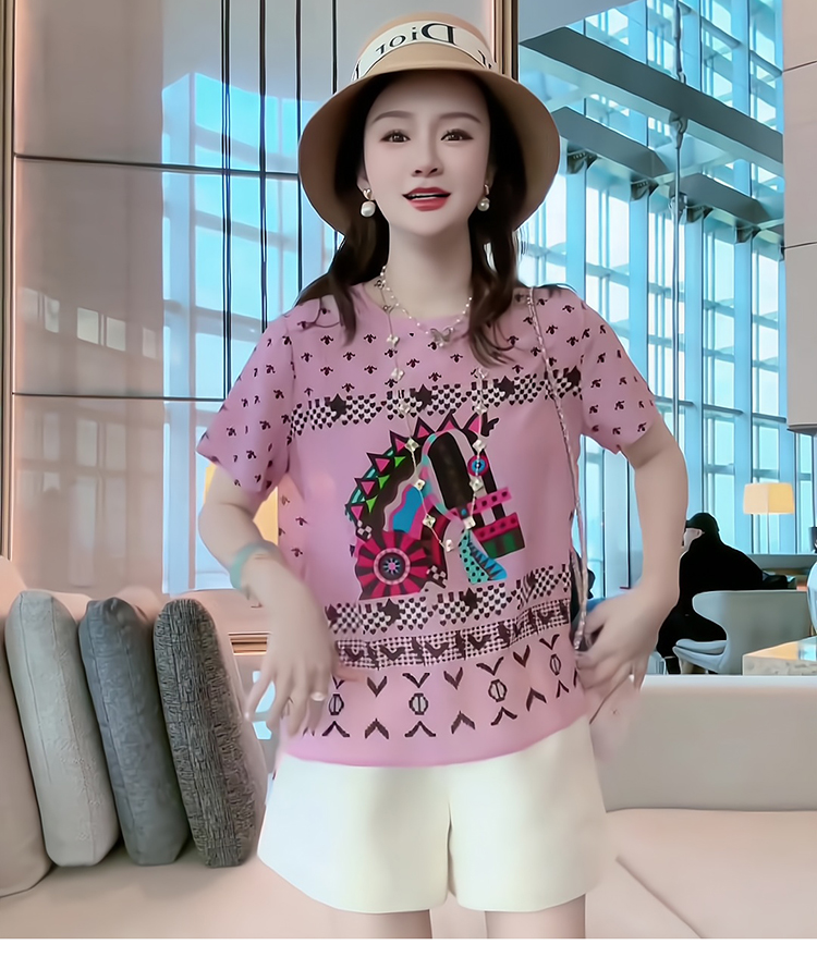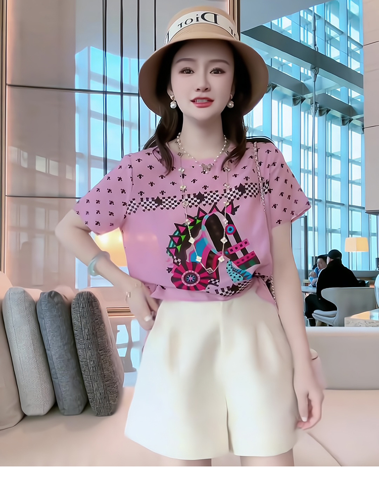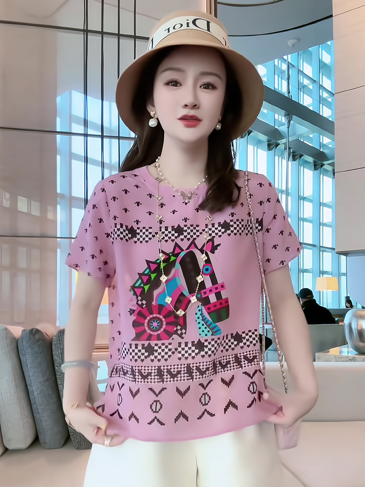 PF3489#夏季新款粉色马紋休闲时尚T恤法式复古印花圆领宽松短袖上衣
