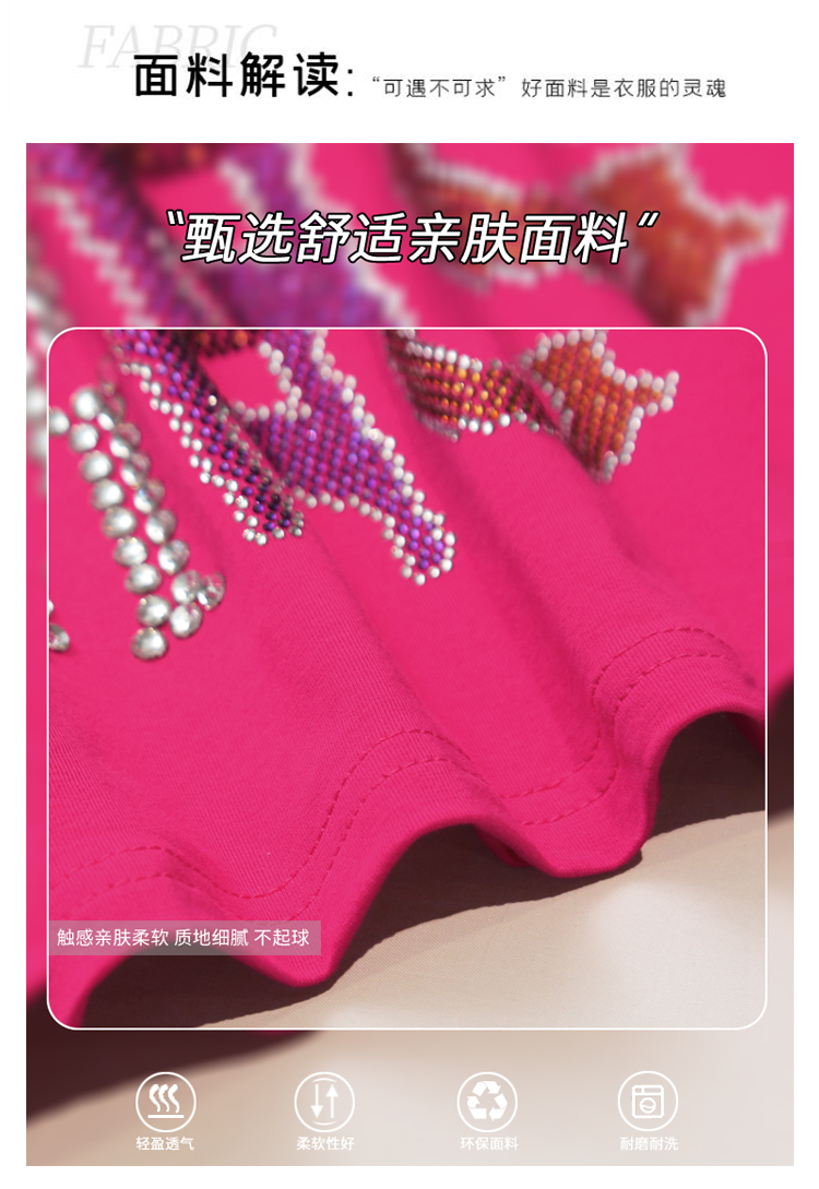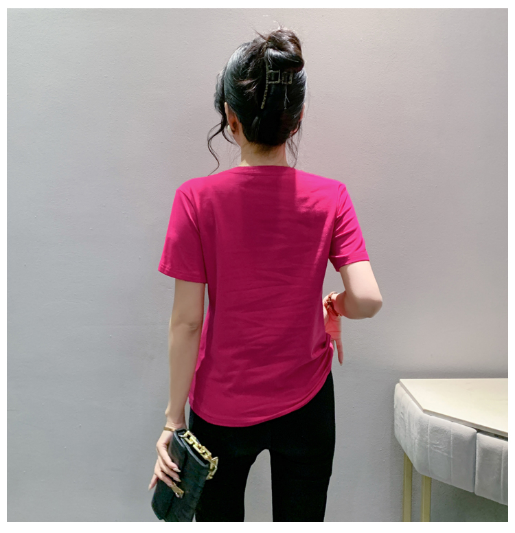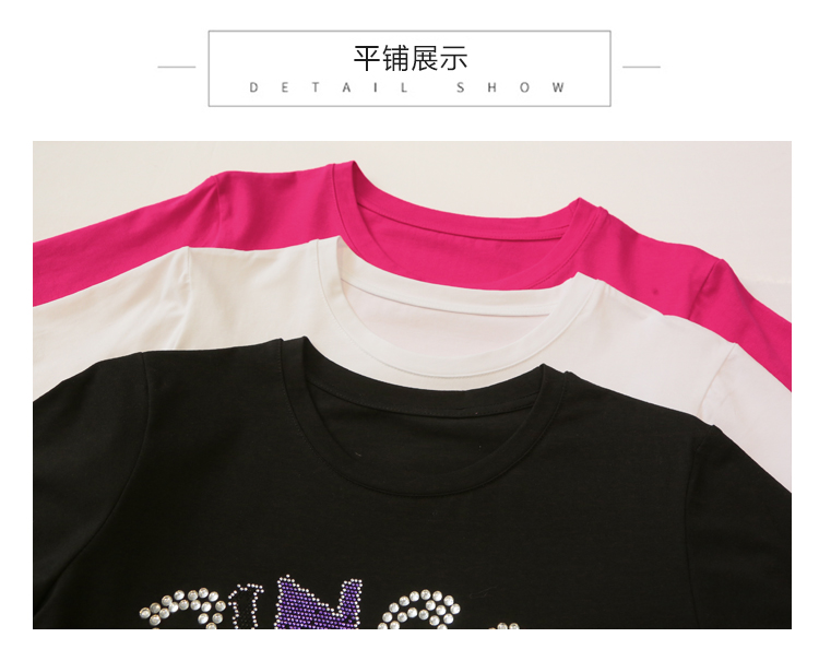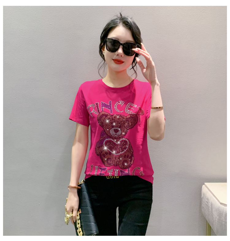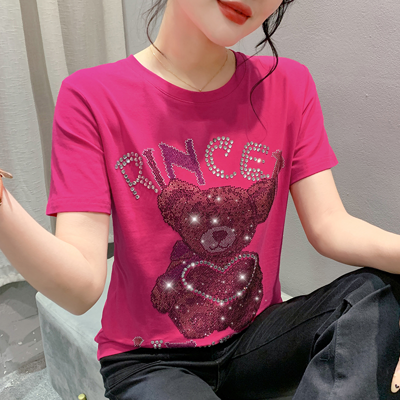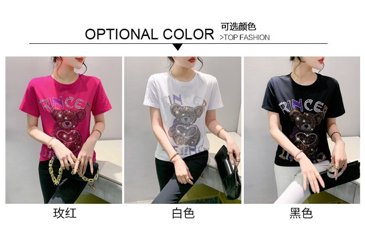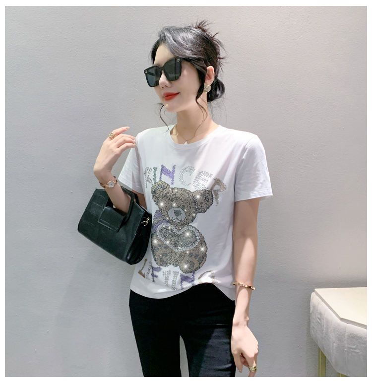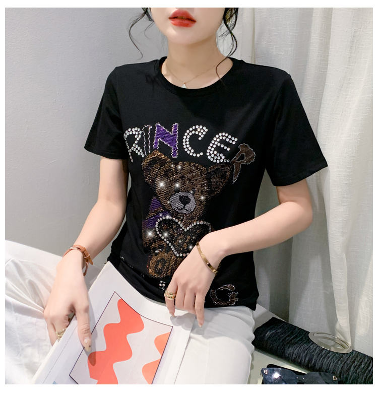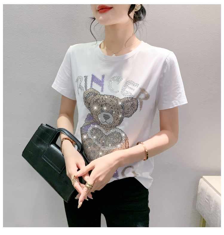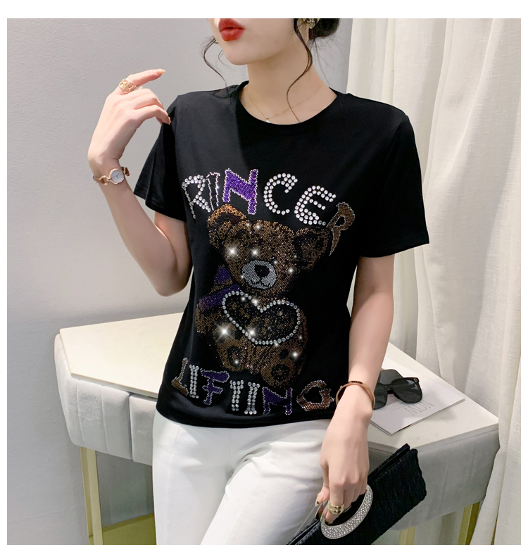 PF3578#新款欧货重工小熊烫钻纯棉短袖T恤女2024年休闲显瘦百搭上衣