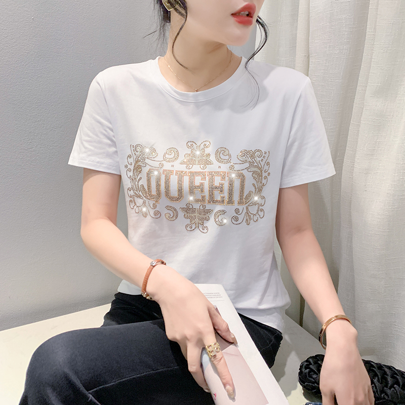 PF3579#欧洲站 夏装新款韩版百搭圆领字母烫占T恤女休闲上衣