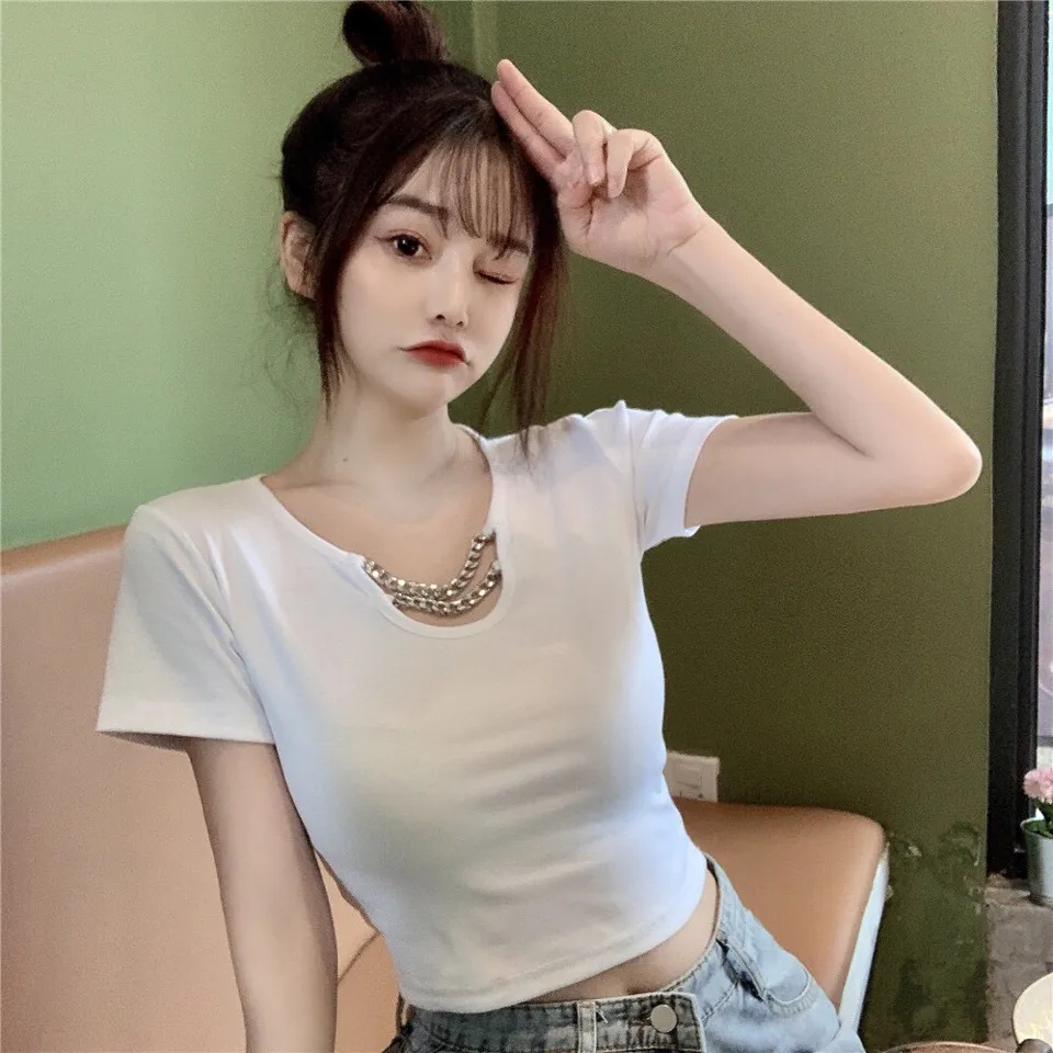 PF3645#纯棉 32支 链条修身高腰短款镂空性感上衣纯欲风
