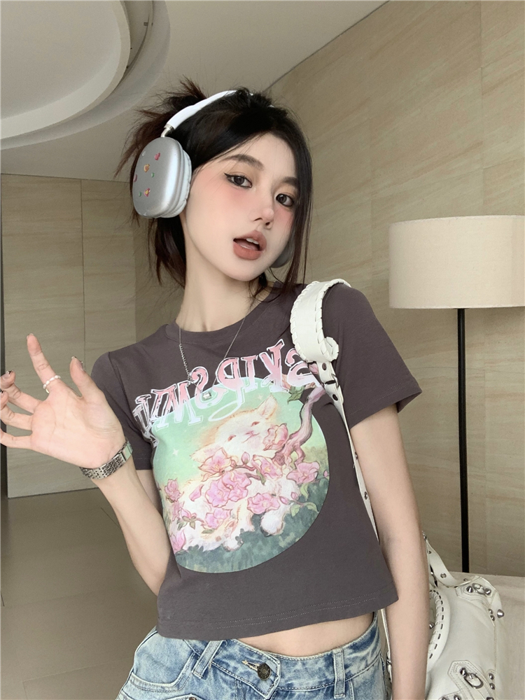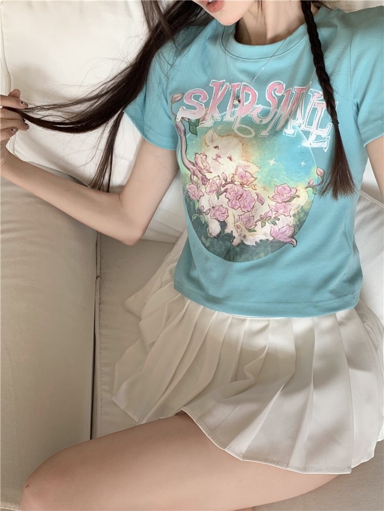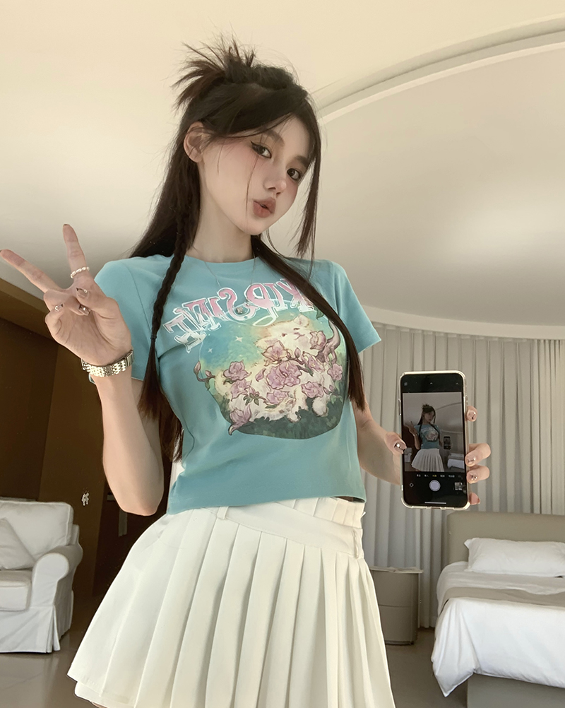 PF3653#羊羊花朵印花短袖tee甜辣妹修身减龄百搭圆领上衣