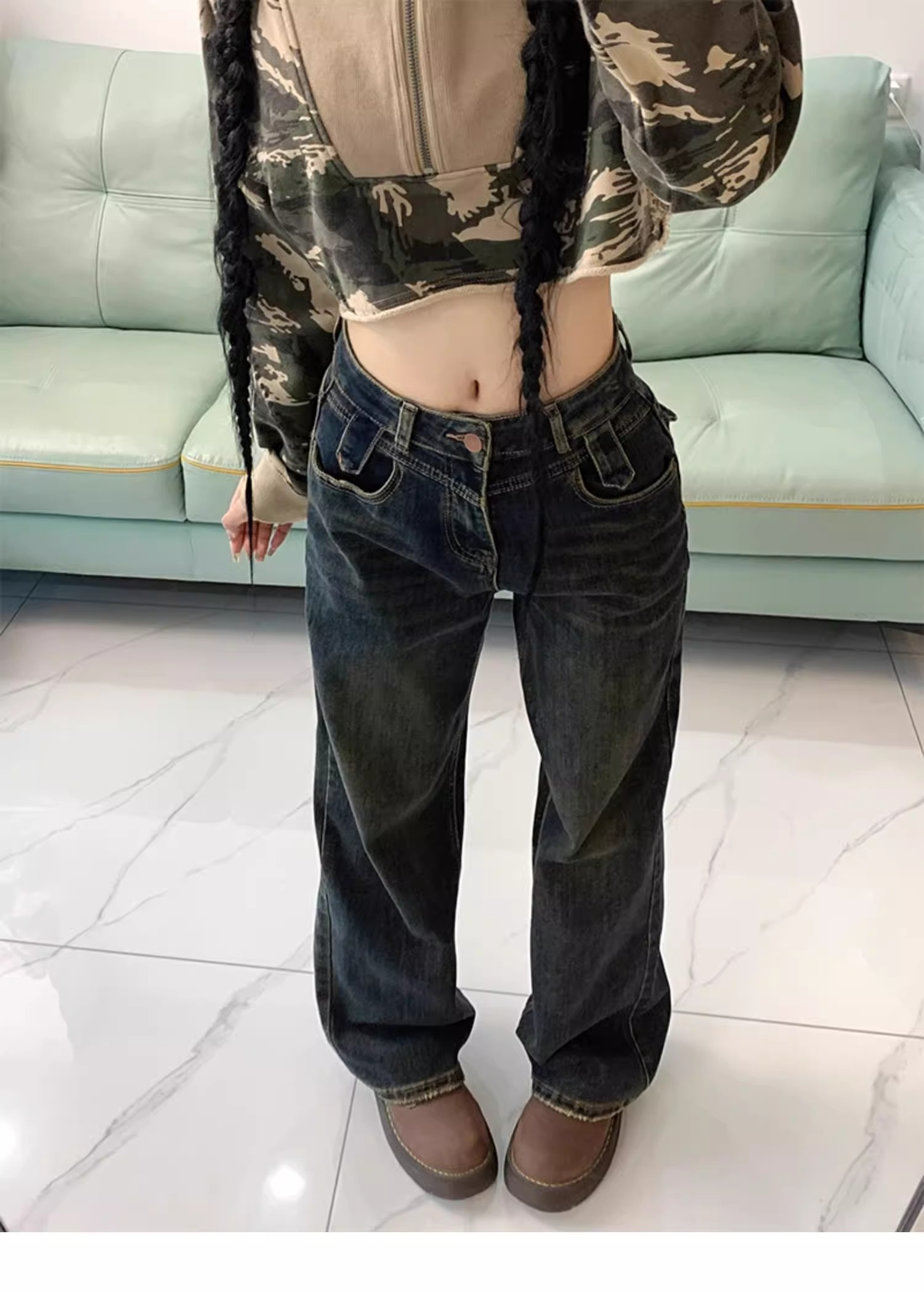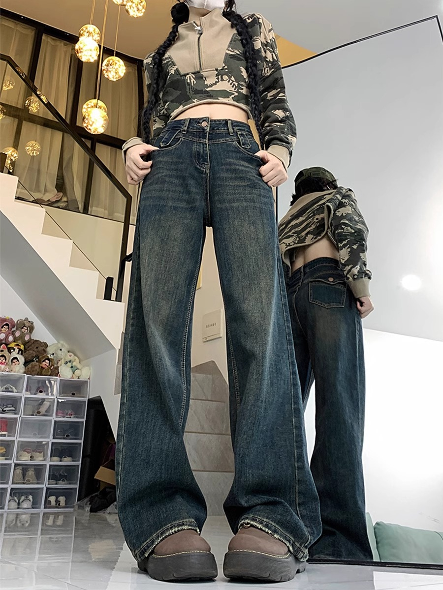 PF3693#大码美式复古牛仔裤女春秋新款胖mm宽松显瘦高腰直筒阔腿拖地裤子