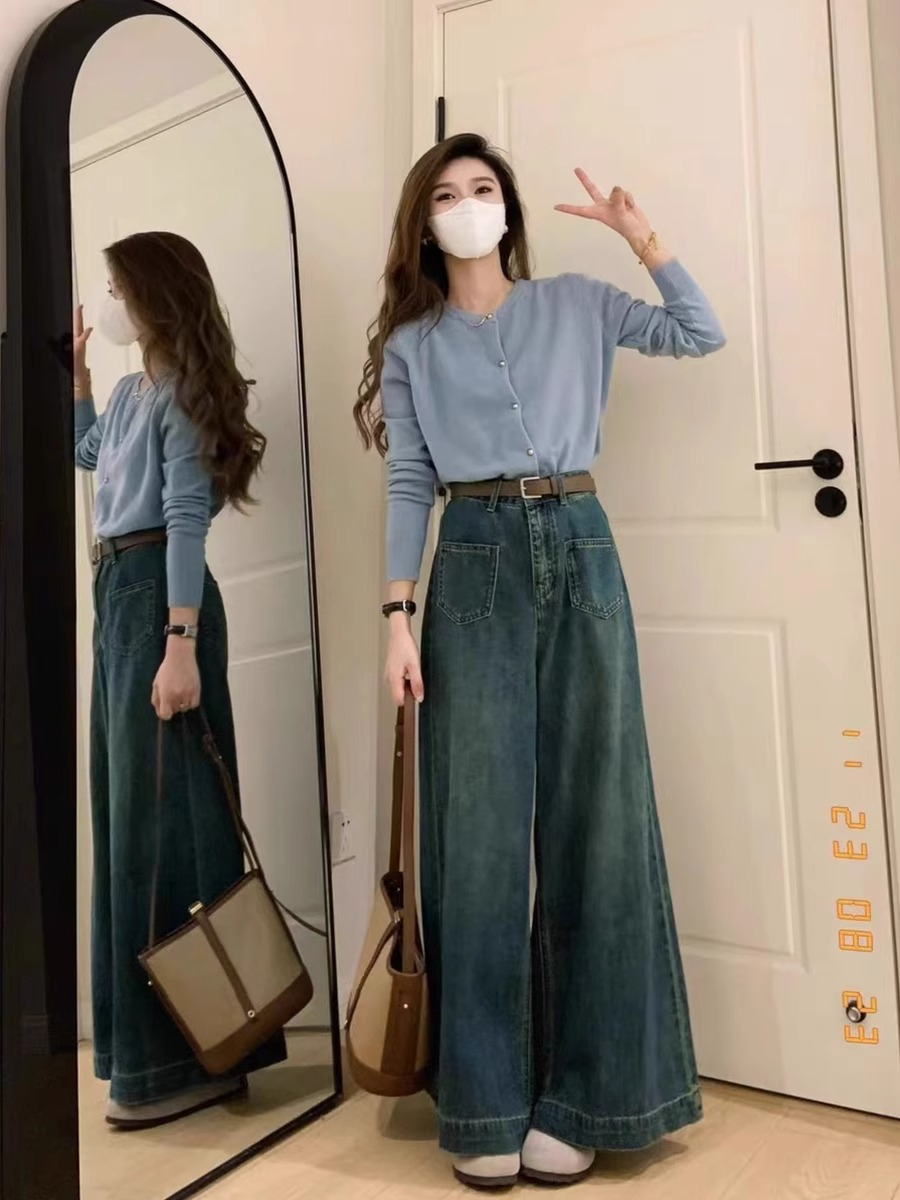 PF3696#阔腿牛仔裤女款高腰宽松设计感小众直筒裤小复古拖地裤