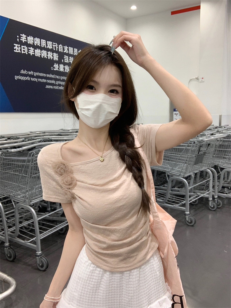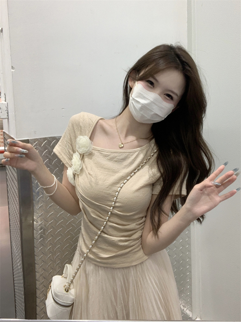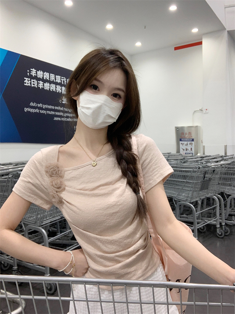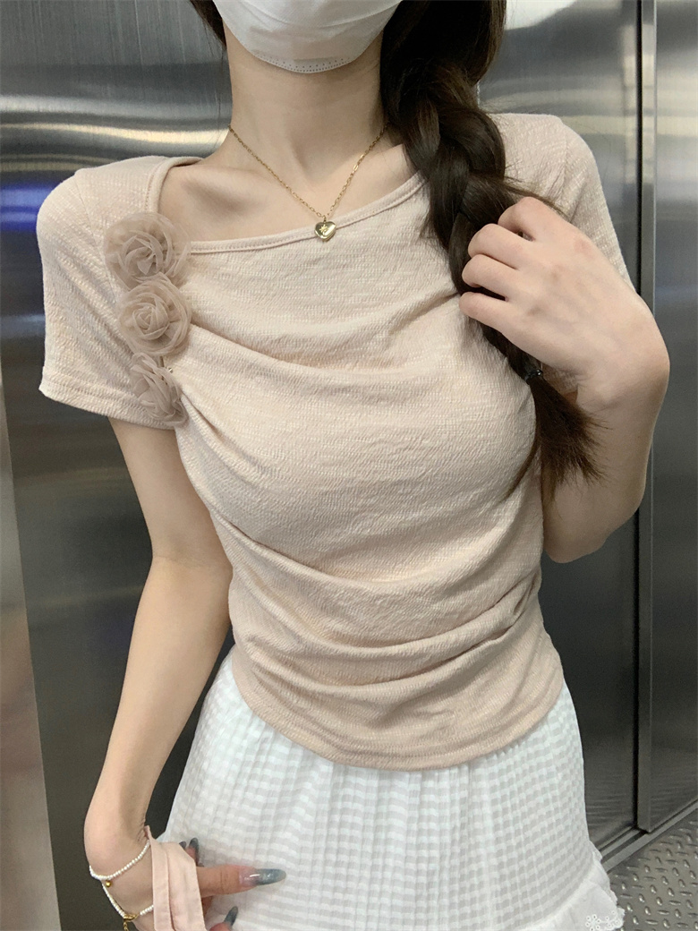 PF3749#夏季新款纯欲法式小众设计感短款褶皱玫瑰花短袖上衣