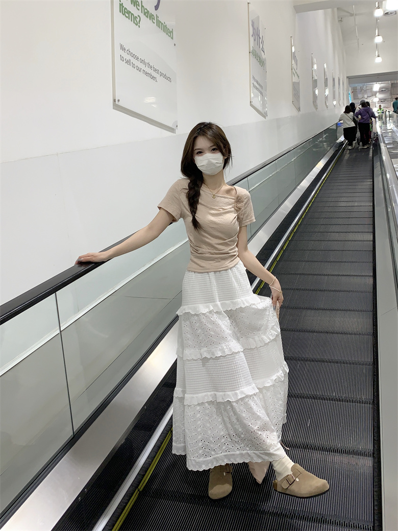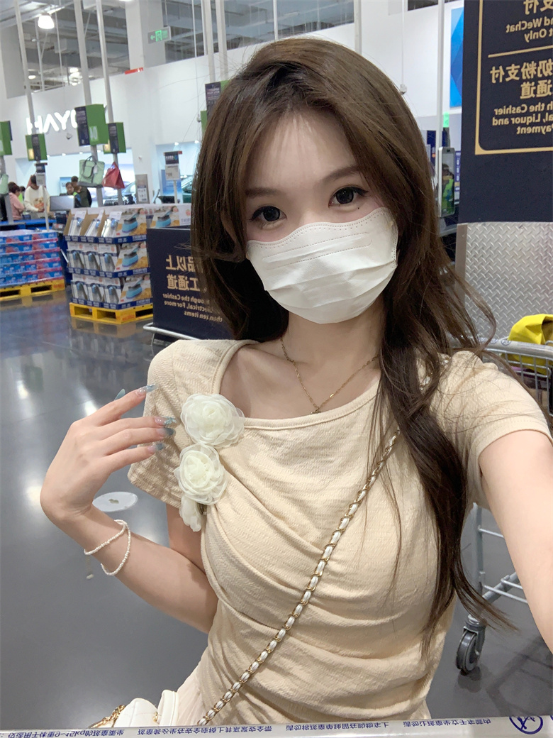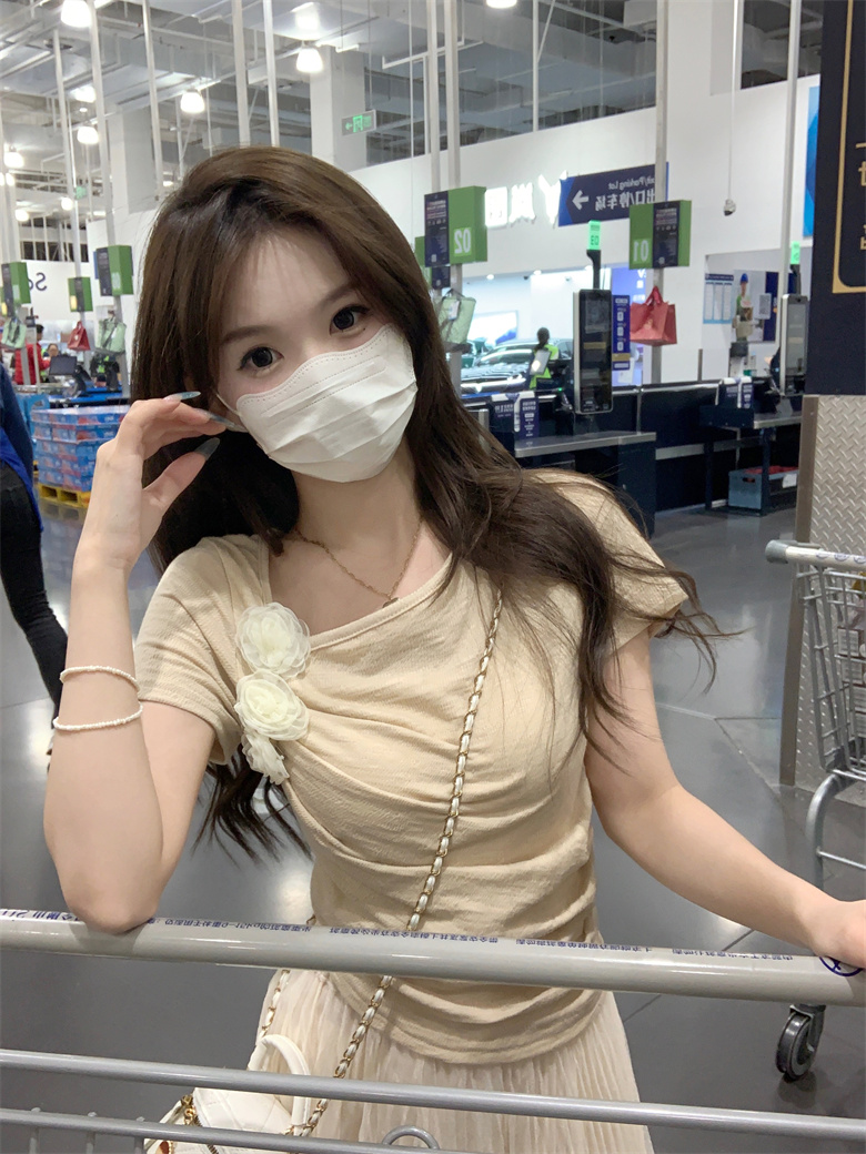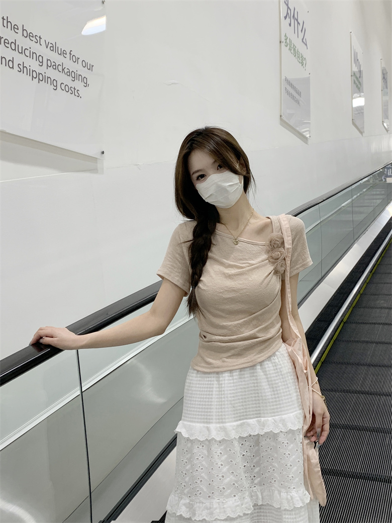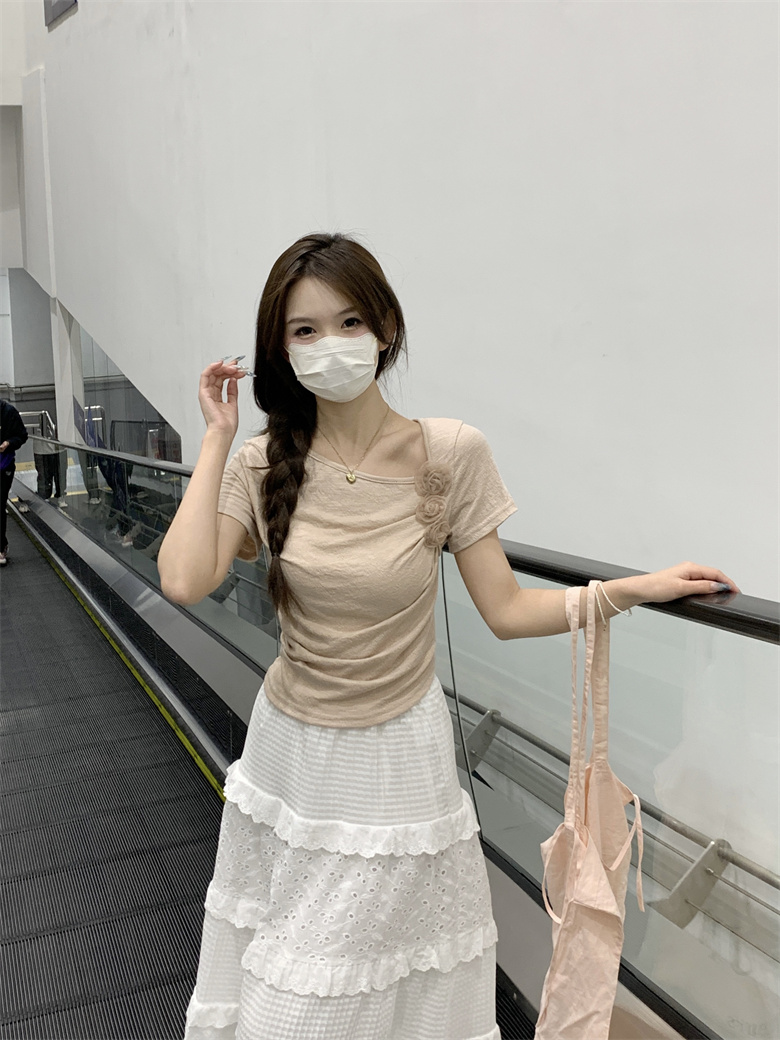 PF3749#夏季新款纯欲法式小众设计感短款褶皱玫瑰花短袖上衣