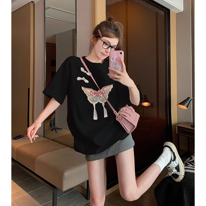 PF3780#韩国新款休闲21支高紧密纯棉 国风刺绣盘扣短袖t恤女中式