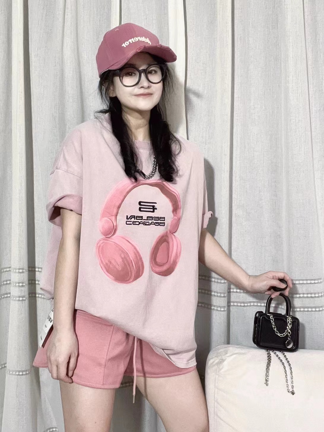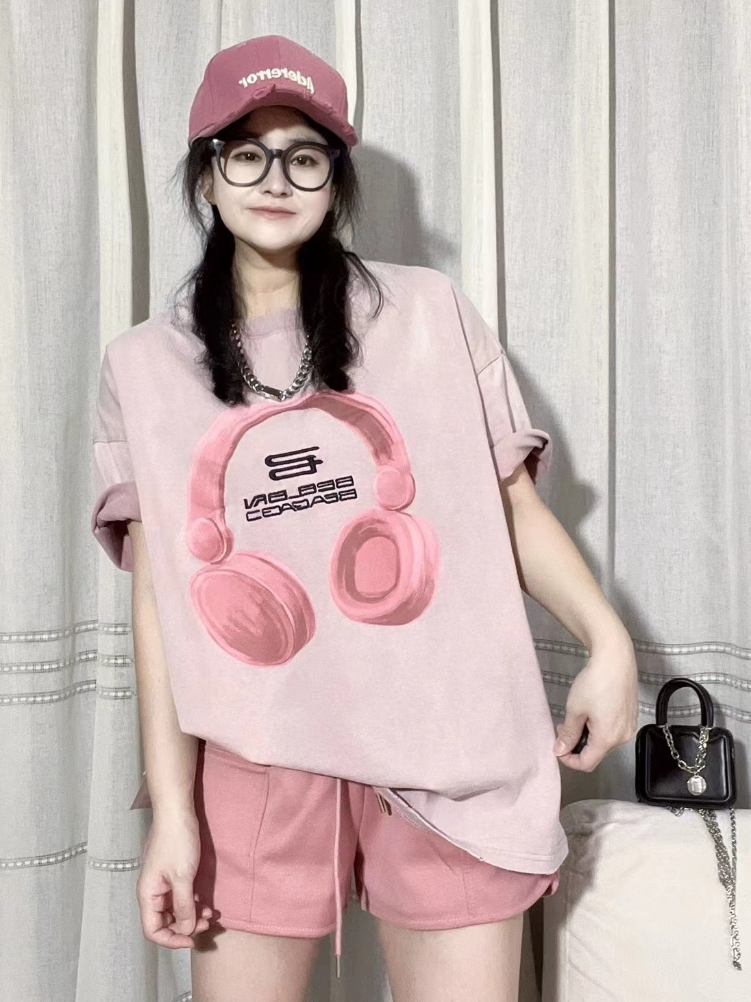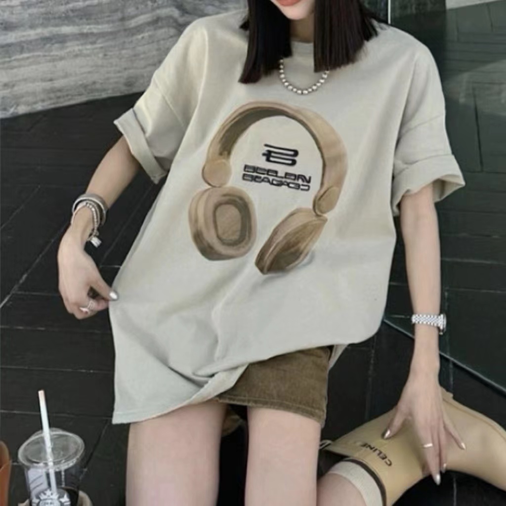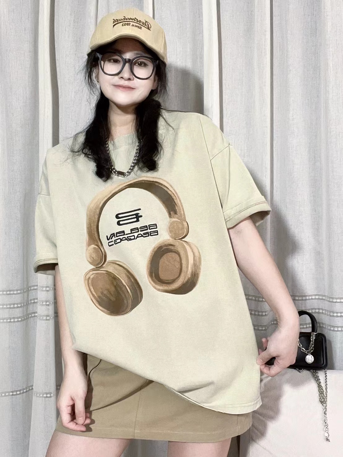 PF3893#街头潮牌个性耳机印花正肩T恤女夏季无性别穿搭做旧简约时髦短袖