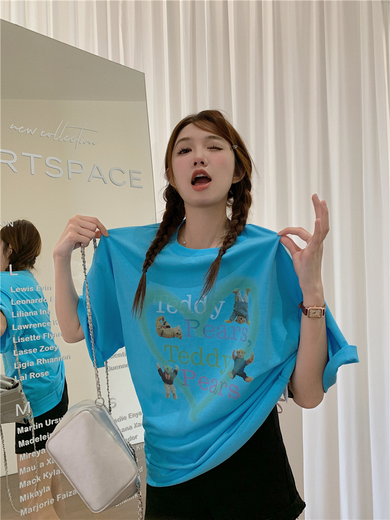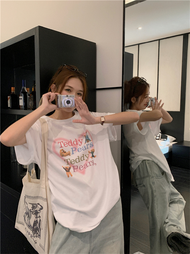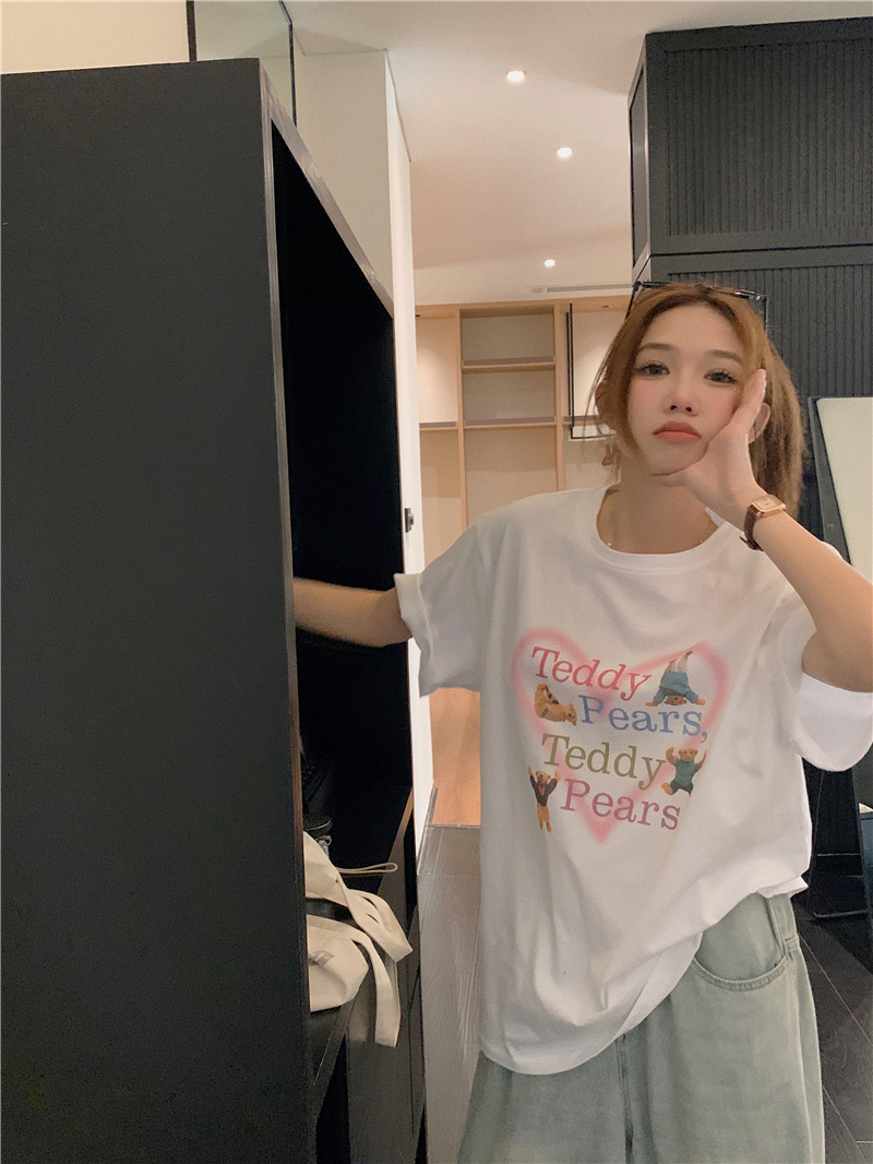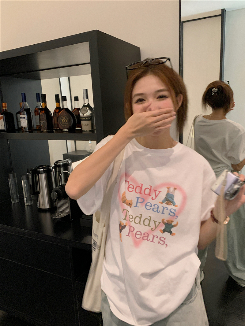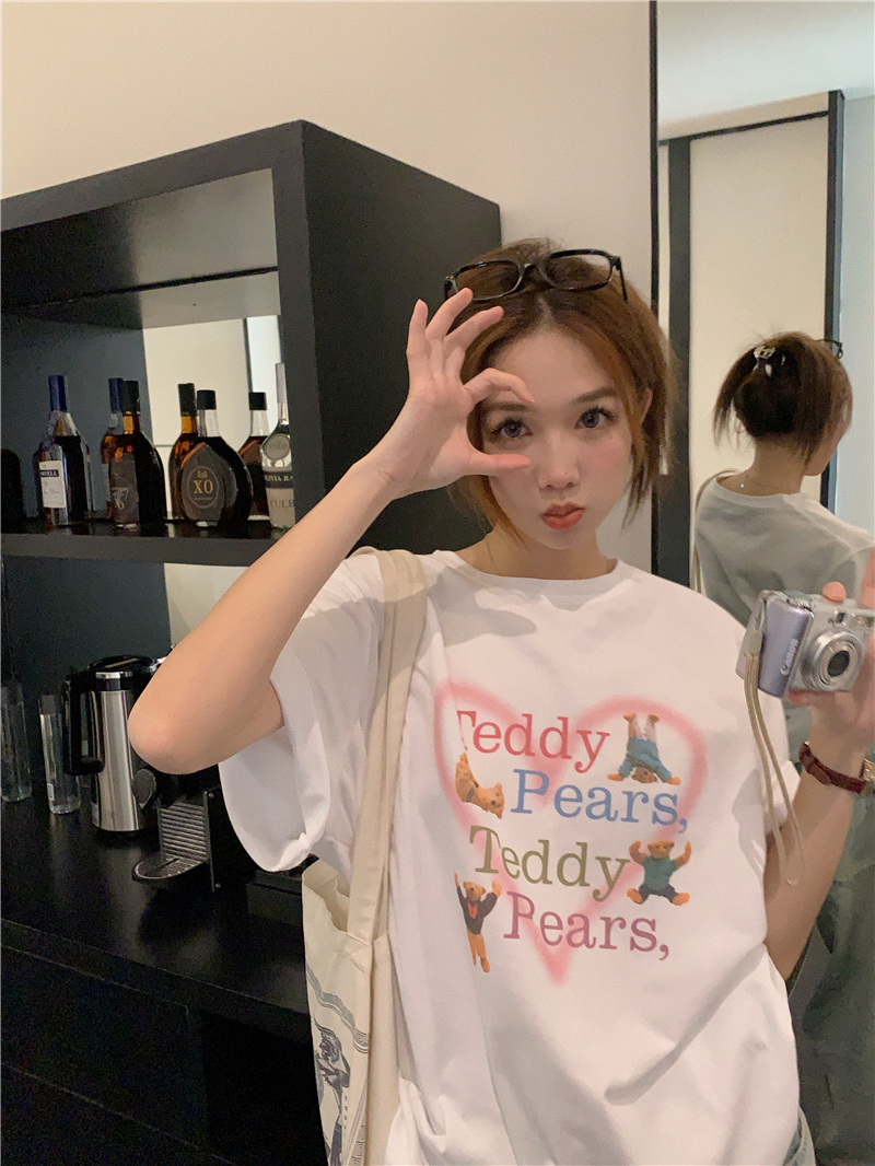 PF3942#夏季休闲爱心小熊印花宽松百搭短袖T恤