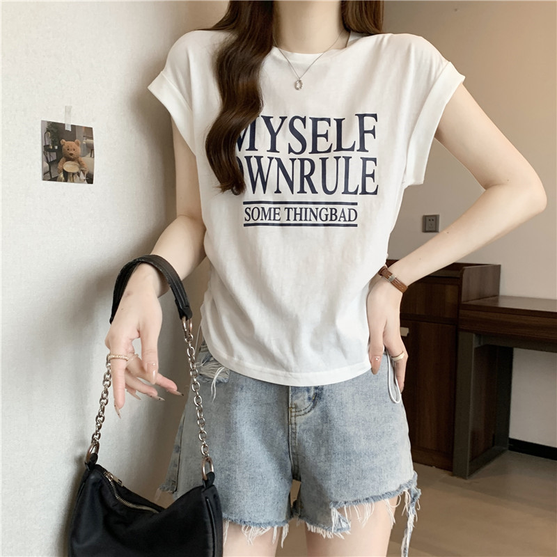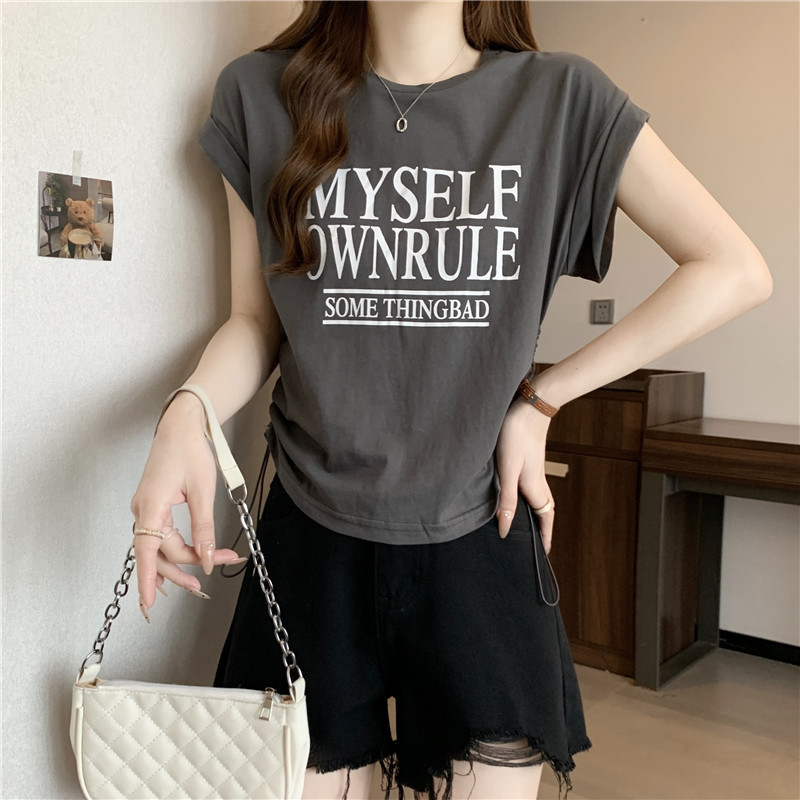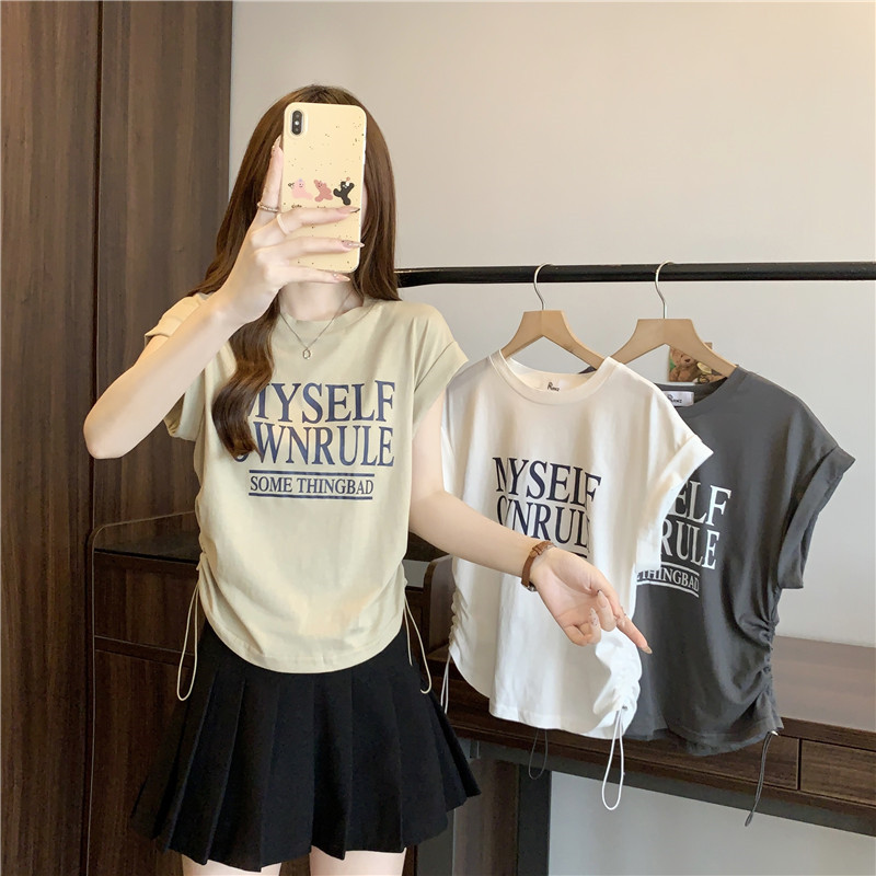 PF3943#夏装新款韩版宽松圆领两侧抽绳设计字母印花休闲百搭短袖T恤