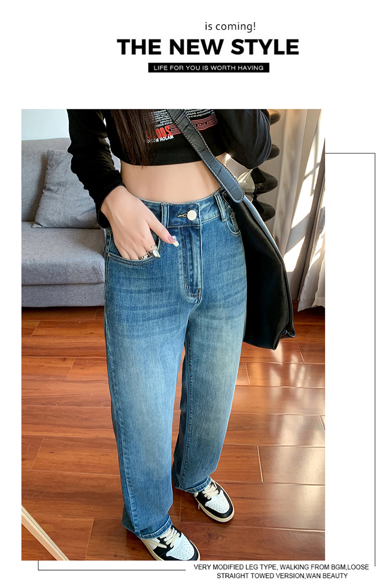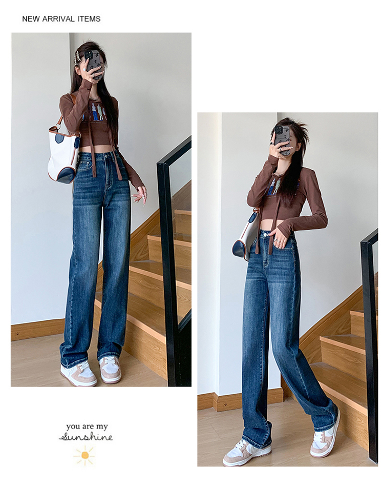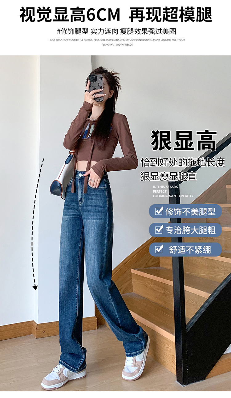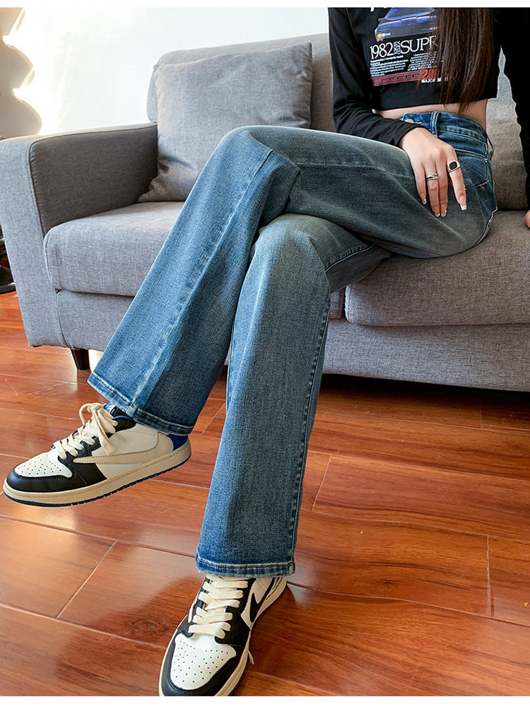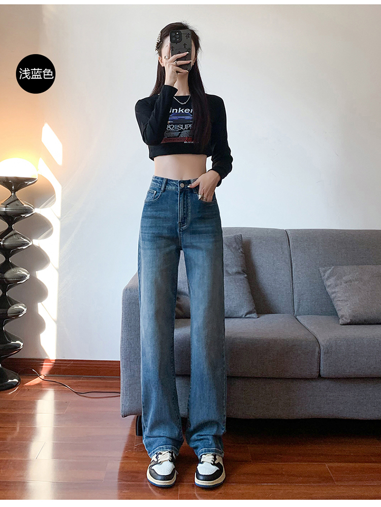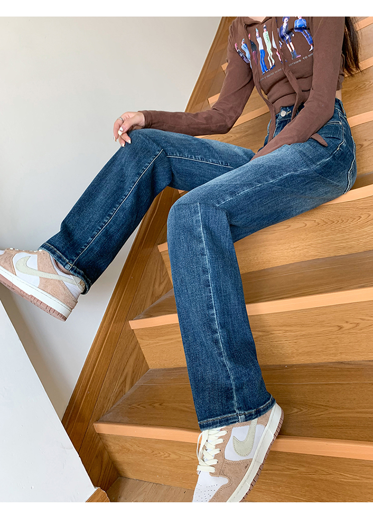 PF3973#高腰显瘦水洗复古蓝直筒牛仔裤女修身百搭弹力烟管裤子