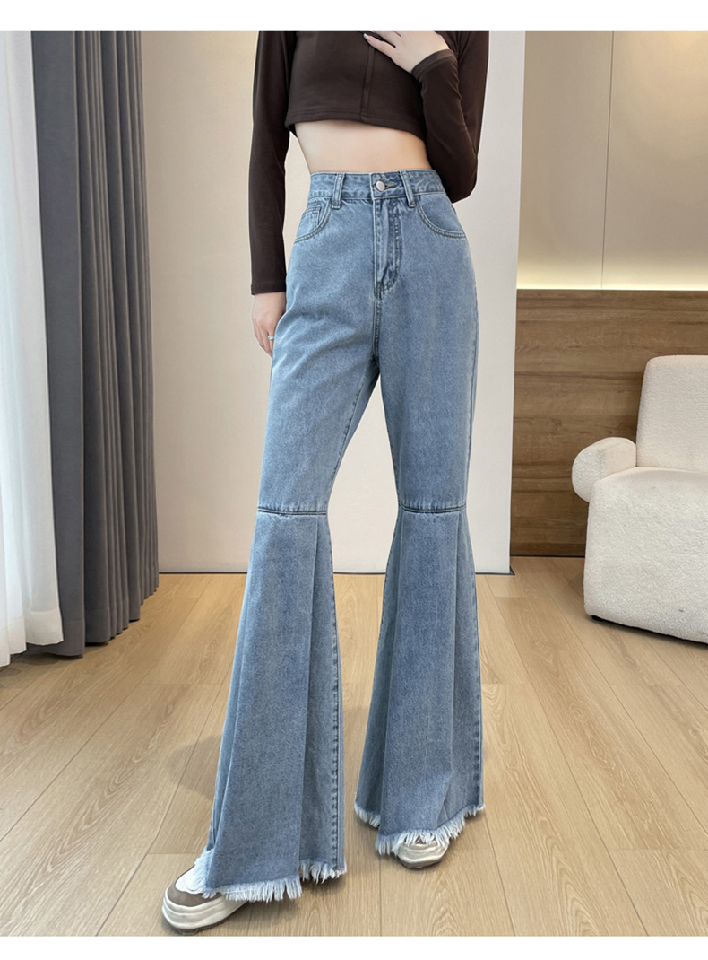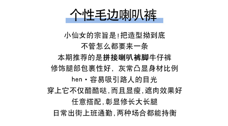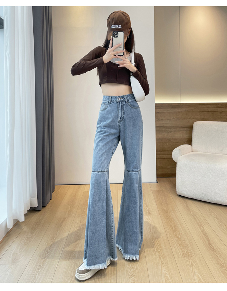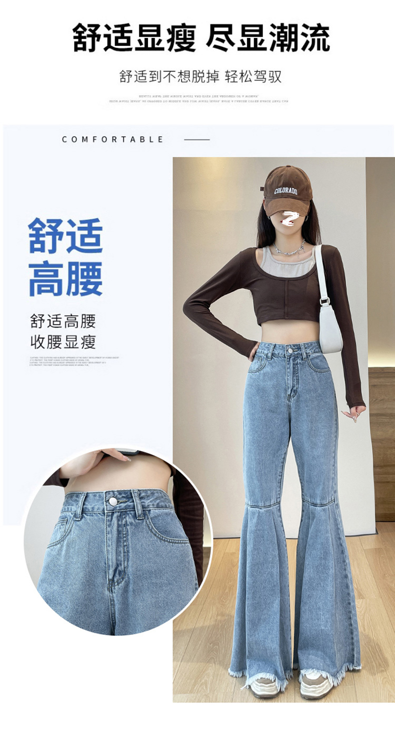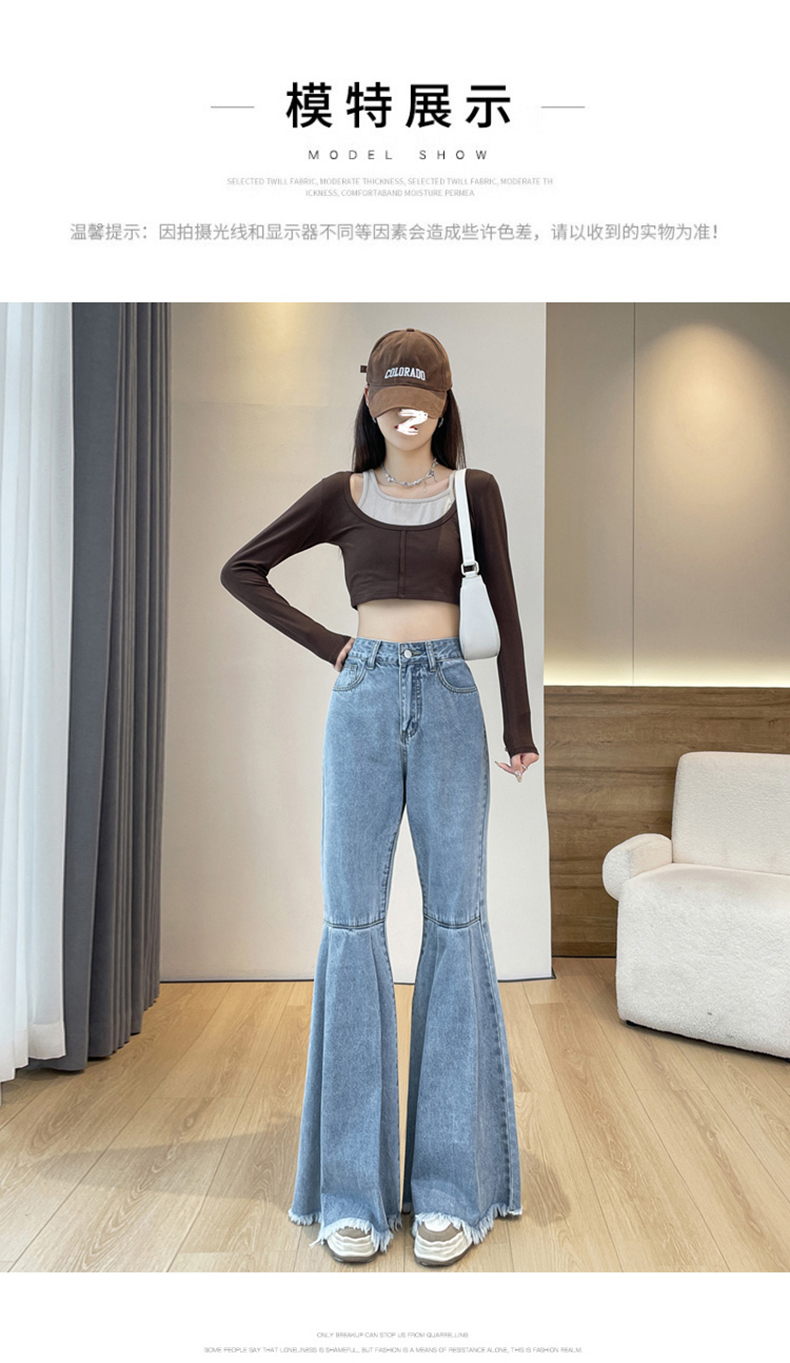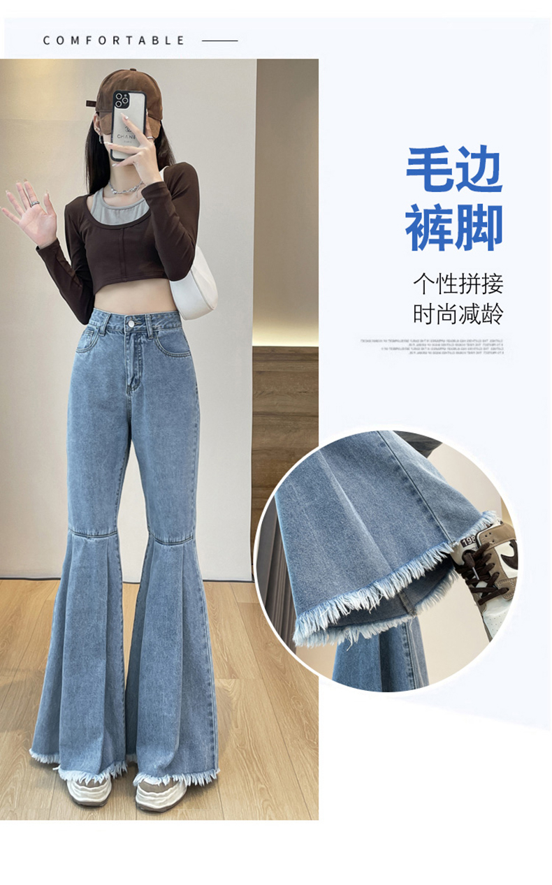 PF3975#四季款折叠式设计微喇叭牛仔裤女高腰显瘦辣妹毛边马蹄裤子