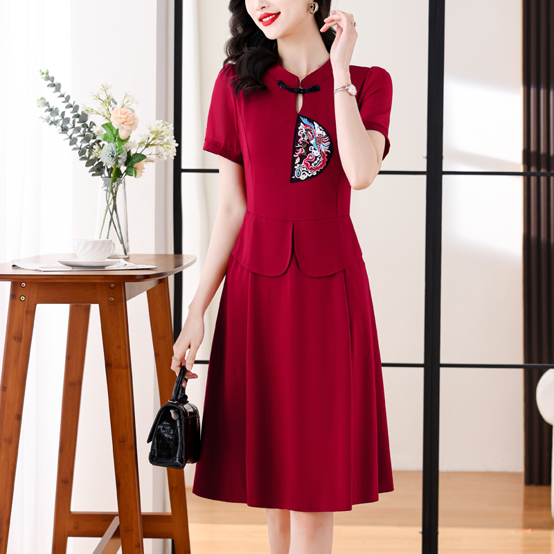 PF4011#新中式复古国风刺绣连衣裙2024夏季高贵气质喜婆婆婚宴装红色裙子