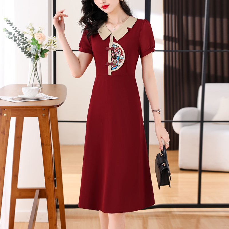 PF4012#新中式国风复古刺绣连衣裙2024新款夏季喜婆婆婚宴装短袖红色裙子