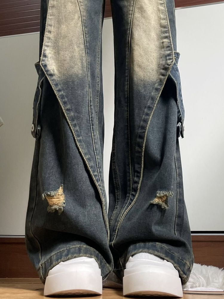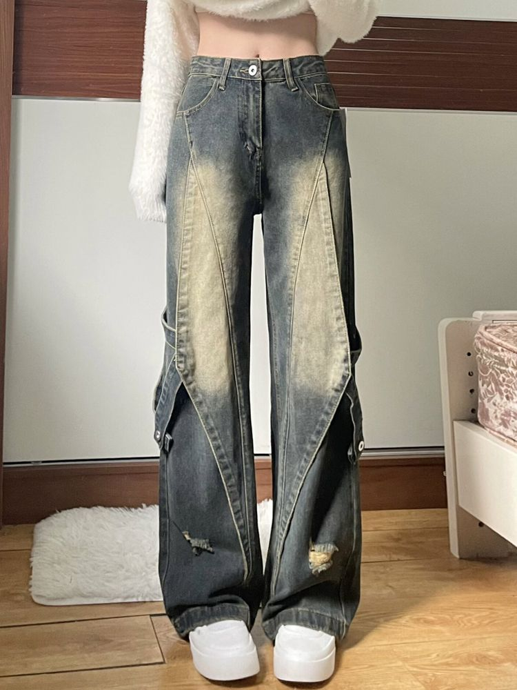 PF4071#美式高街复古工装牛仔裤女春夏新款设计感拼接高腰直筒阔腿裤子潮