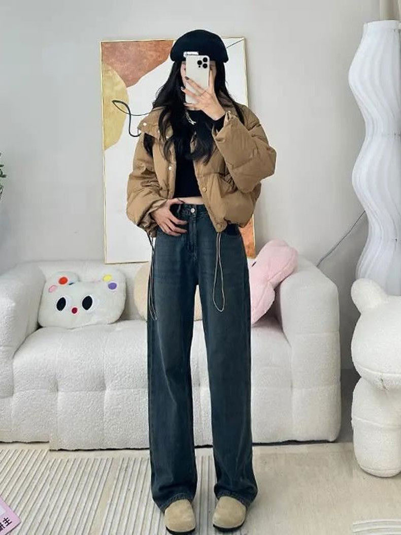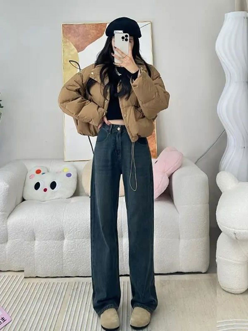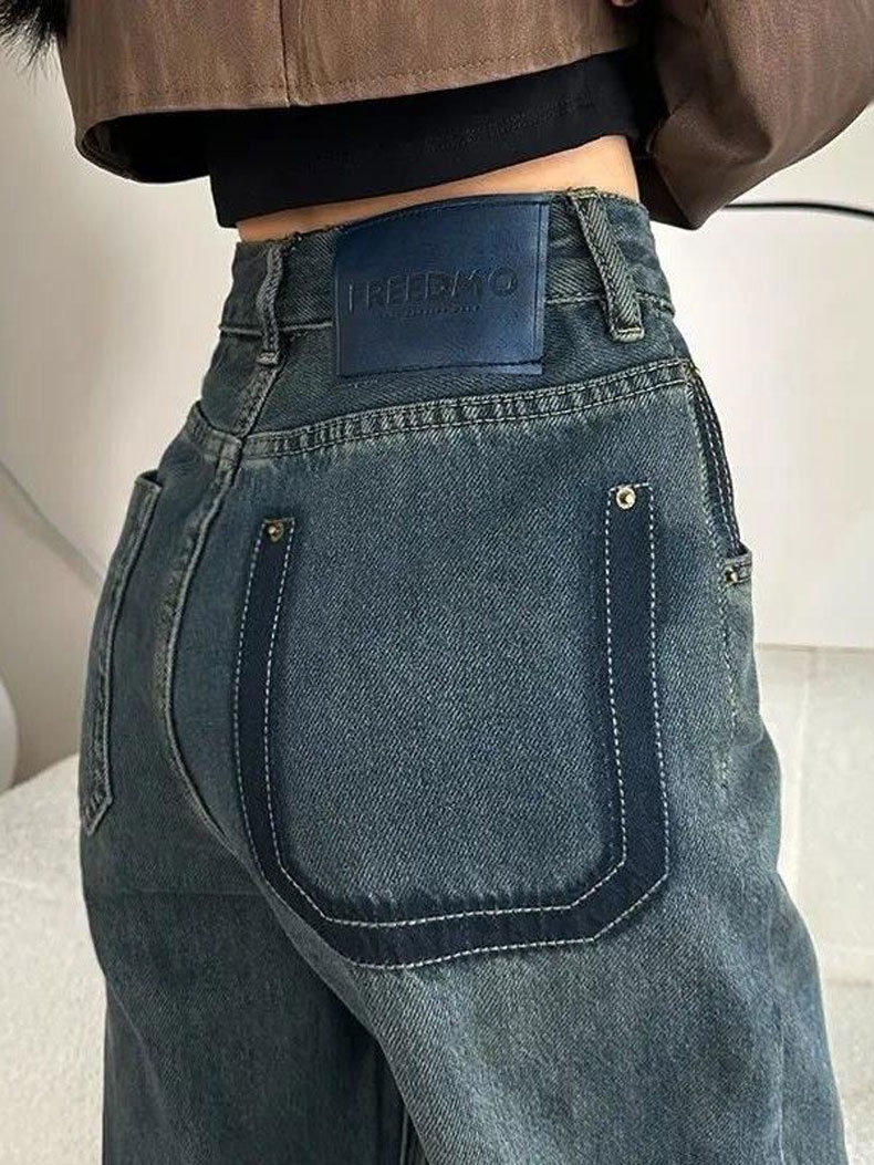 PF4077#U字口袋皮牌设计遮肉阔腿牛仔裤女宽松小众撞色复古直筒拖地裤子
