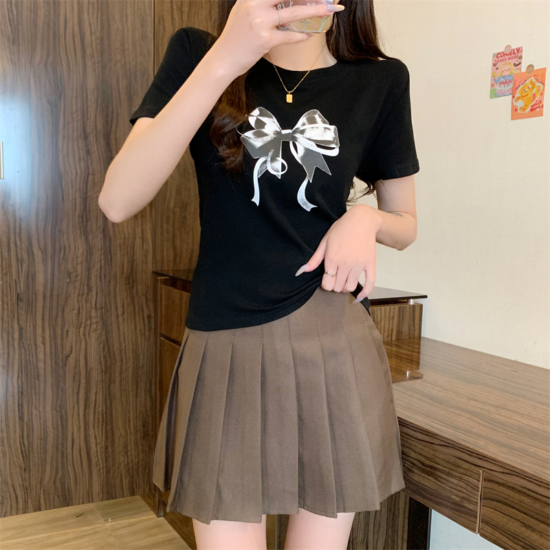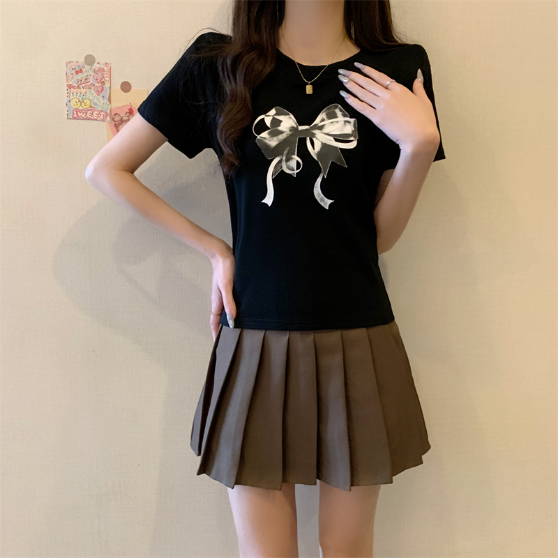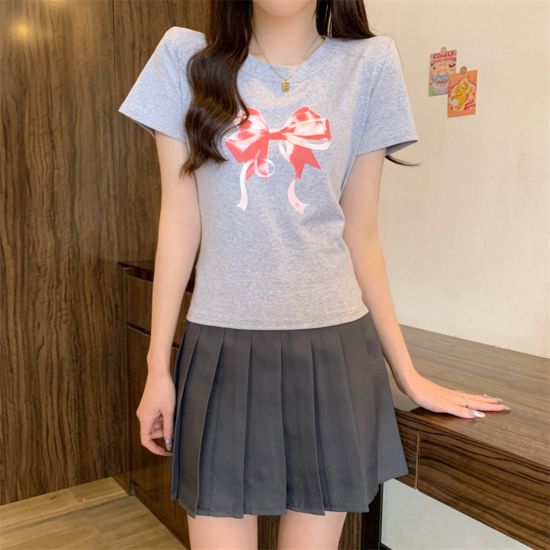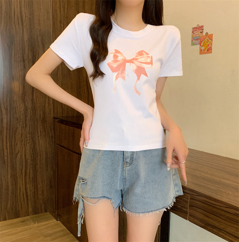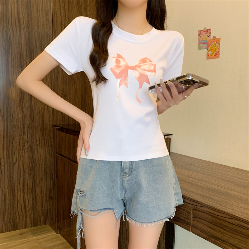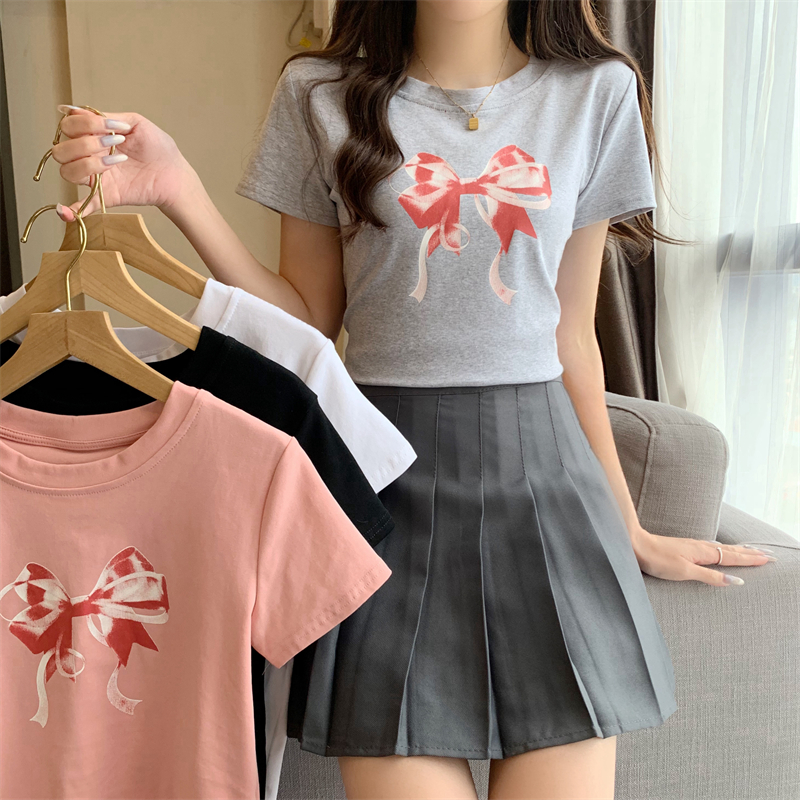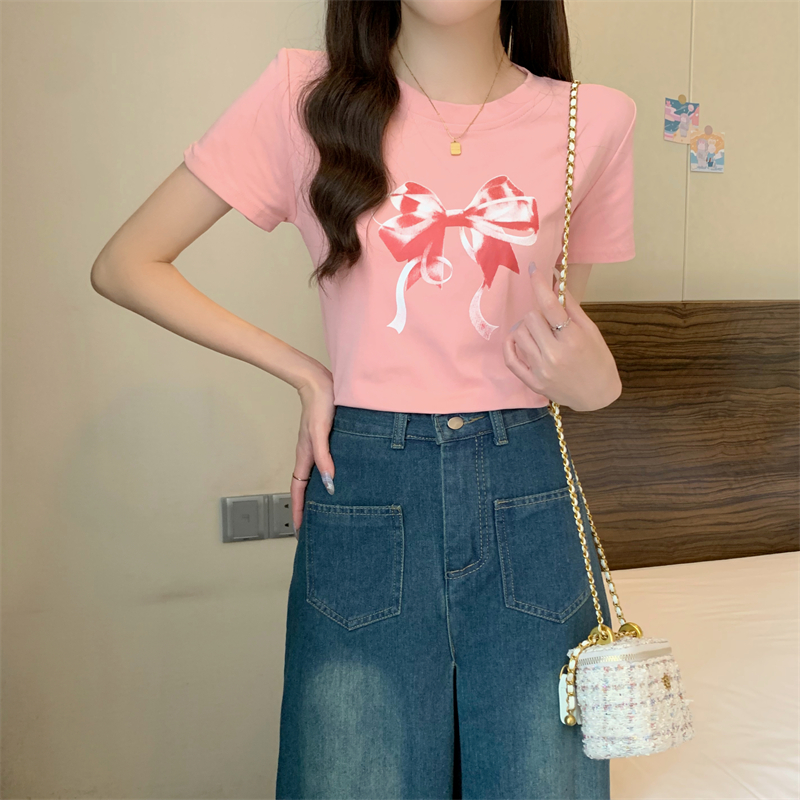PF4084#新款蝴蝶结印花圆领休闲T恤短袖打底衫