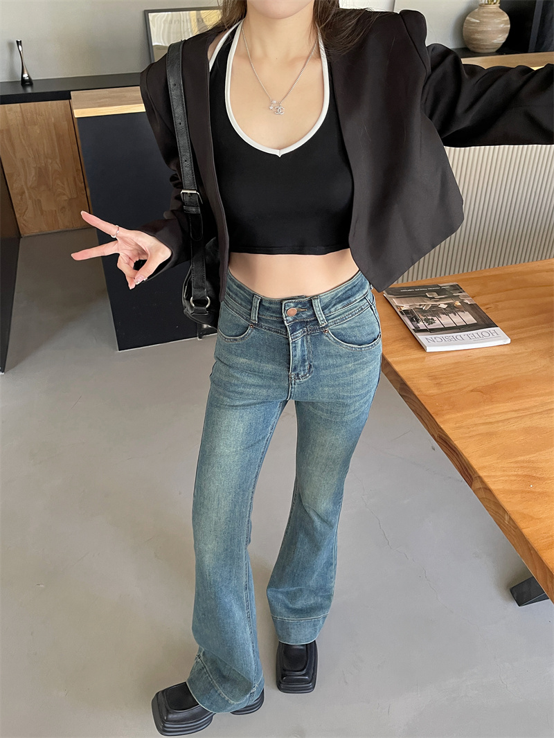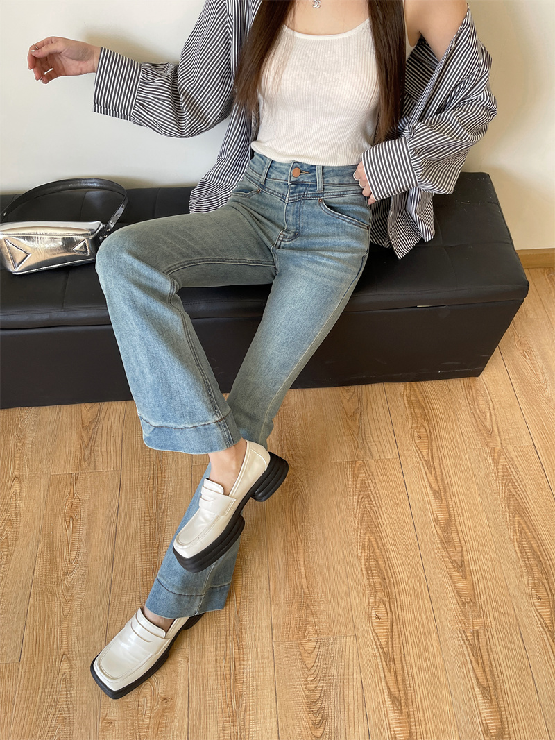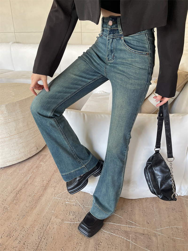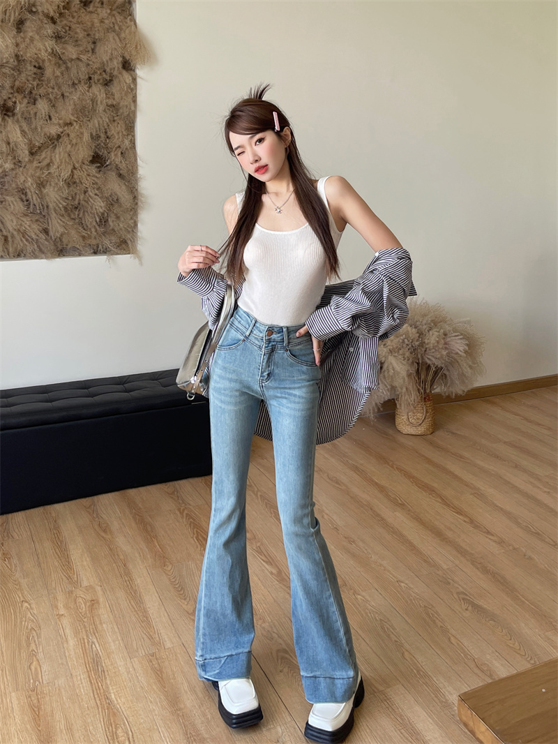 PF4142#复古百搭水洗浅蓝牛仔裤女高腰新款拖地弹力喇叭裤长裤女裝批發 服裝批發 服飾貨源