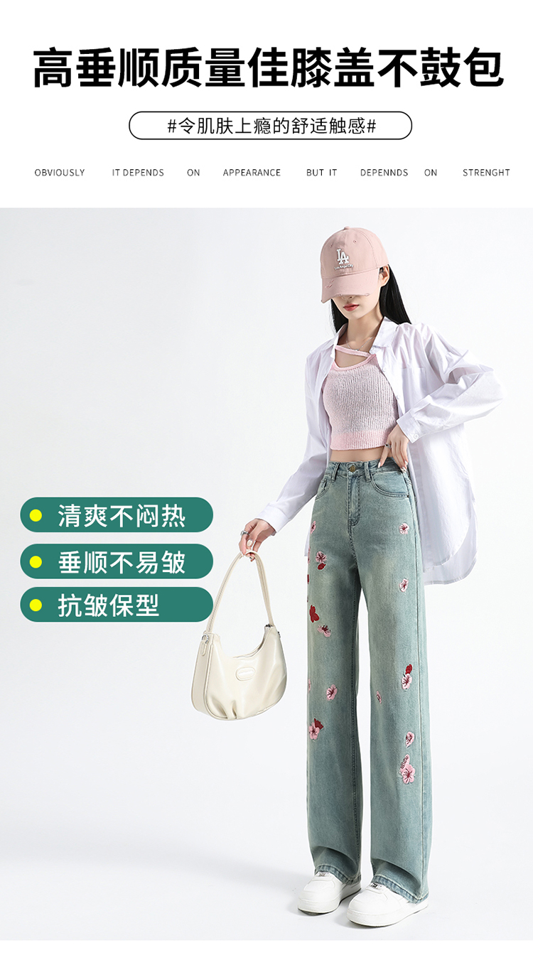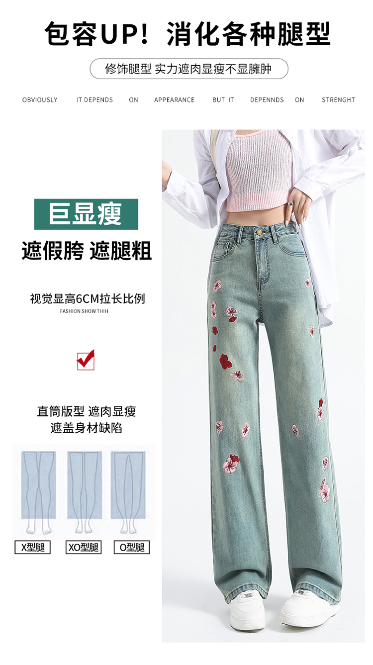 PF4280#新中式国风刺绣直筒牛仔裤女2024春季设计感高腰显瘦阔腿裤子女裝批發 服裝批發 服裝貨源