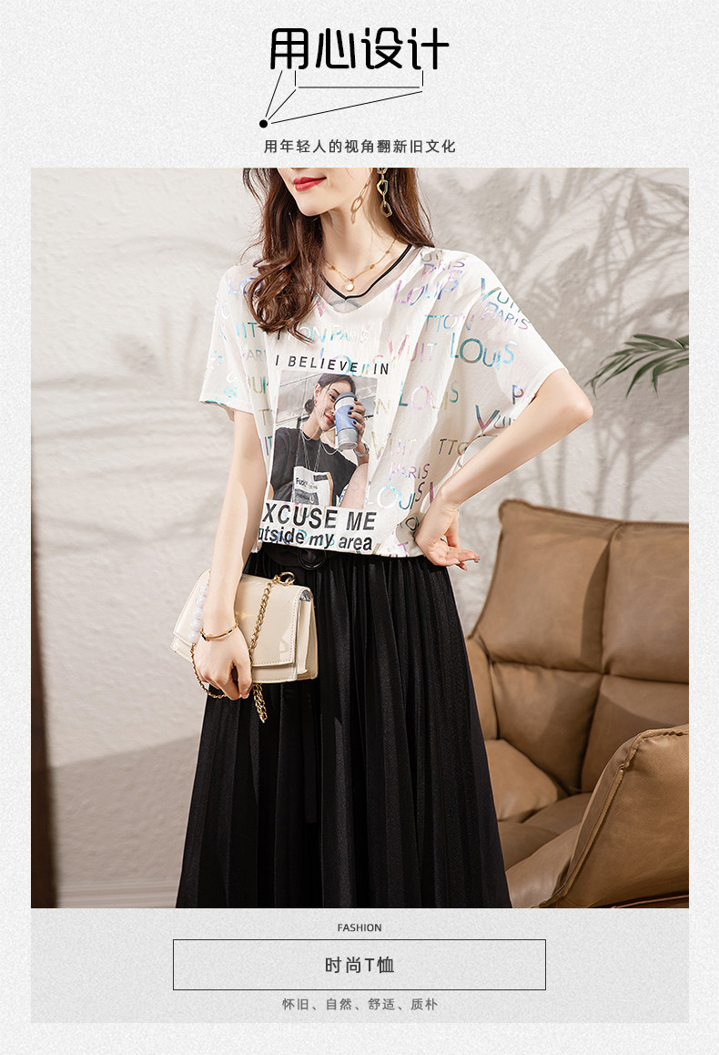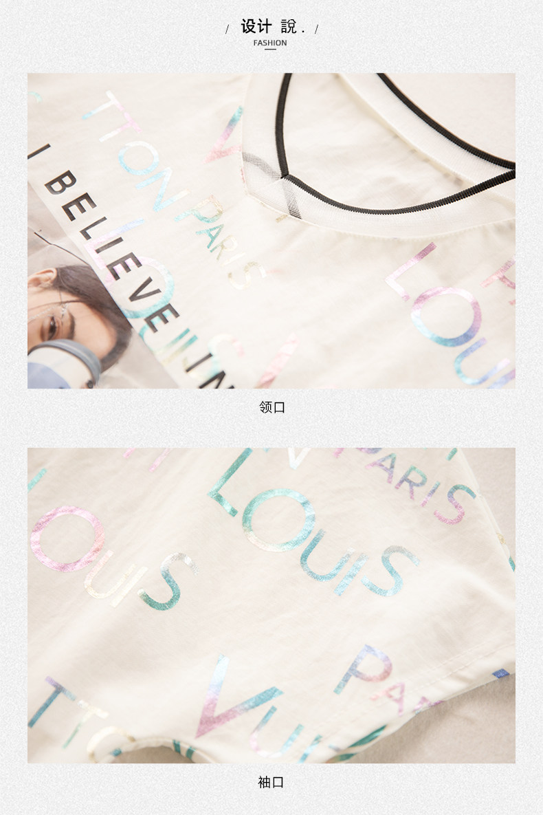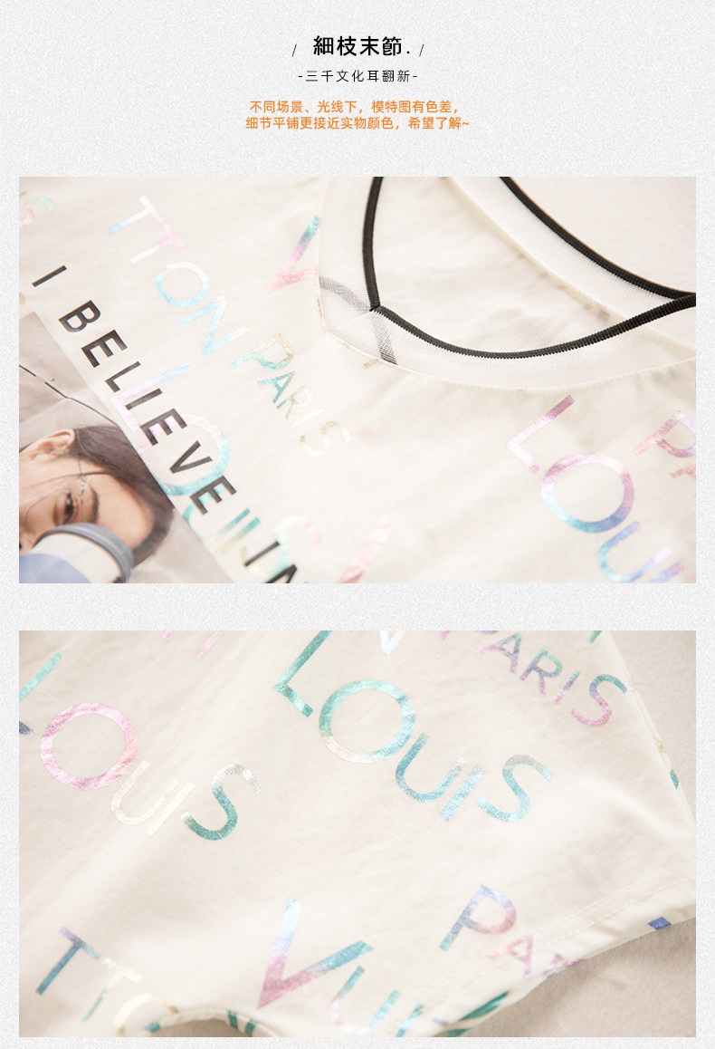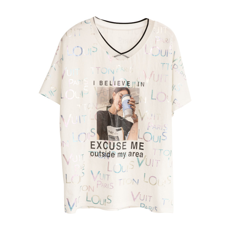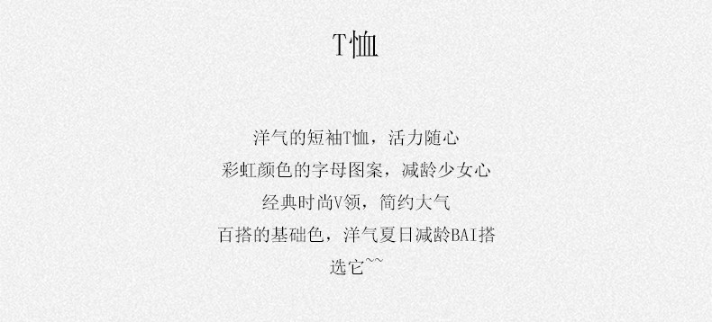 PF4310#夏季新款宽松V领短袖彩色字母印花T恤上衣女女裝批發 服裝批發 服裝貨源