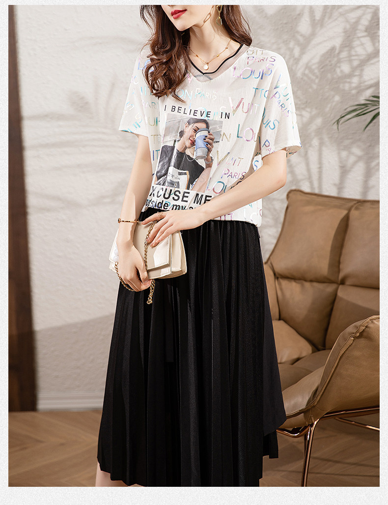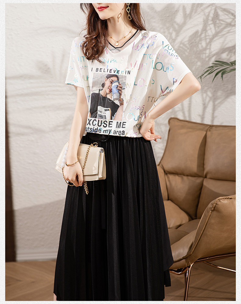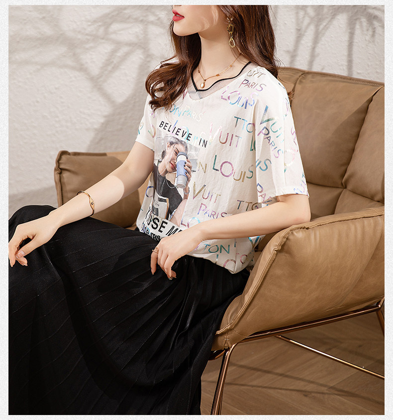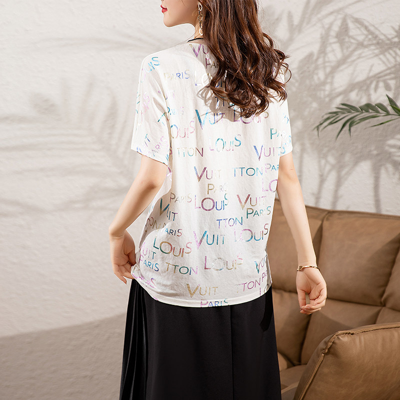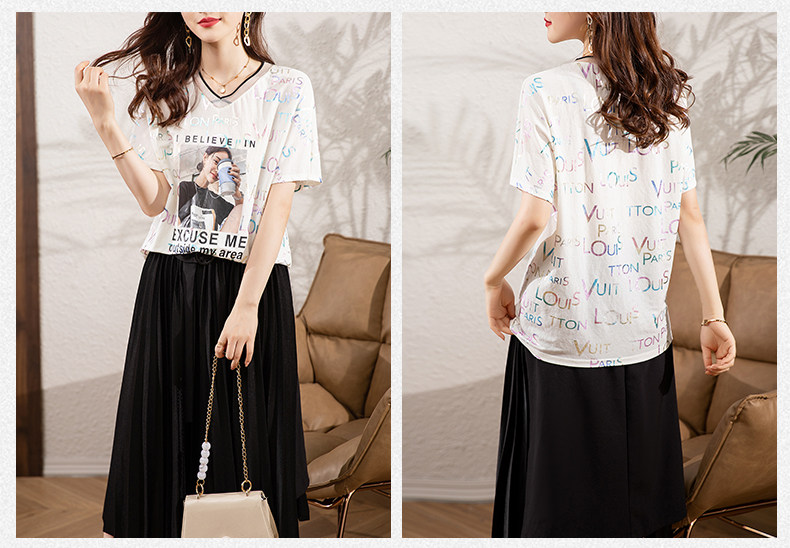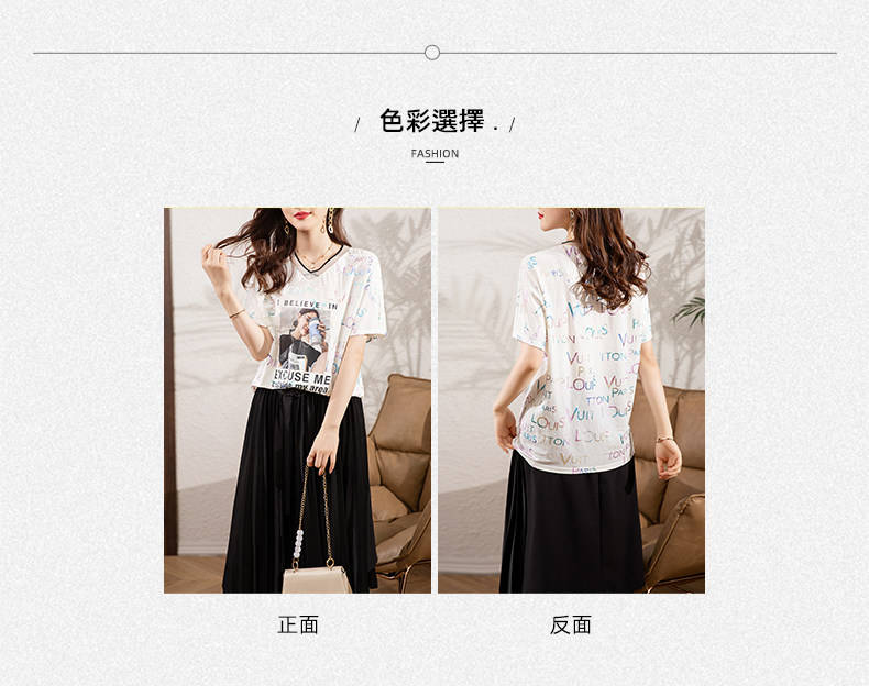 PF4310#夏季新款宽松V领短袖彩色字母印花T恤上衣女女裝批發 服裝批發 服裝貨源