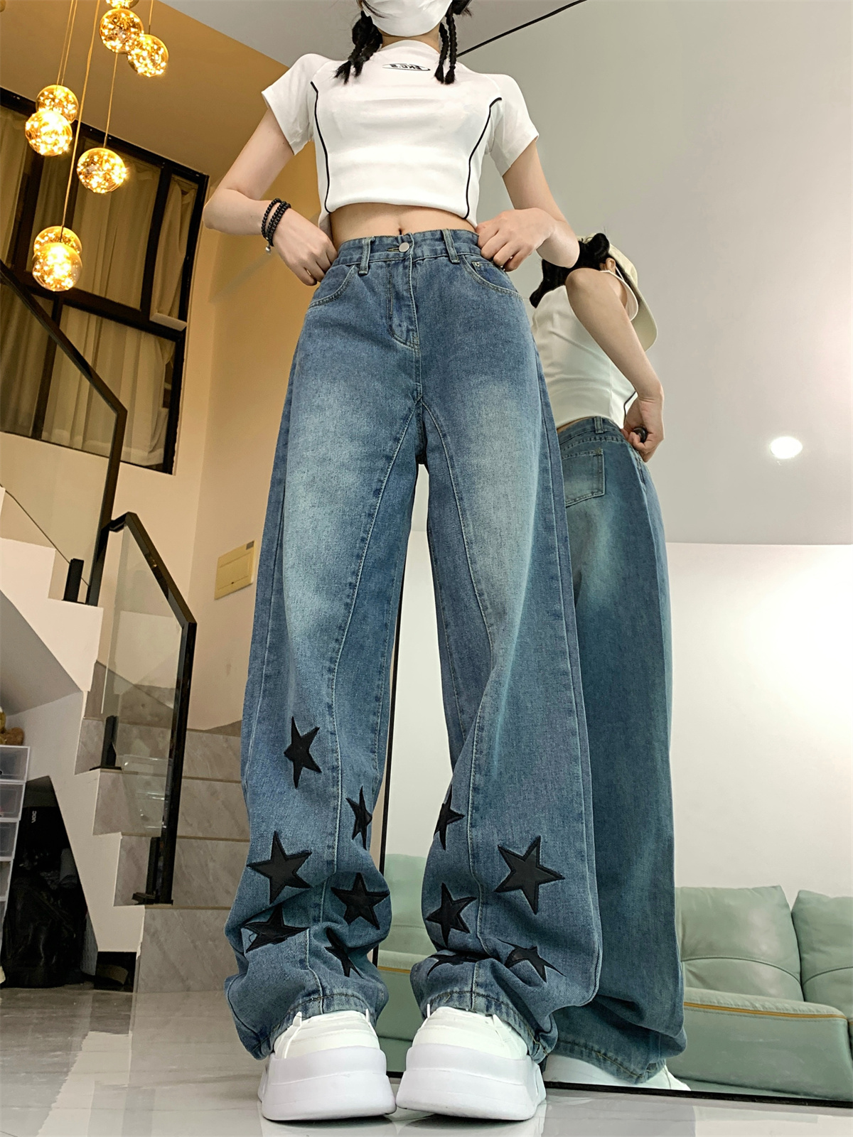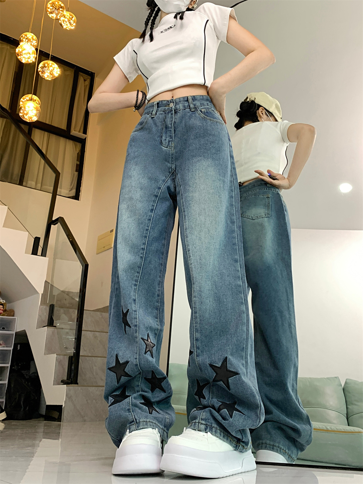 PF4317#复古星星牛仔裤女高腰ins显瘦阔腿裤子女裝批發 服裝批發 服裝貨源