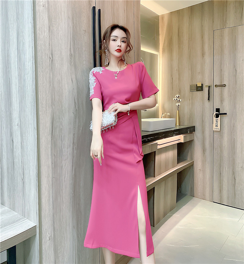 PF4346#夏装高级感重工钉珠气质宴会礼服修身鱼尾开叉优雅连衣裙女裝批發 服裝批發 服裝貨源