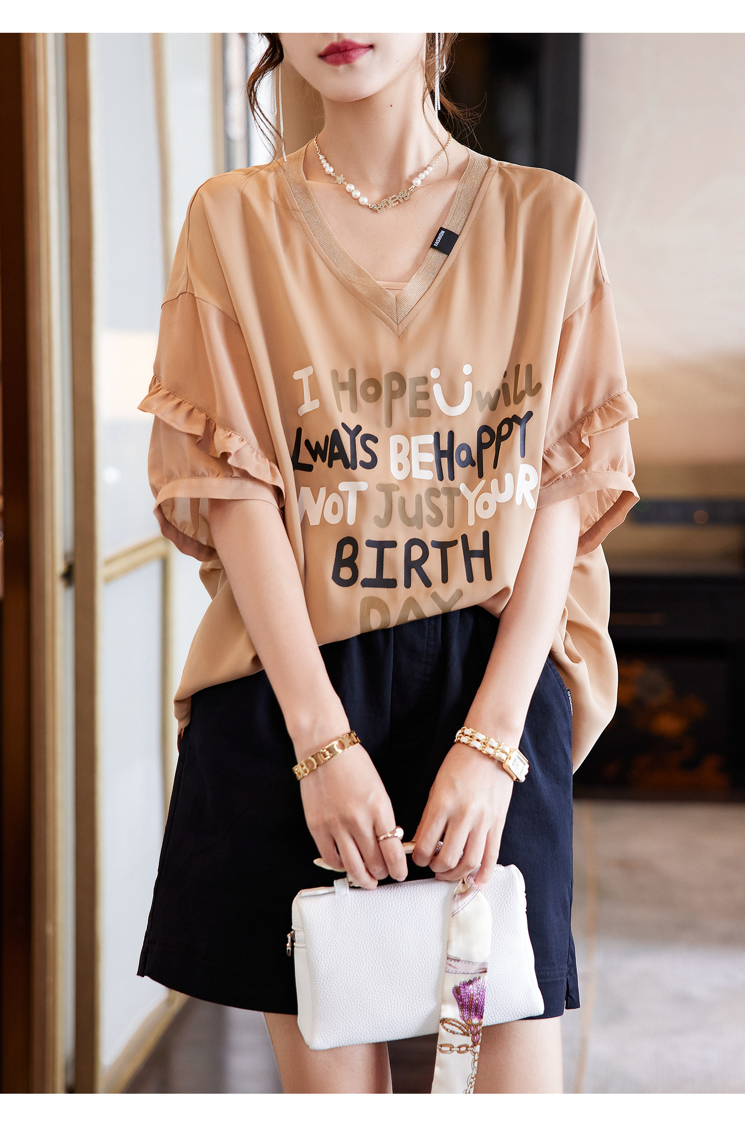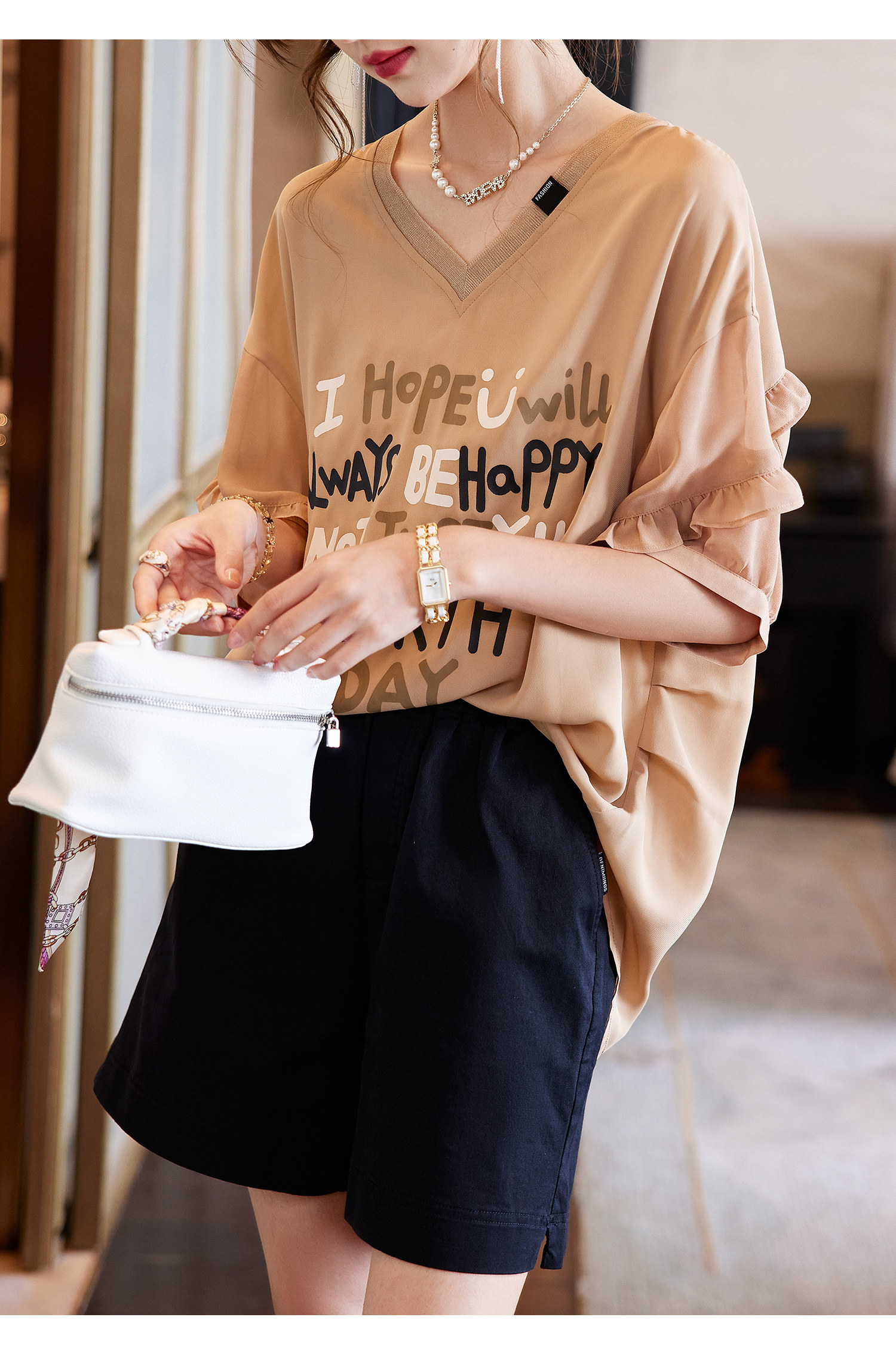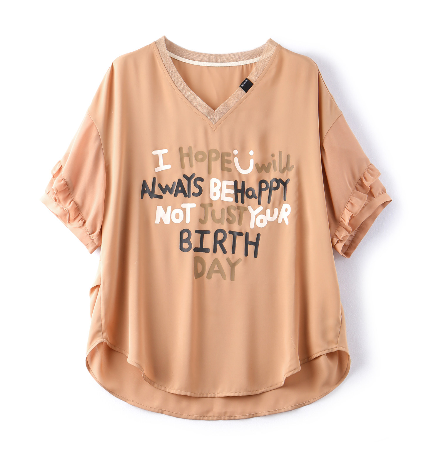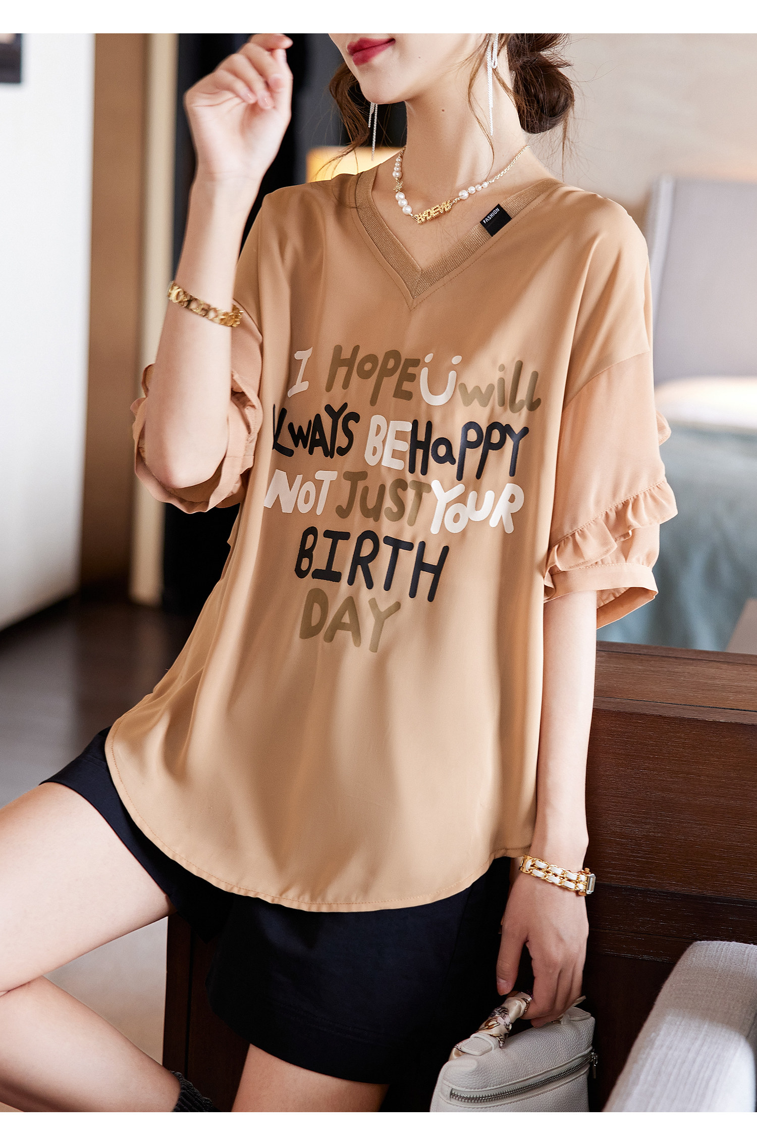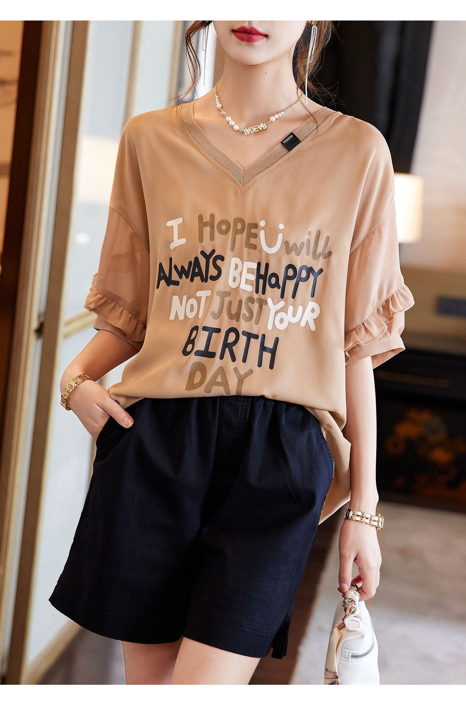 PF4641#宽松大码新款V领字母印花短袖雪纺衫上衣胖妹妹女装夏季女裝批發 服裝批發 服裝貨源