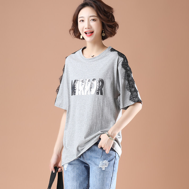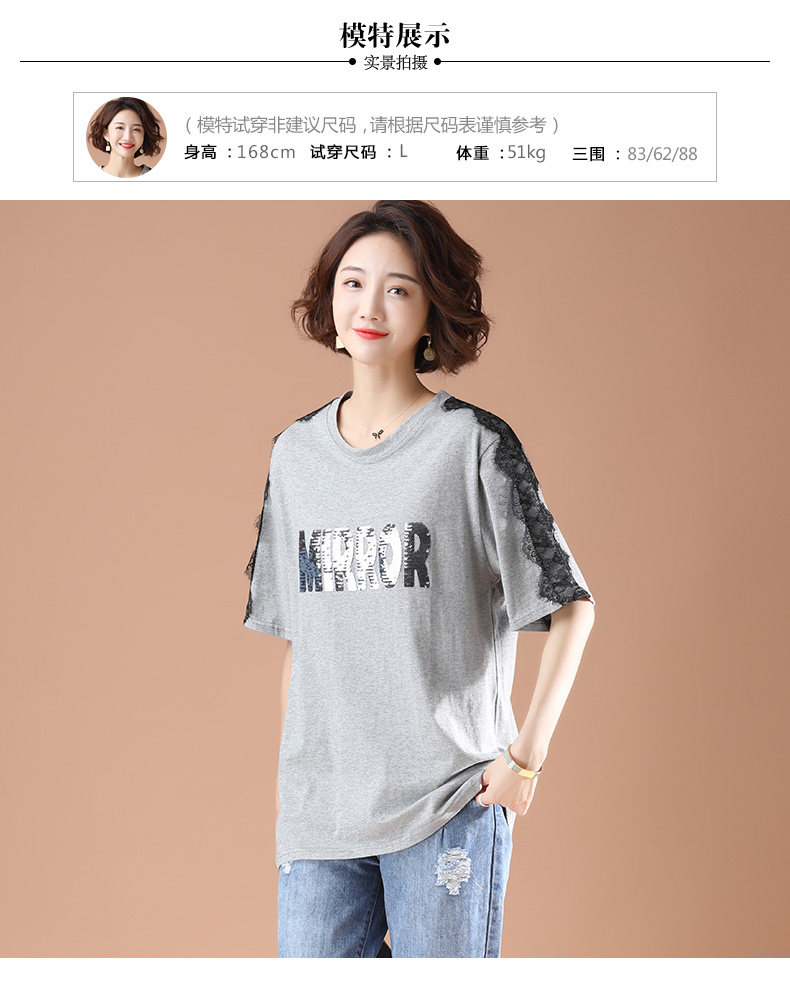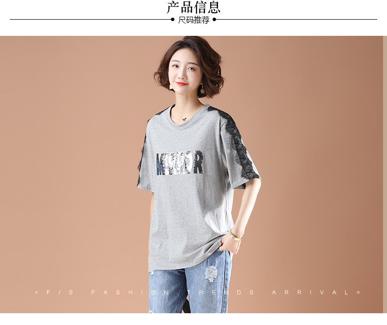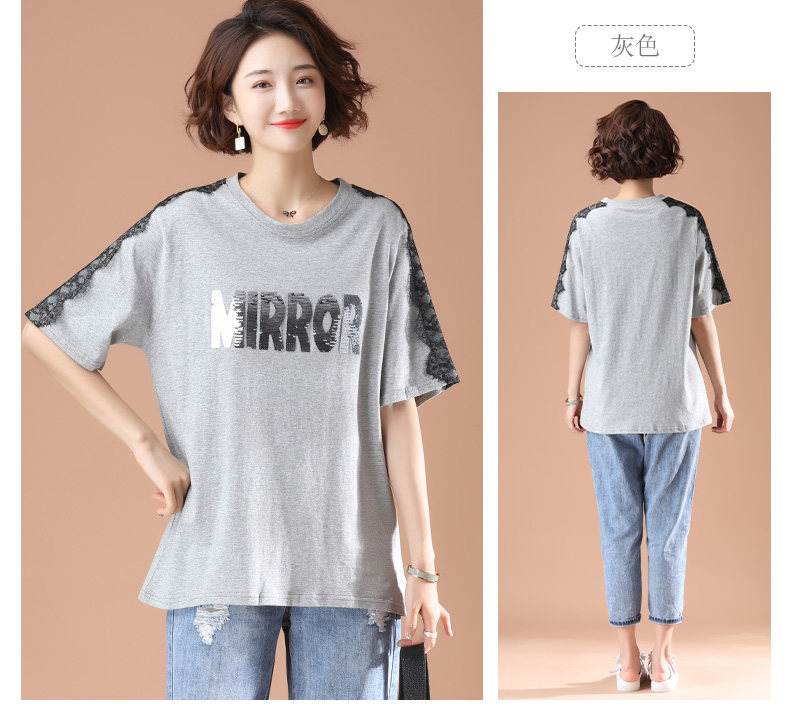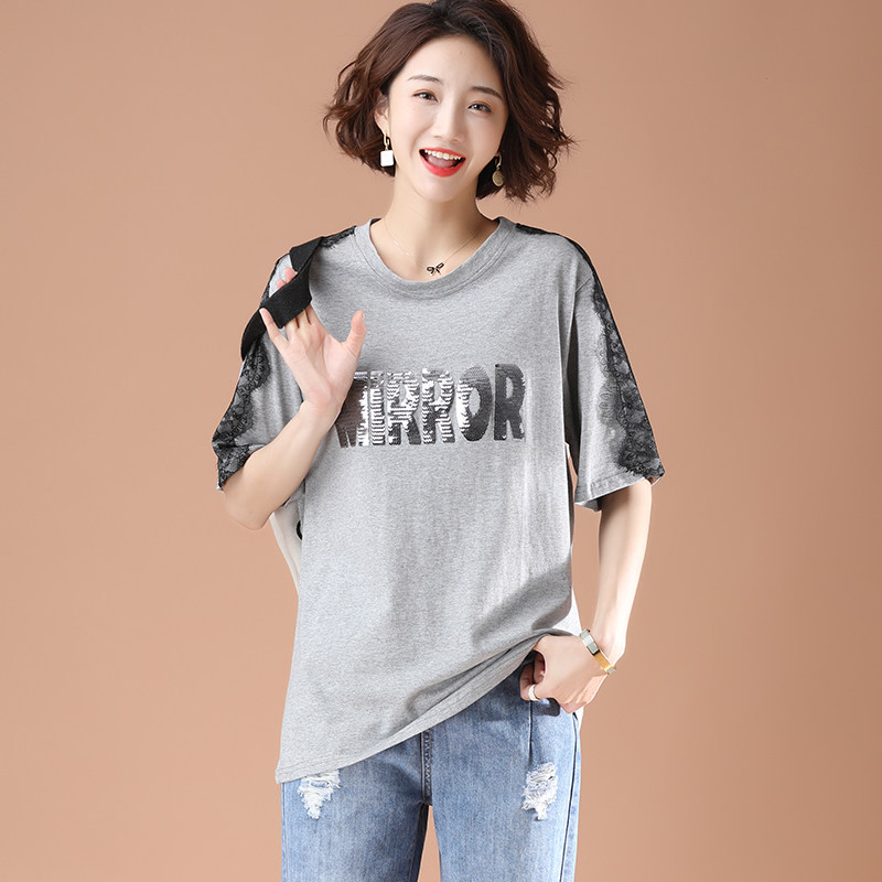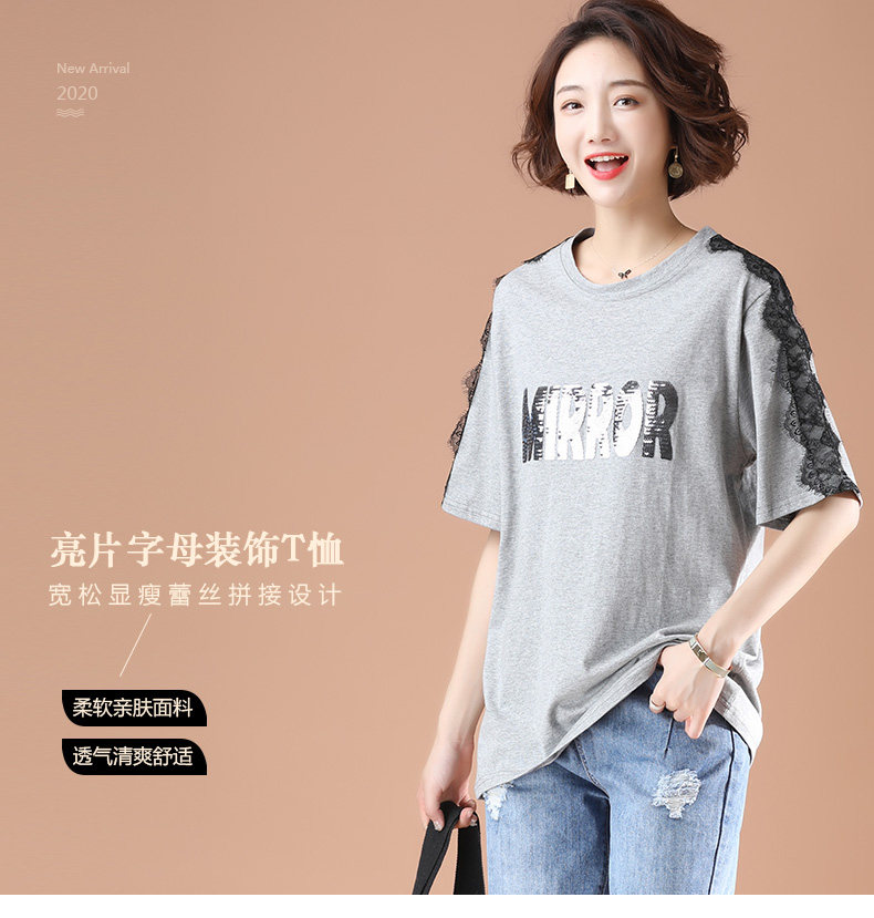 PF5850#夏季宽松显瘦拼接蕾丝短袖大码T恤字母绣花上衣女女裝貨源服裝批發