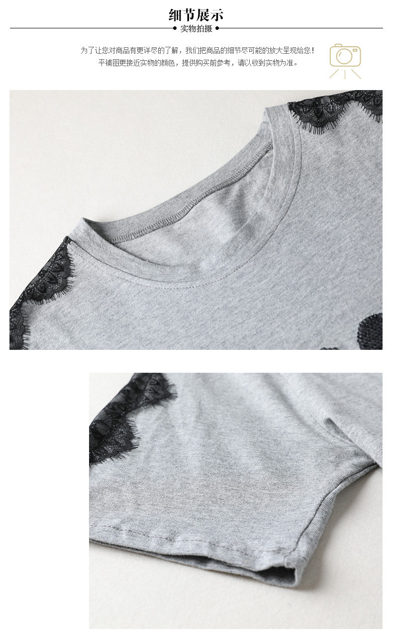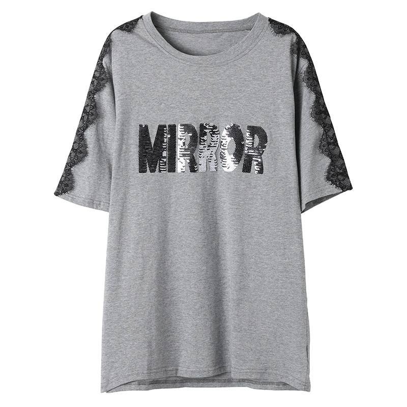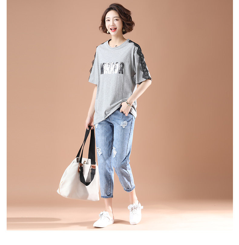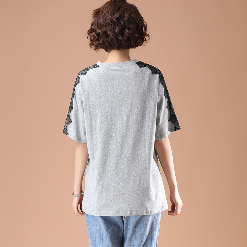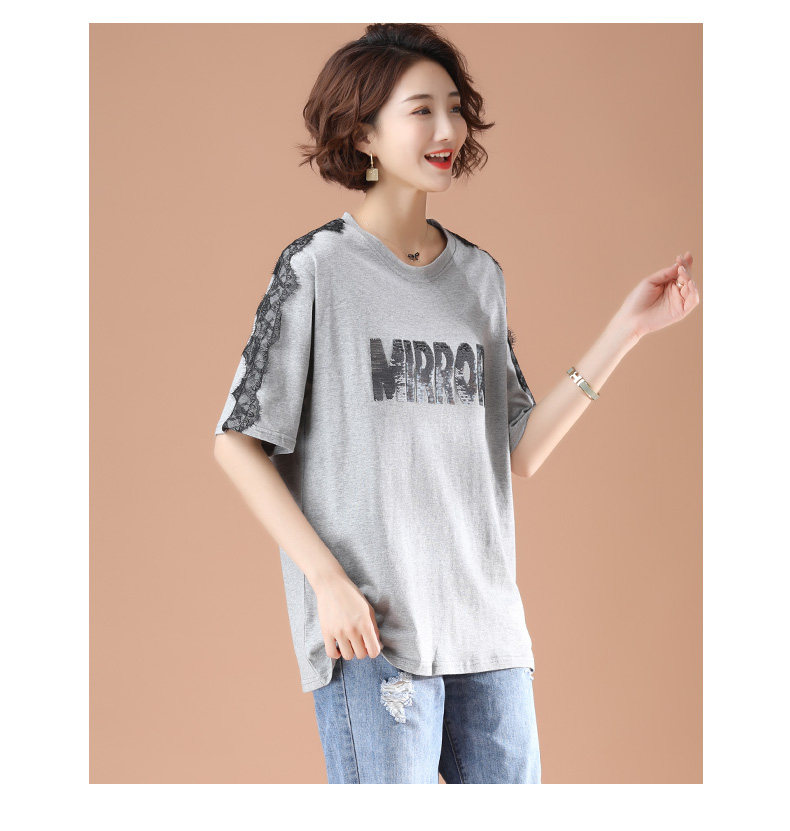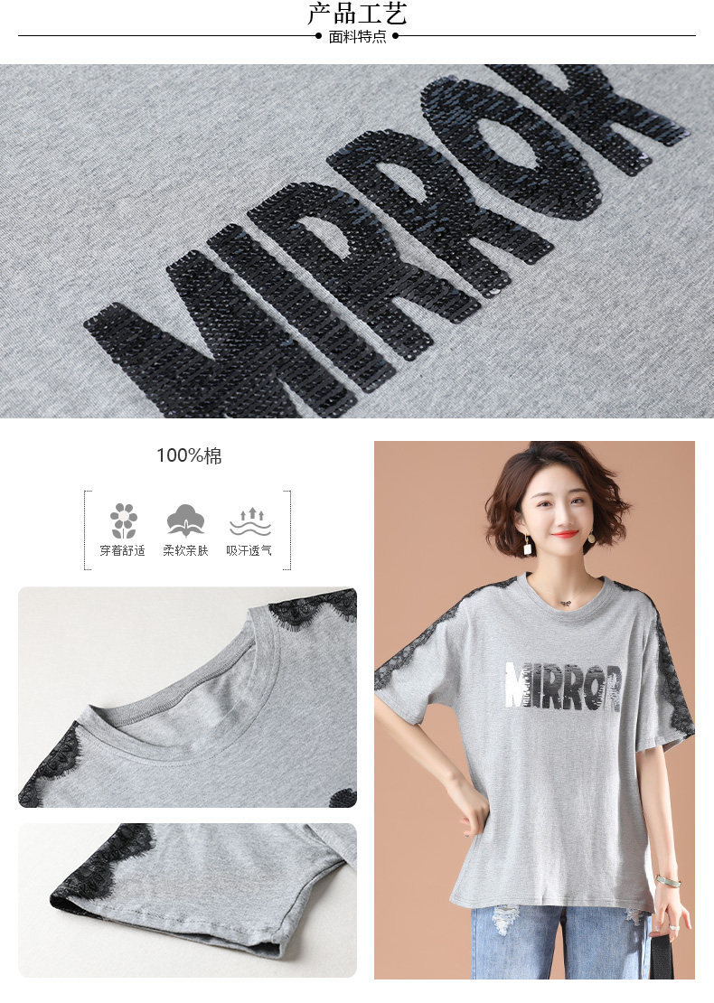 PF5850#夏季宽松显瘦拼接蕾丝短袖大码T恤字母绣花上衣女女裝貨源服裝批發
