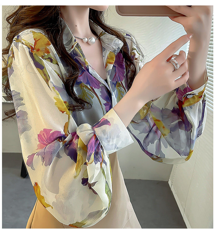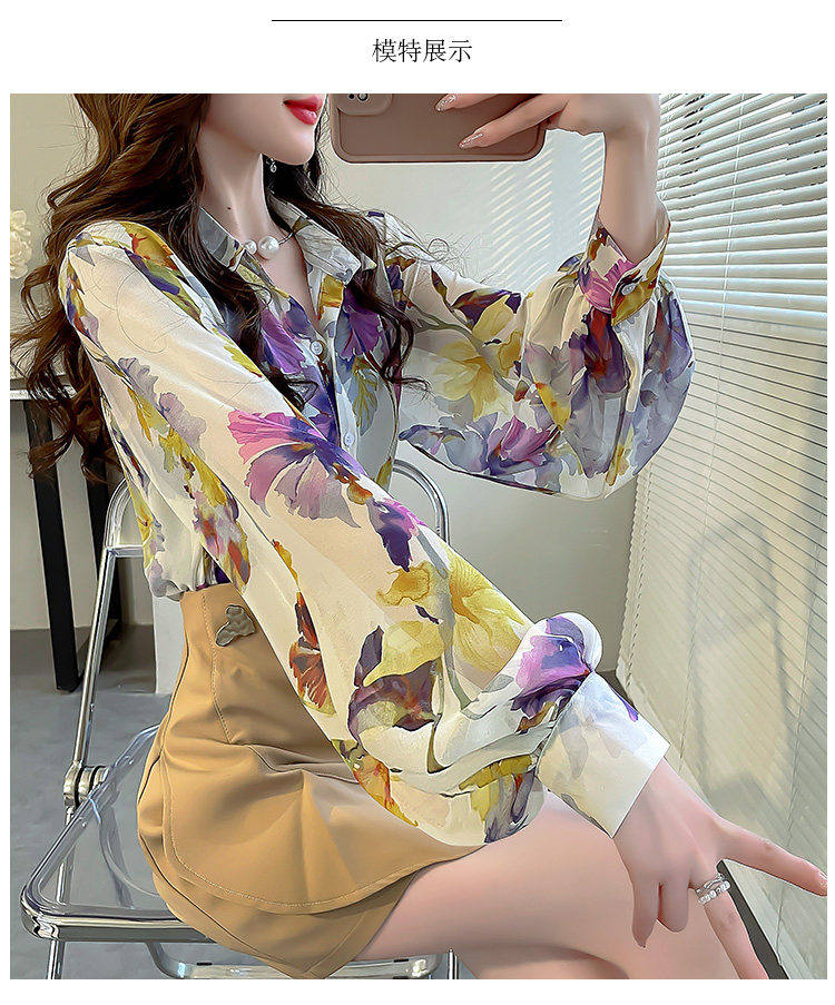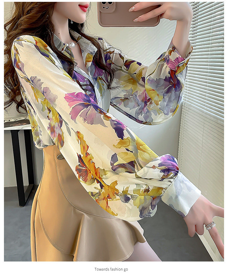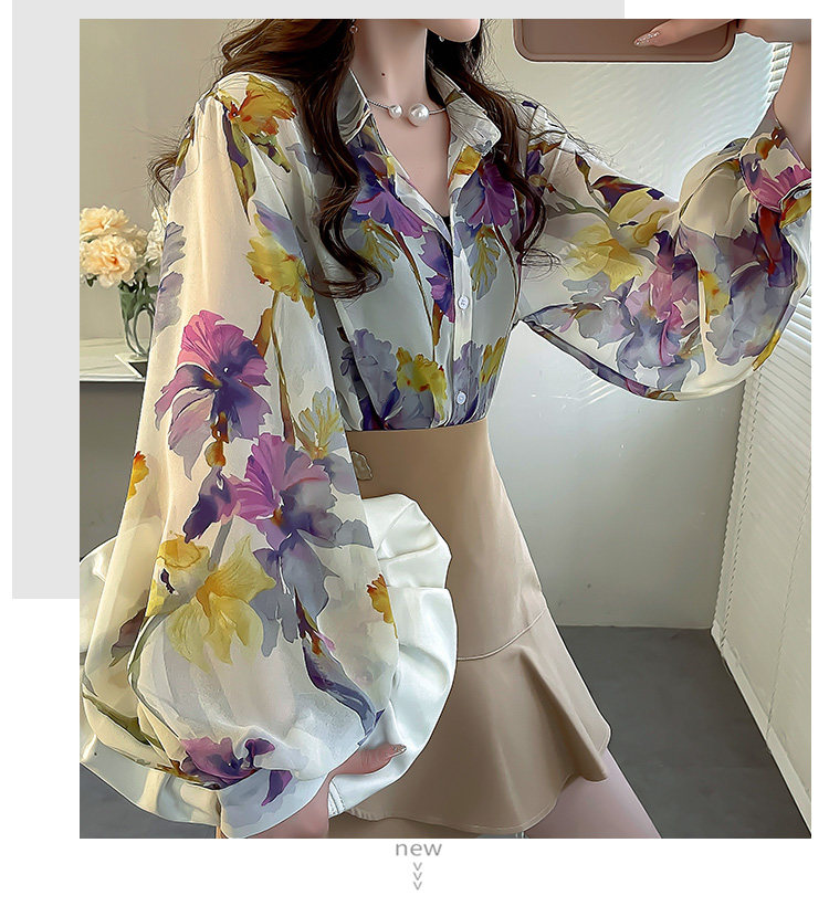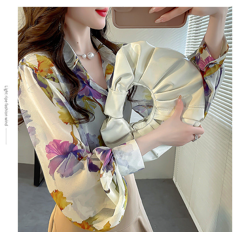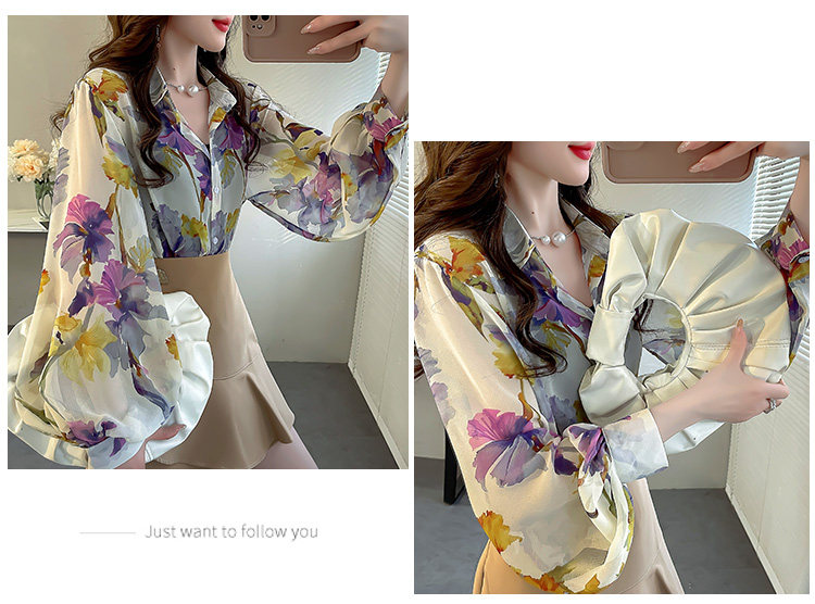 PF7857#别致印花衬衣今年流行漂亮小衫时尚气质雪纺宽松灯笼袖衬衫女上衣女裝貨源服裝批發