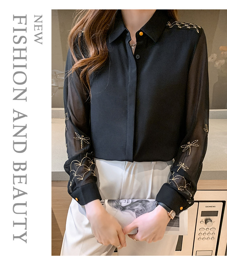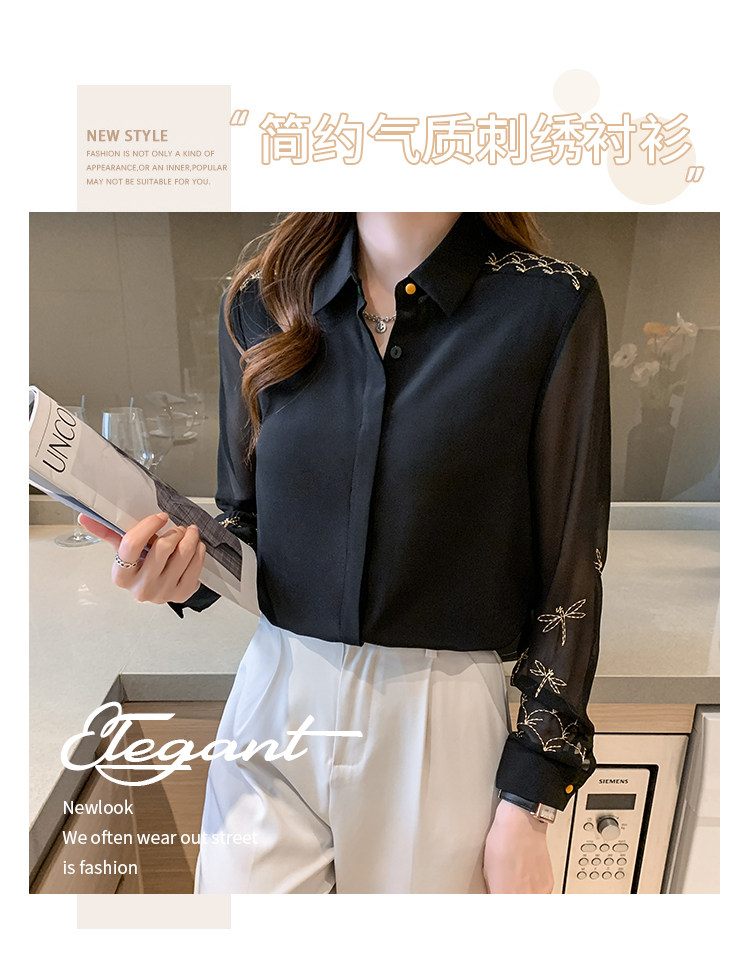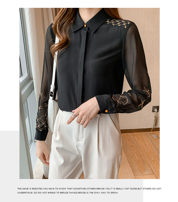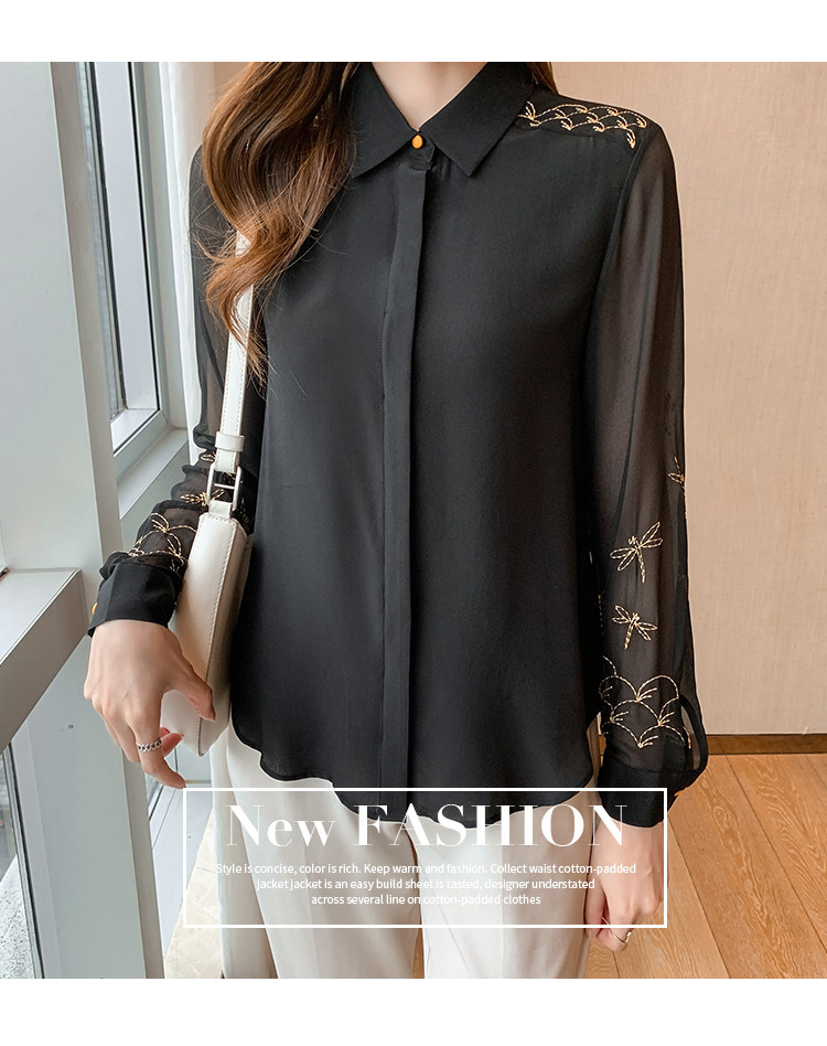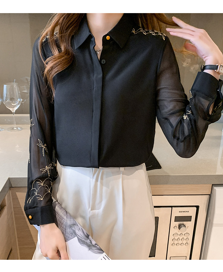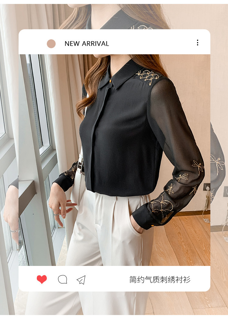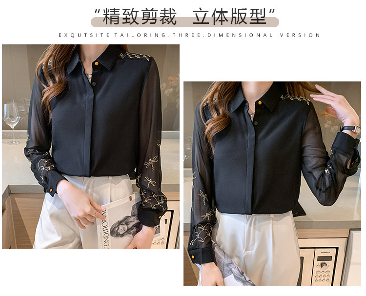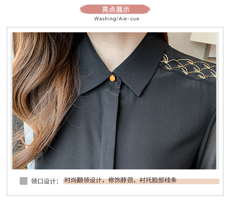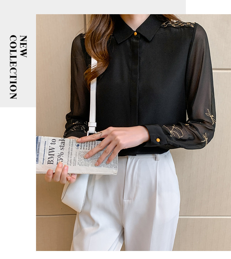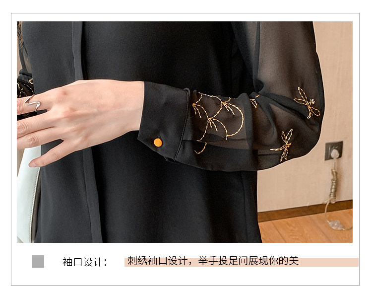 PF7862#黑色高端雪纺衬衣 新款时尚绣花洋气上衣女女裝貨源服裝批發