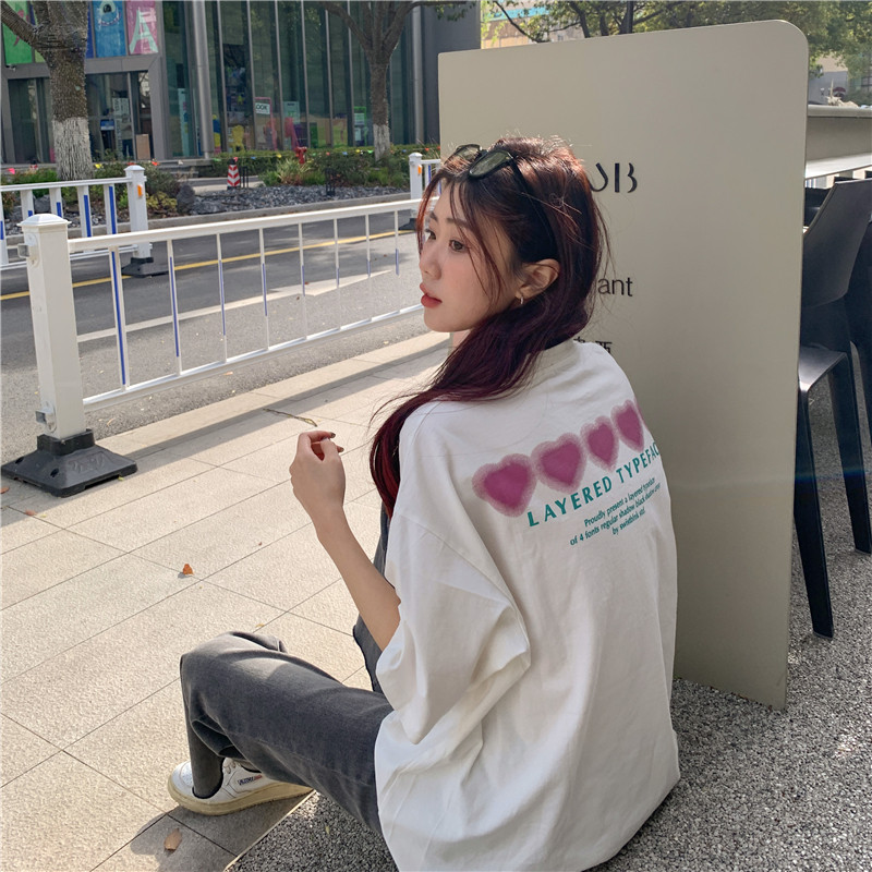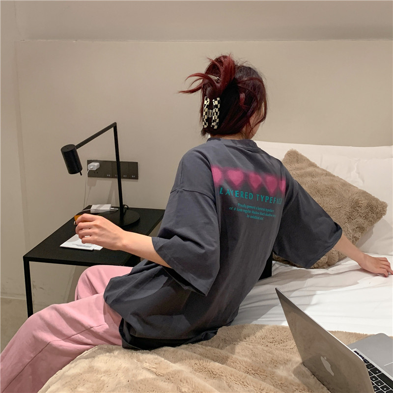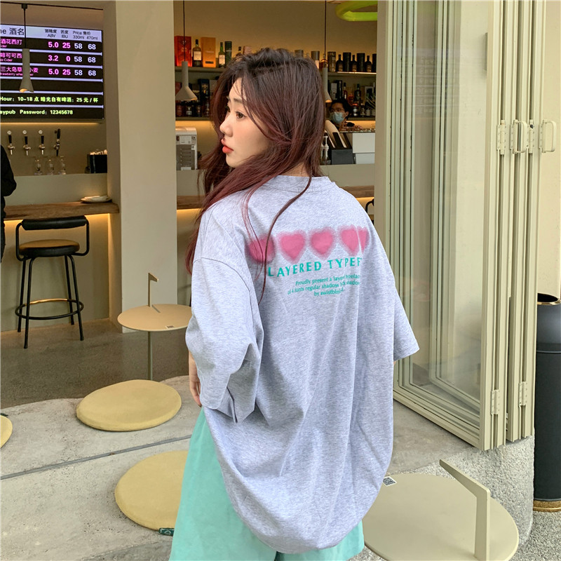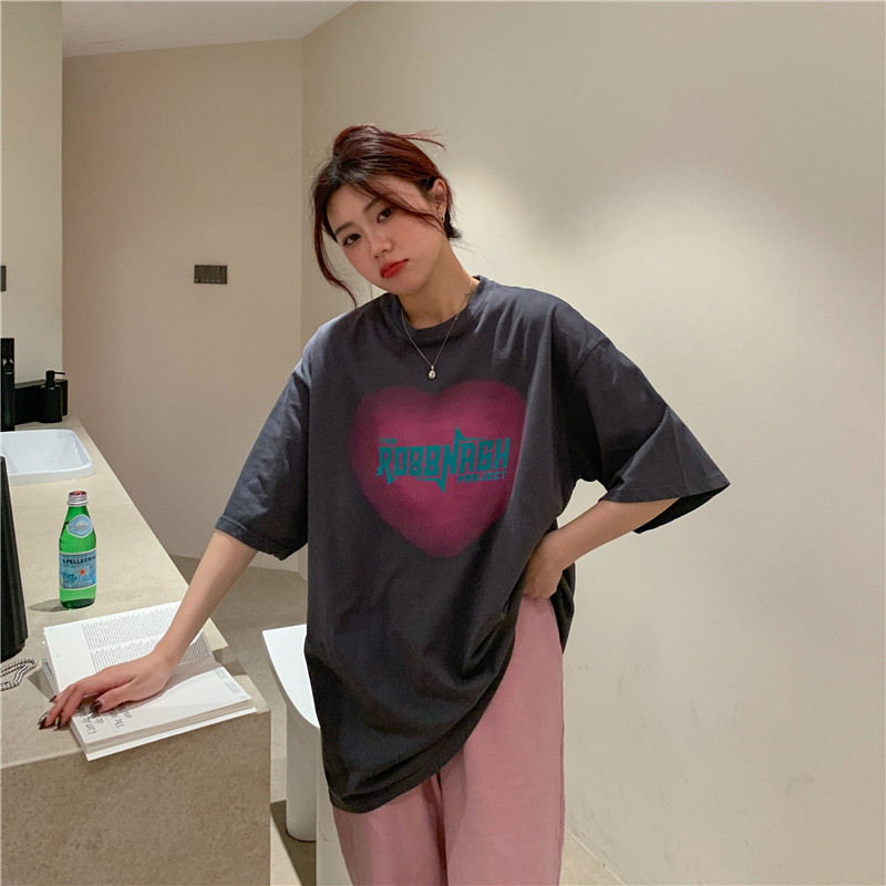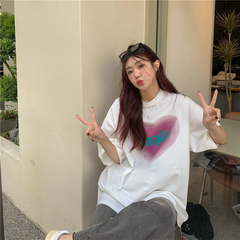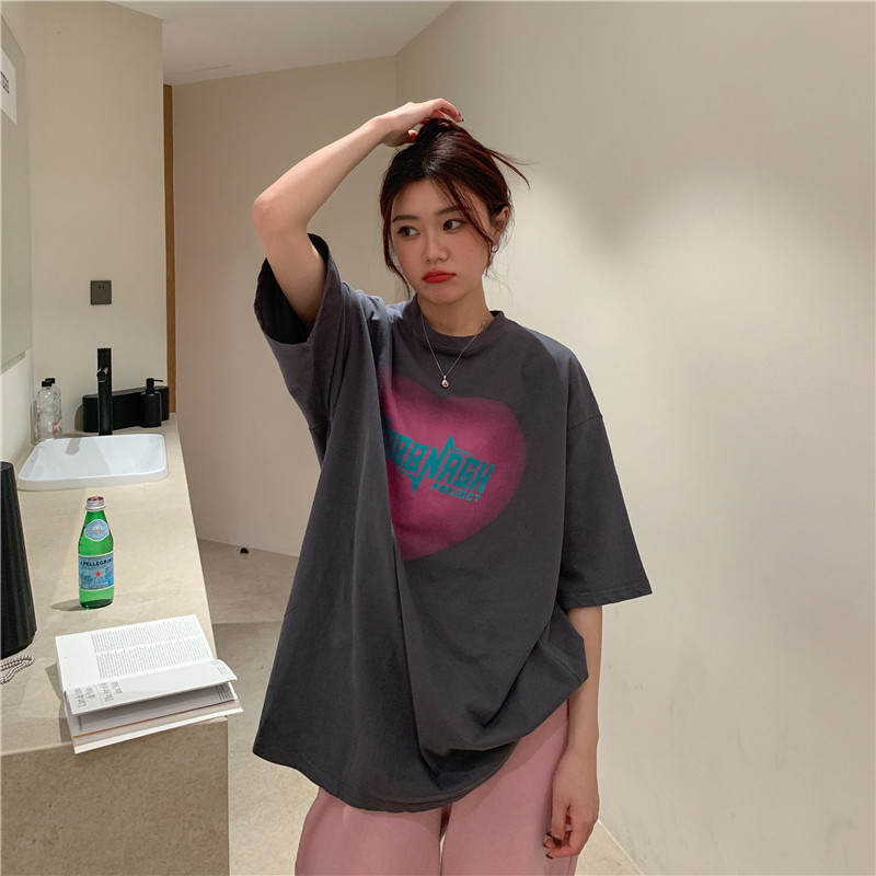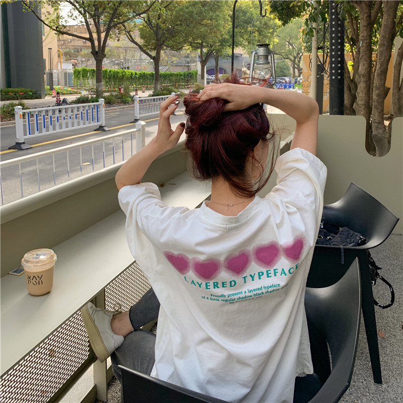 PF8118#纯棉连肩后包领宽松爱心印花中长款短袖t恤女女裝貨源服裝批發