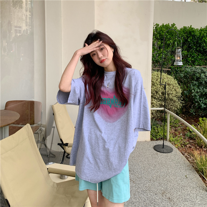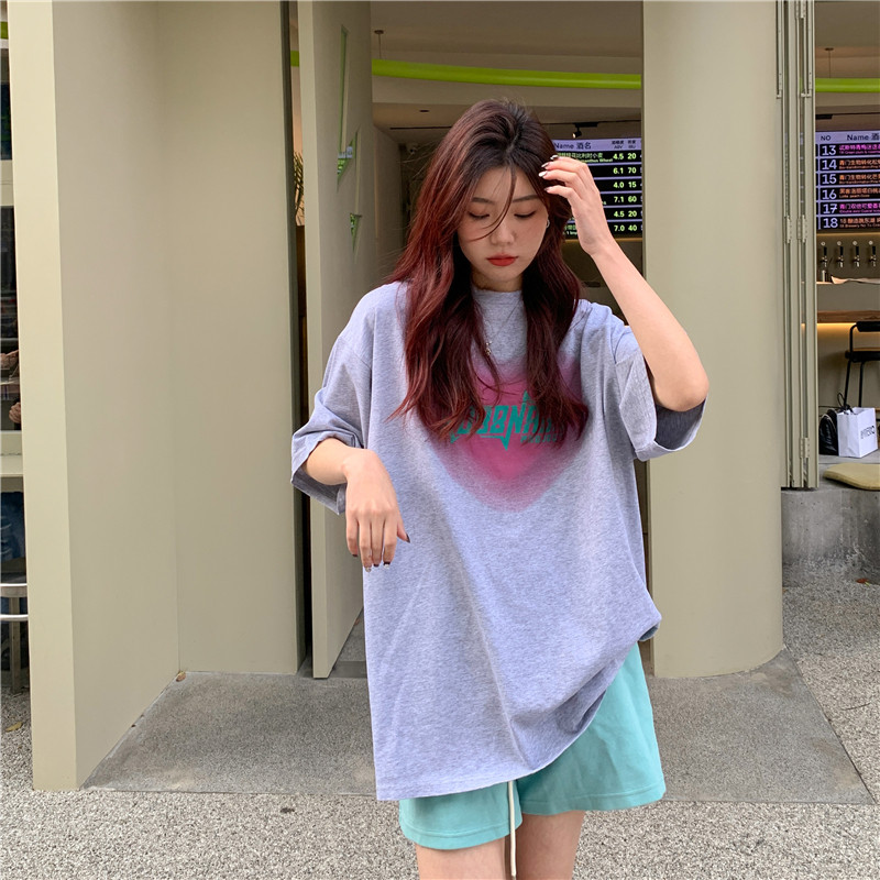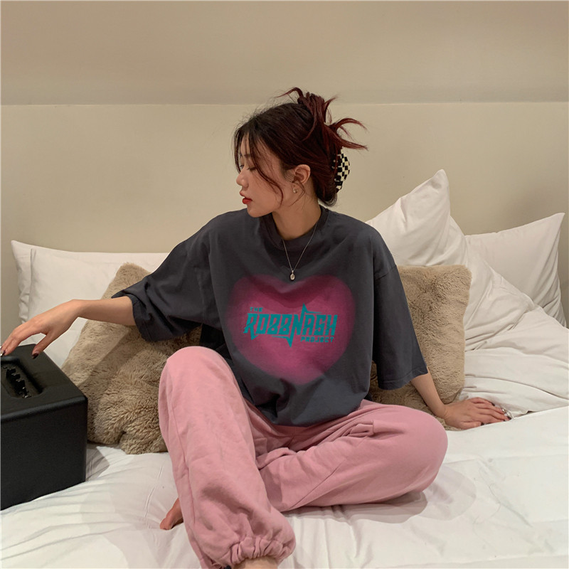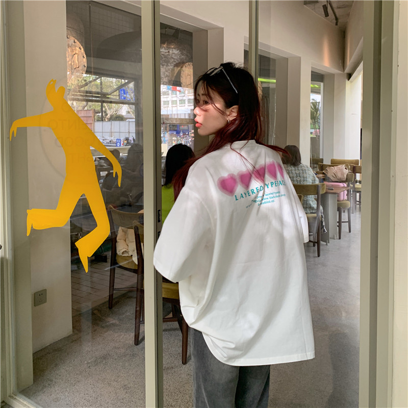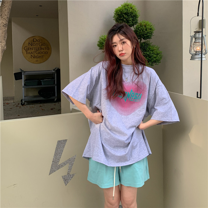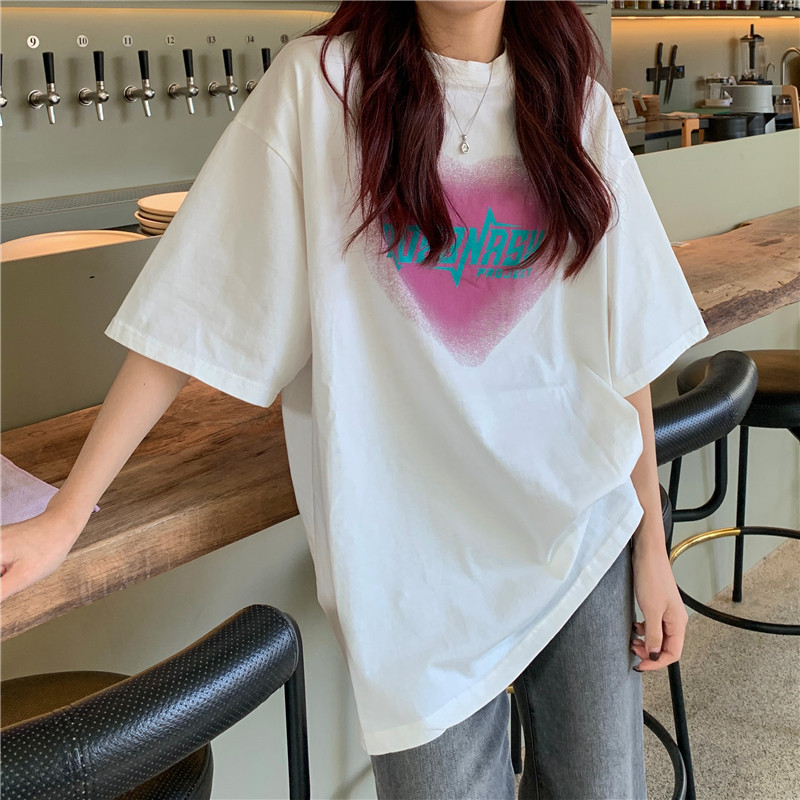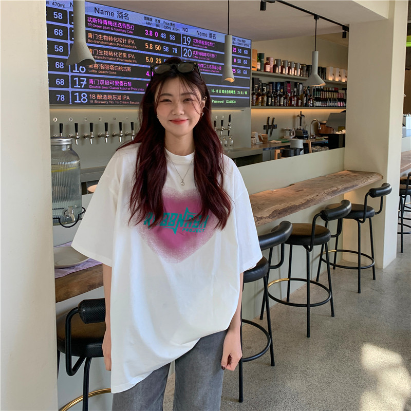 PF8118#纯棉连肩后包领宽松爱心印花中长款短袖t恤女女裝貨源服裝批發