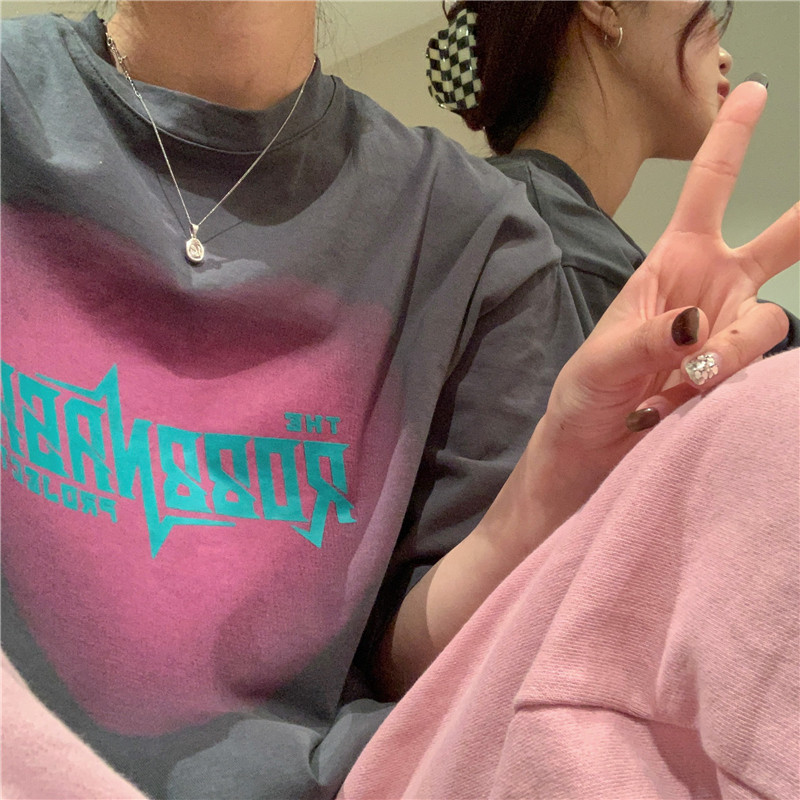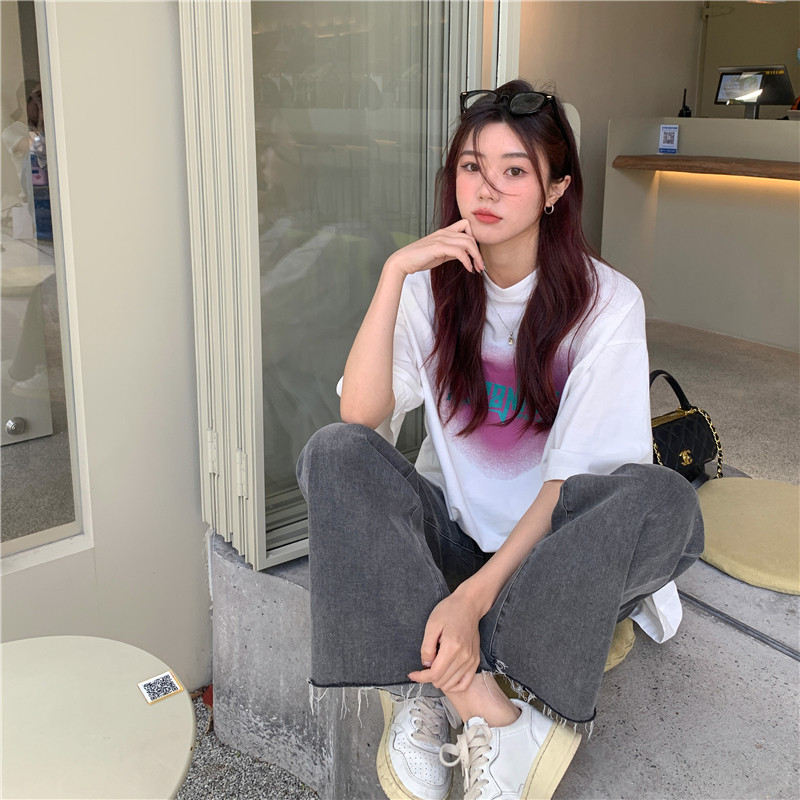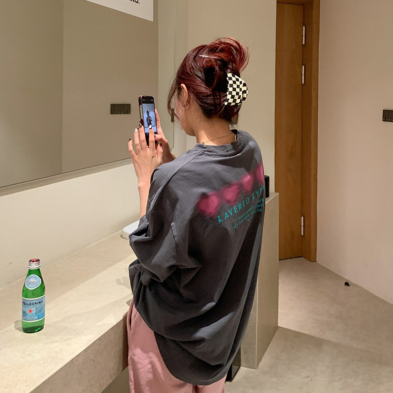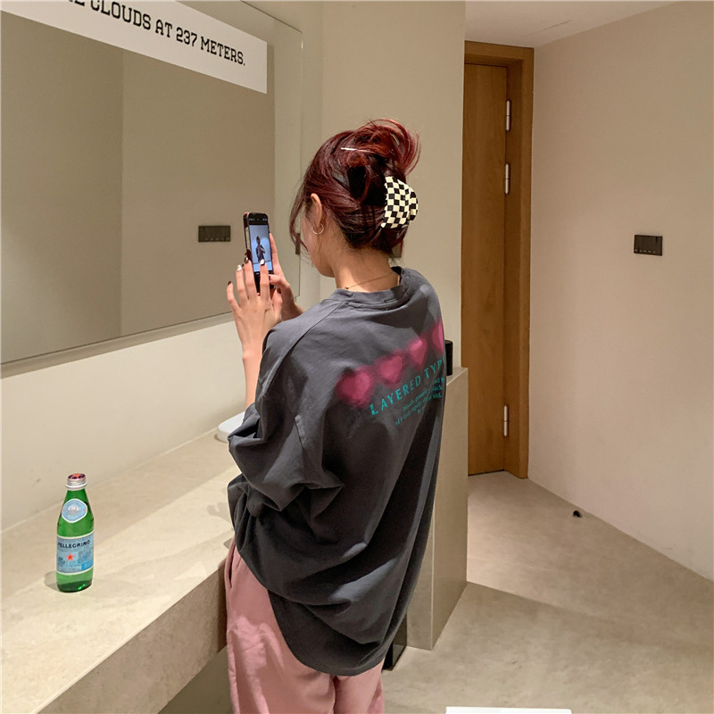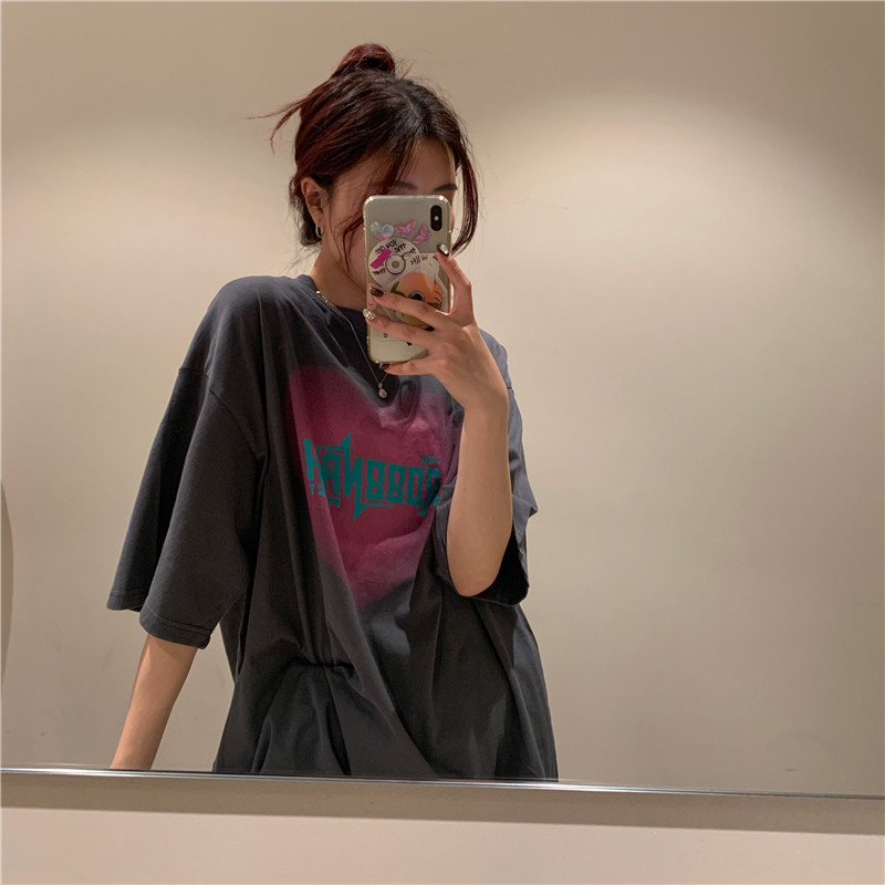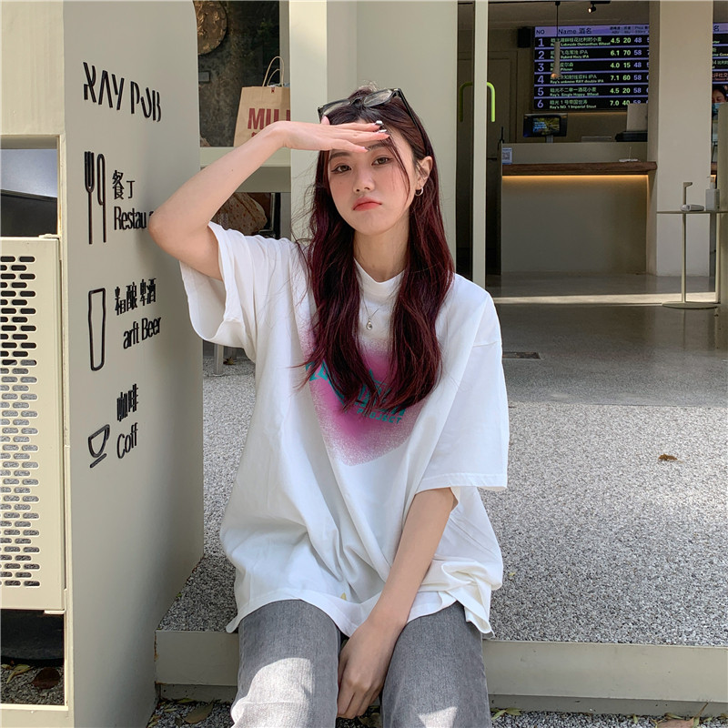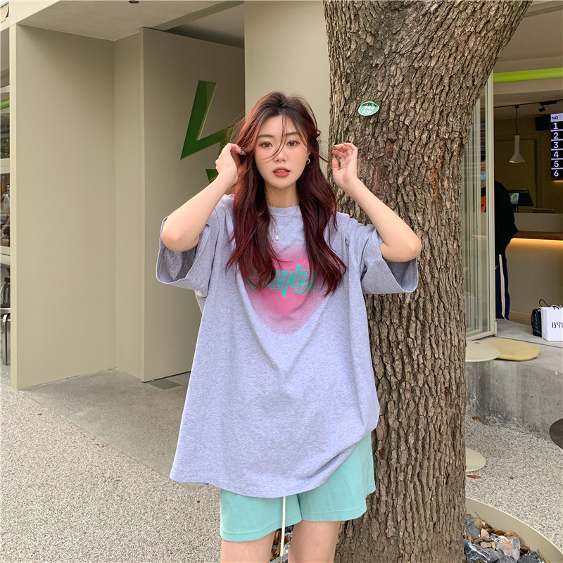 PF8118#纯棉连肩后包领宽松爱心印花中长款短袖t恤女女裝貨源服裝批發