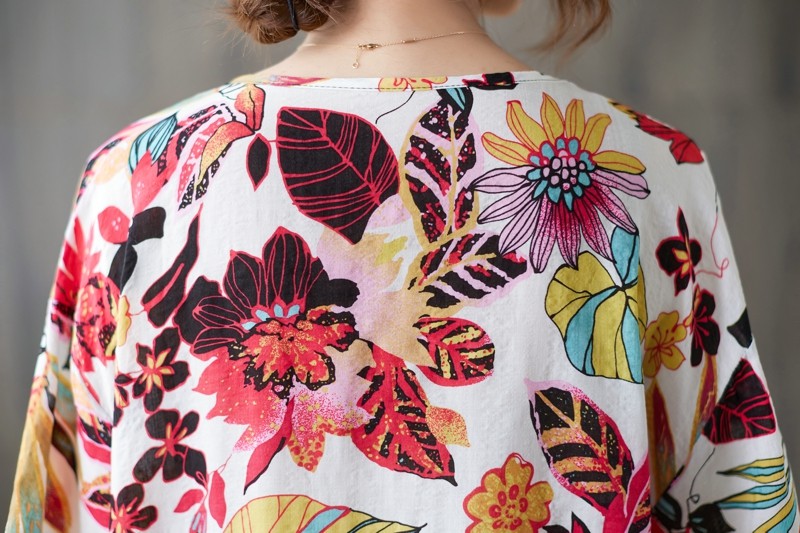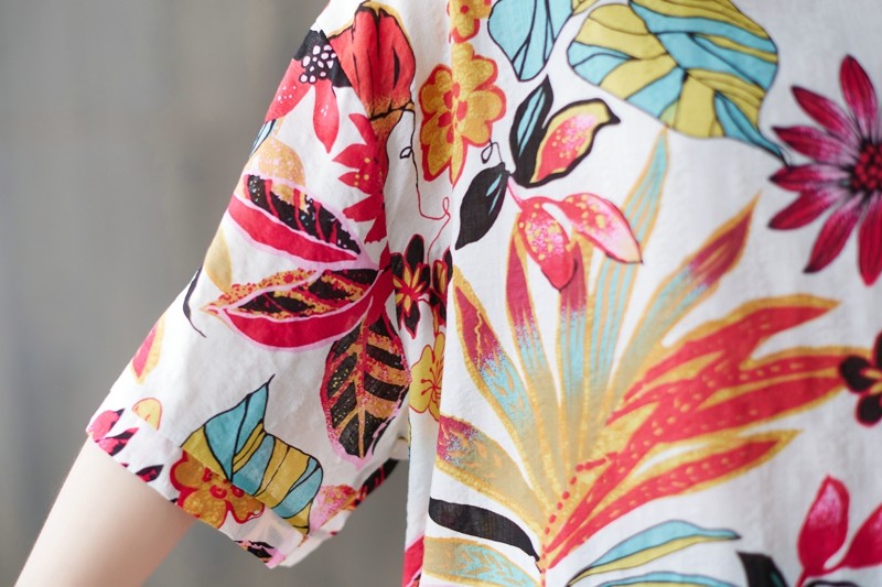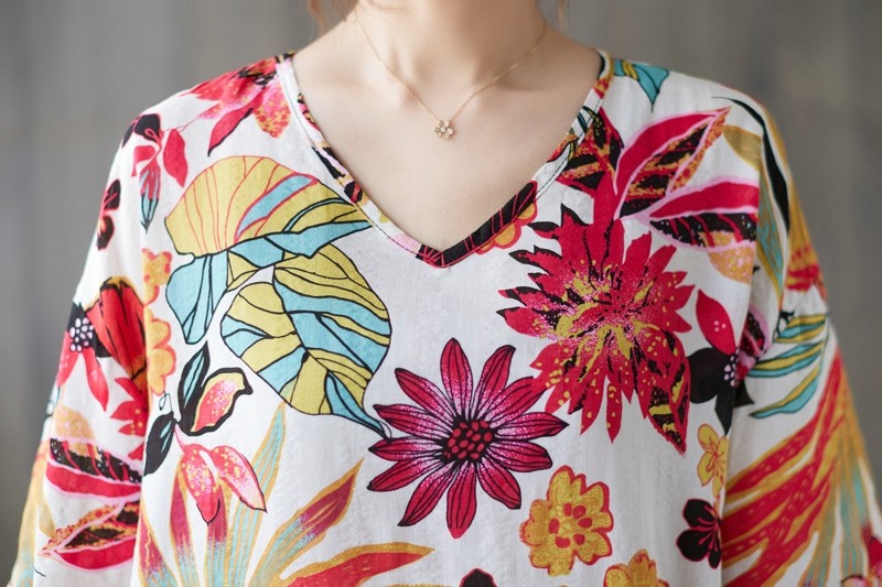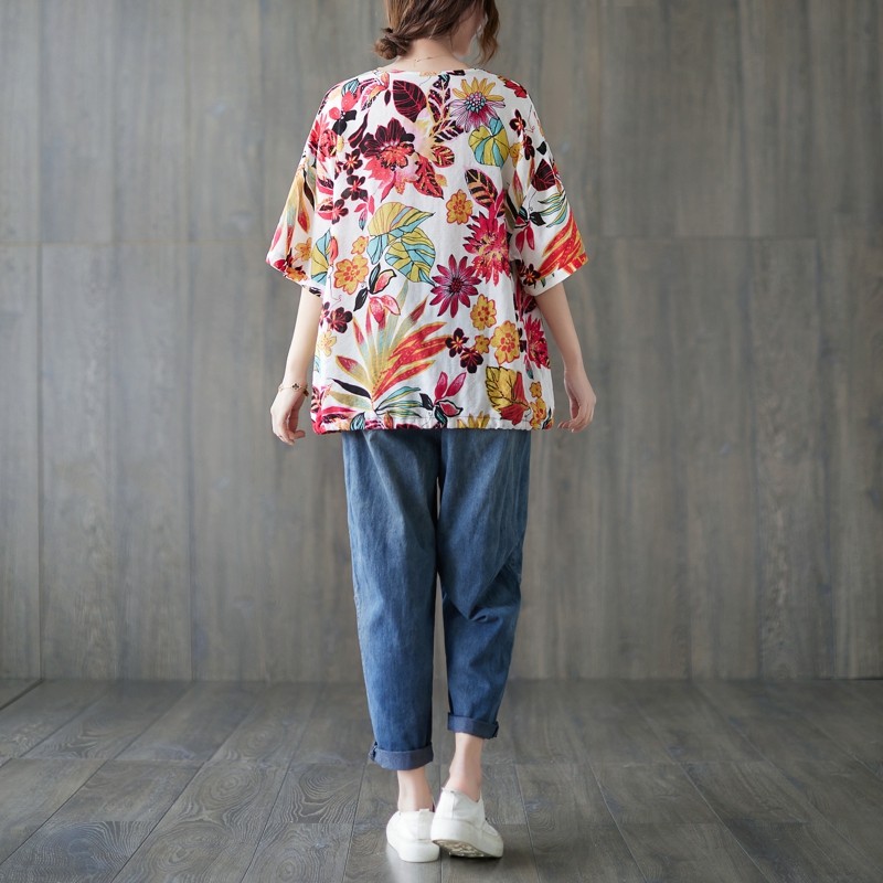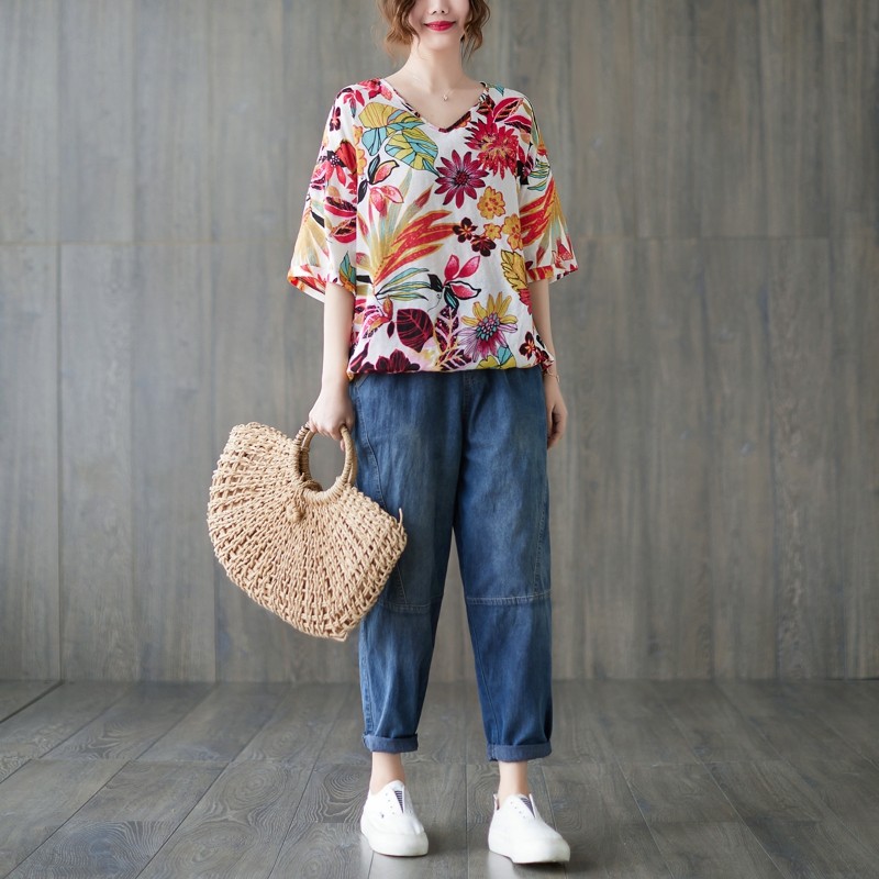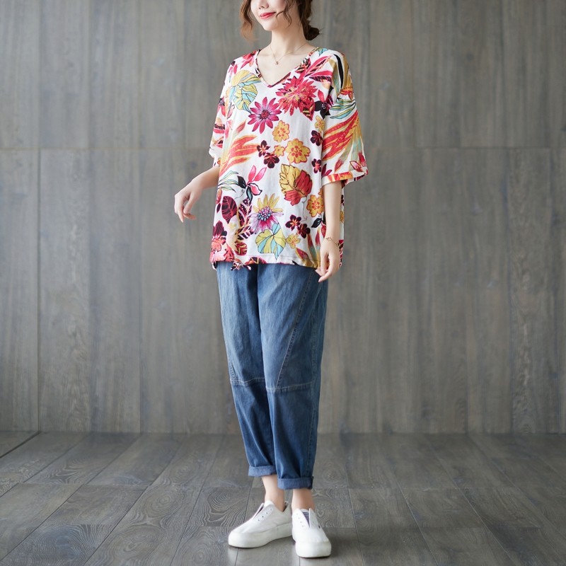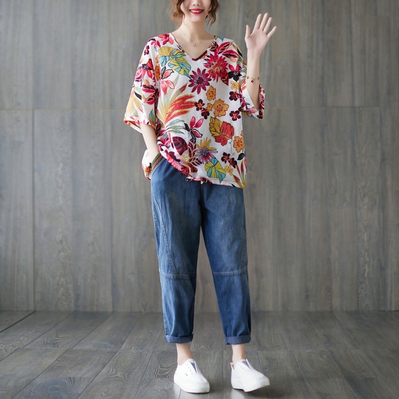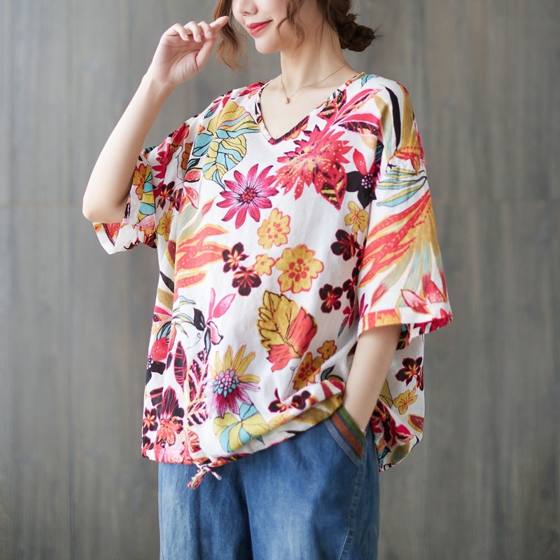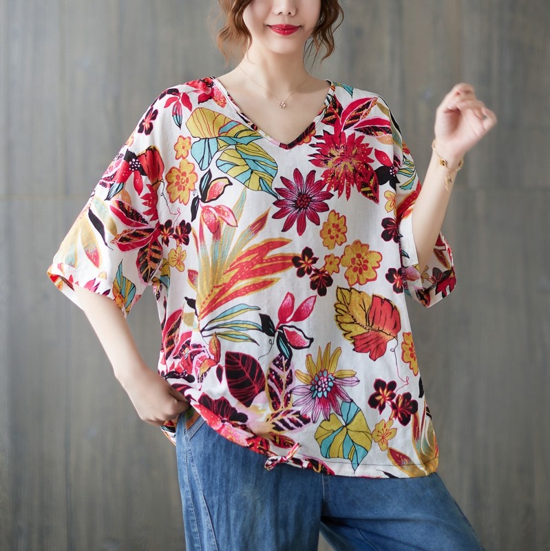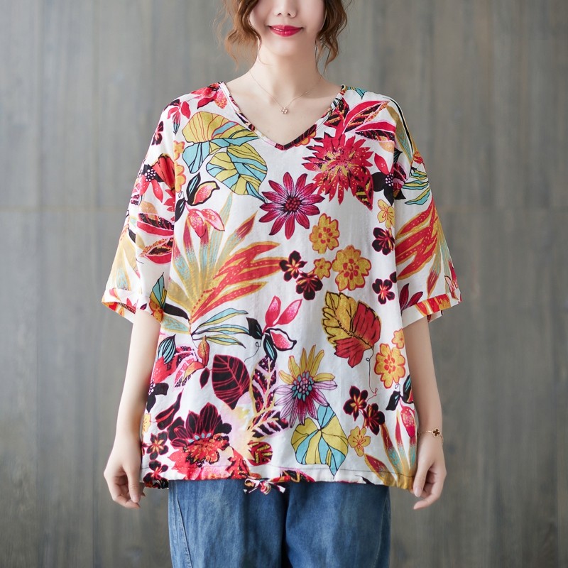 PF11957#胖MM棉麻印花V领大码T恤衫绑带宽松百搭上衣女裝貨源服裝批發