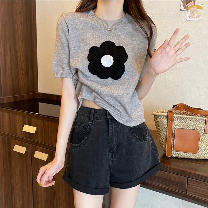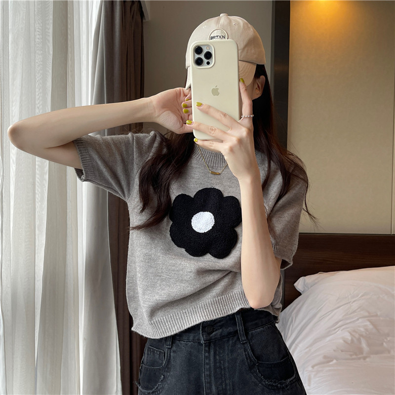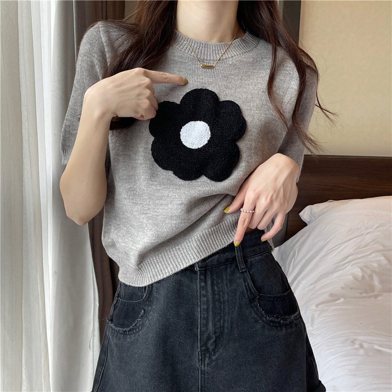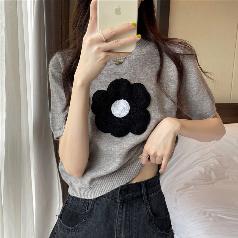 PF12161#花朵提花短袖t恤针织衫女毛衣女裝貨源服裝批發