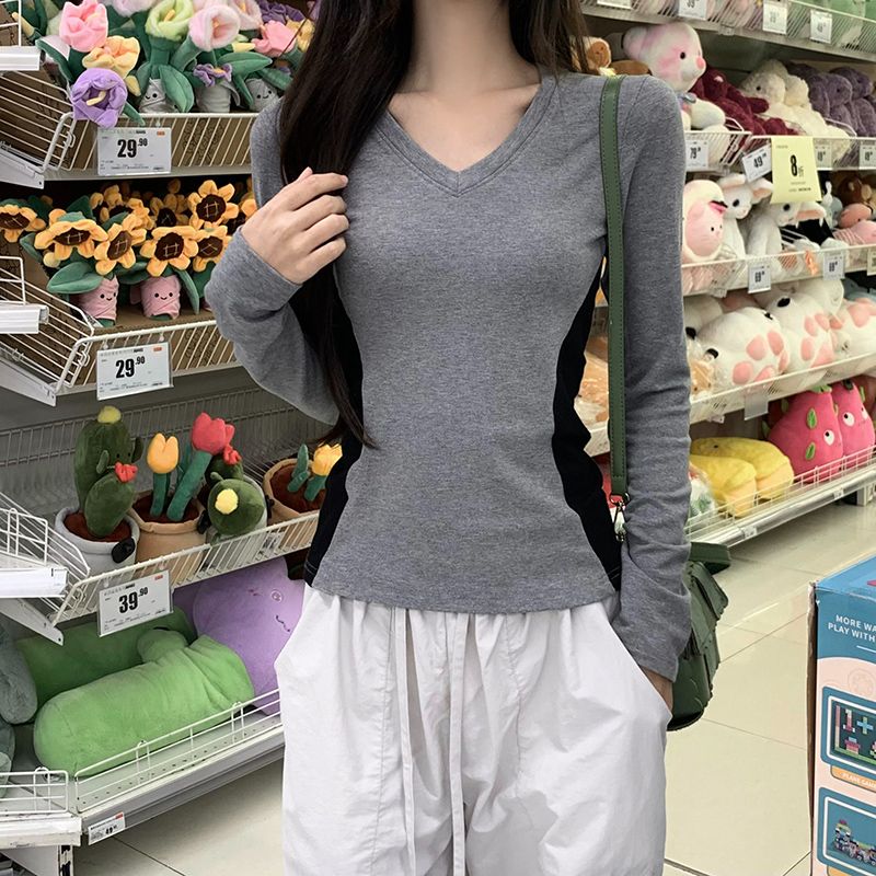 PF29478#人棉磨毛加绒加厚打底衫女内搭春秋冬长袖拼色v领女裝貨源服裝批發