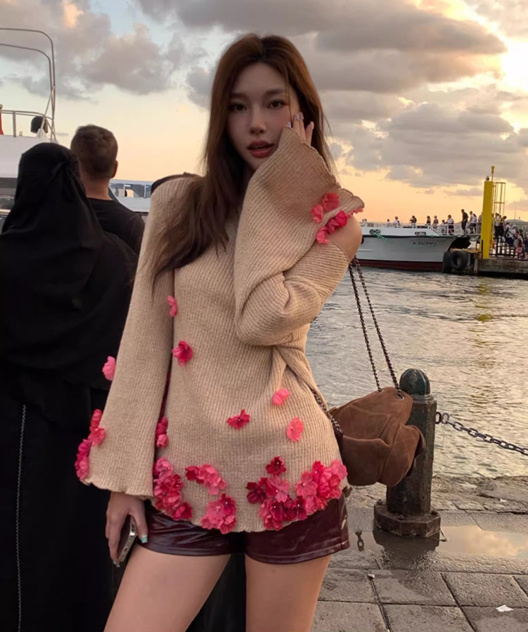 PF29482#新款简约休闲花朵手工钉珠花朵毛衣套头喇叭袖一字领毛衣女裝貨源服裝批發