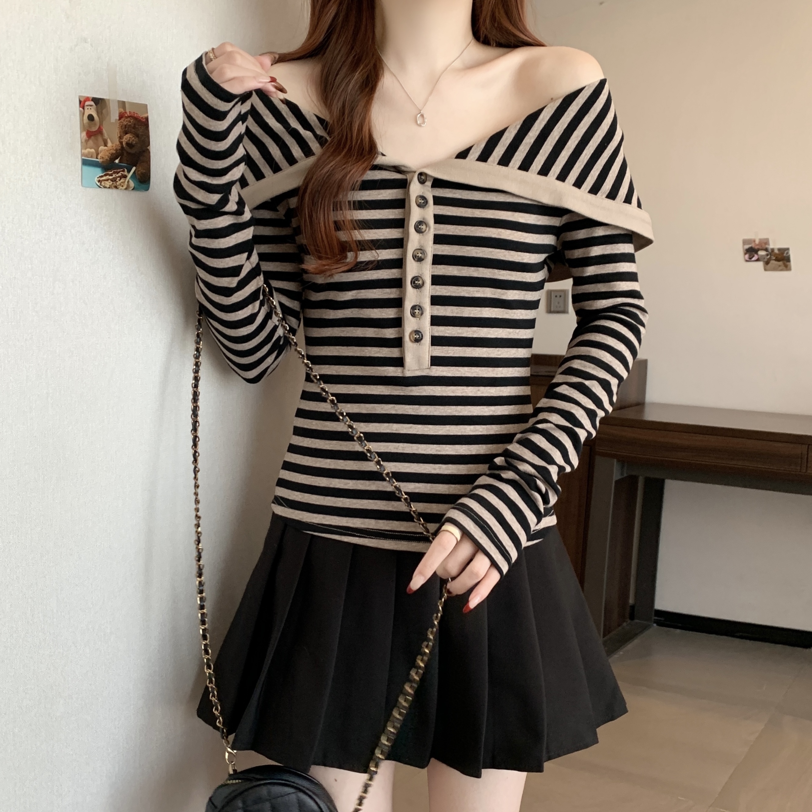 MY515# 新款大码胖mm咖色条纹长袖T恤设计感翻领上衣女裝貨源服裝批發