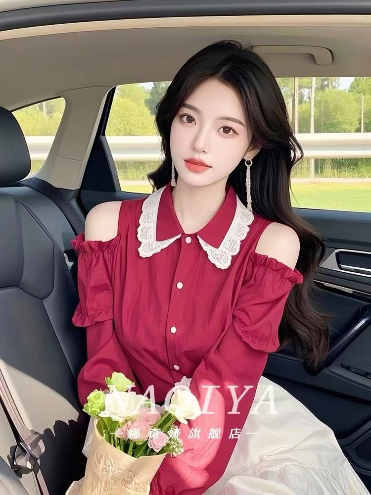 MY1076# 法式设计感小众风情万种超好看独特漂亮梅子色露肩衬衫上衣女女裝貨源服裝批發