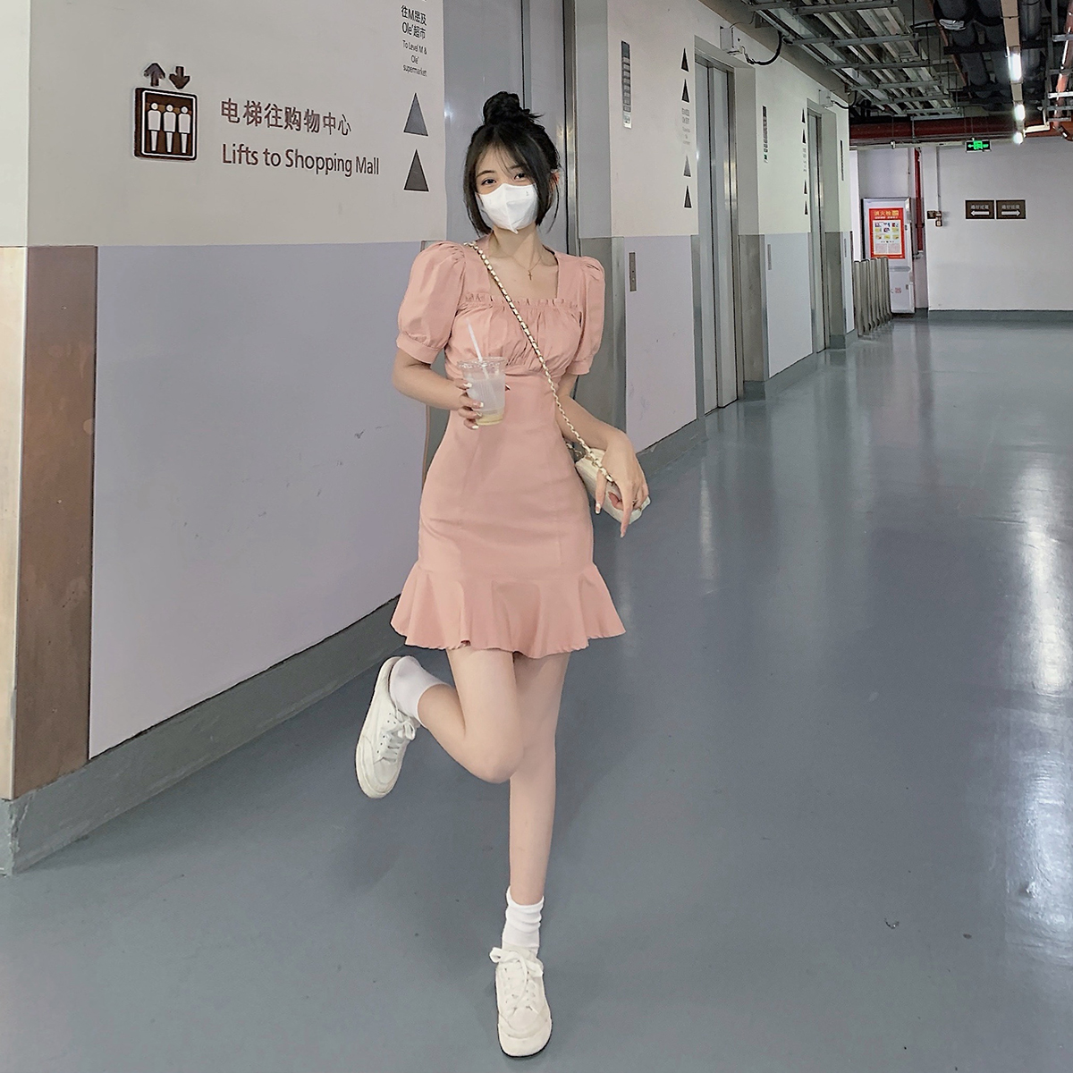 MY5008# 大码女装温柔风甜美粉色连衣裙胖mm高腰修身方领泡泡袖A字裙女裝貨源服裝批發