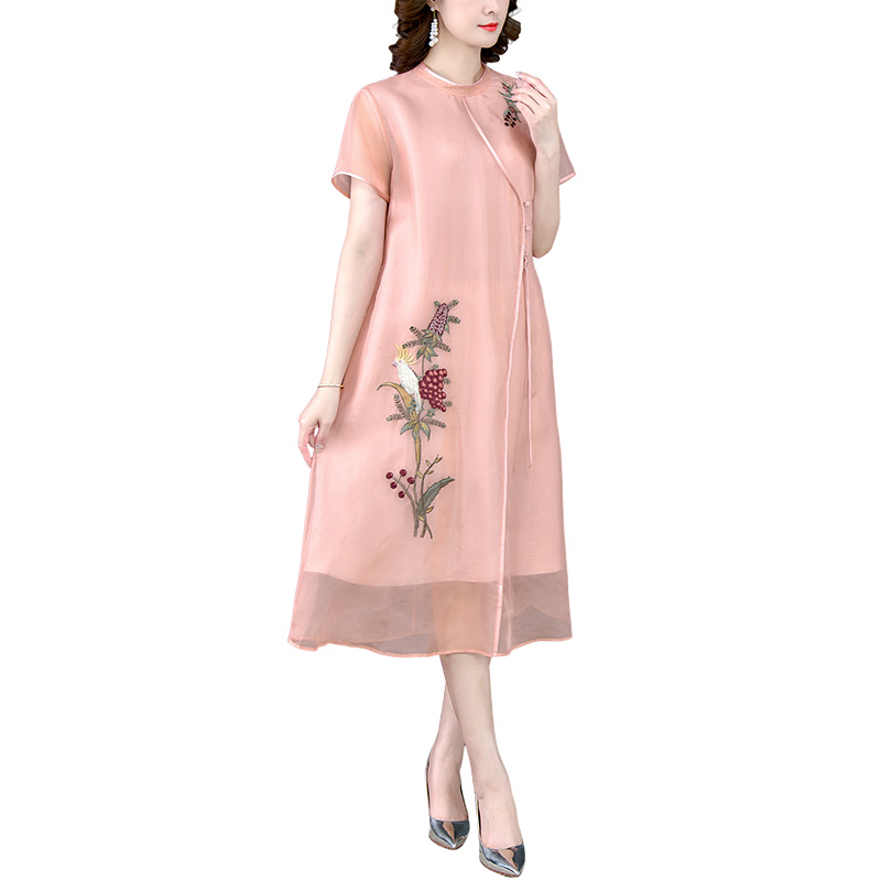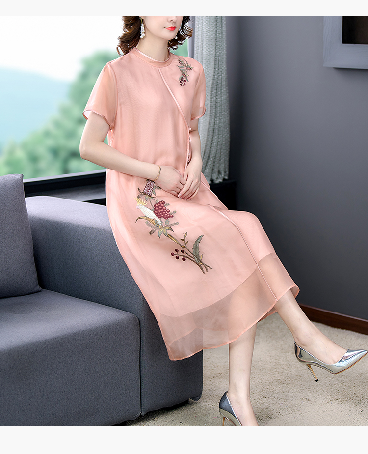 MY5023# 国风桑蚕丝小立领花鸟刺绣夏新款短袖宽松版斜门襟女式连衣裙2025女裝貨源服裝批發