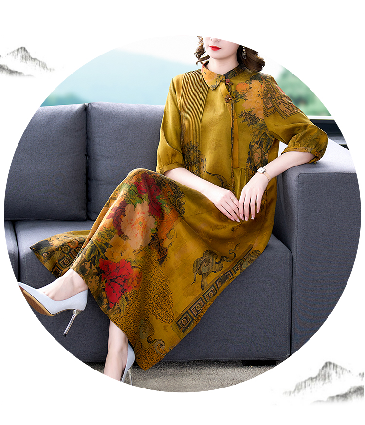 MY5028# 香云纱改良旗袍桑蚕丝长裙复古印花气质真丝连衣裙女裝貨源服裝批發