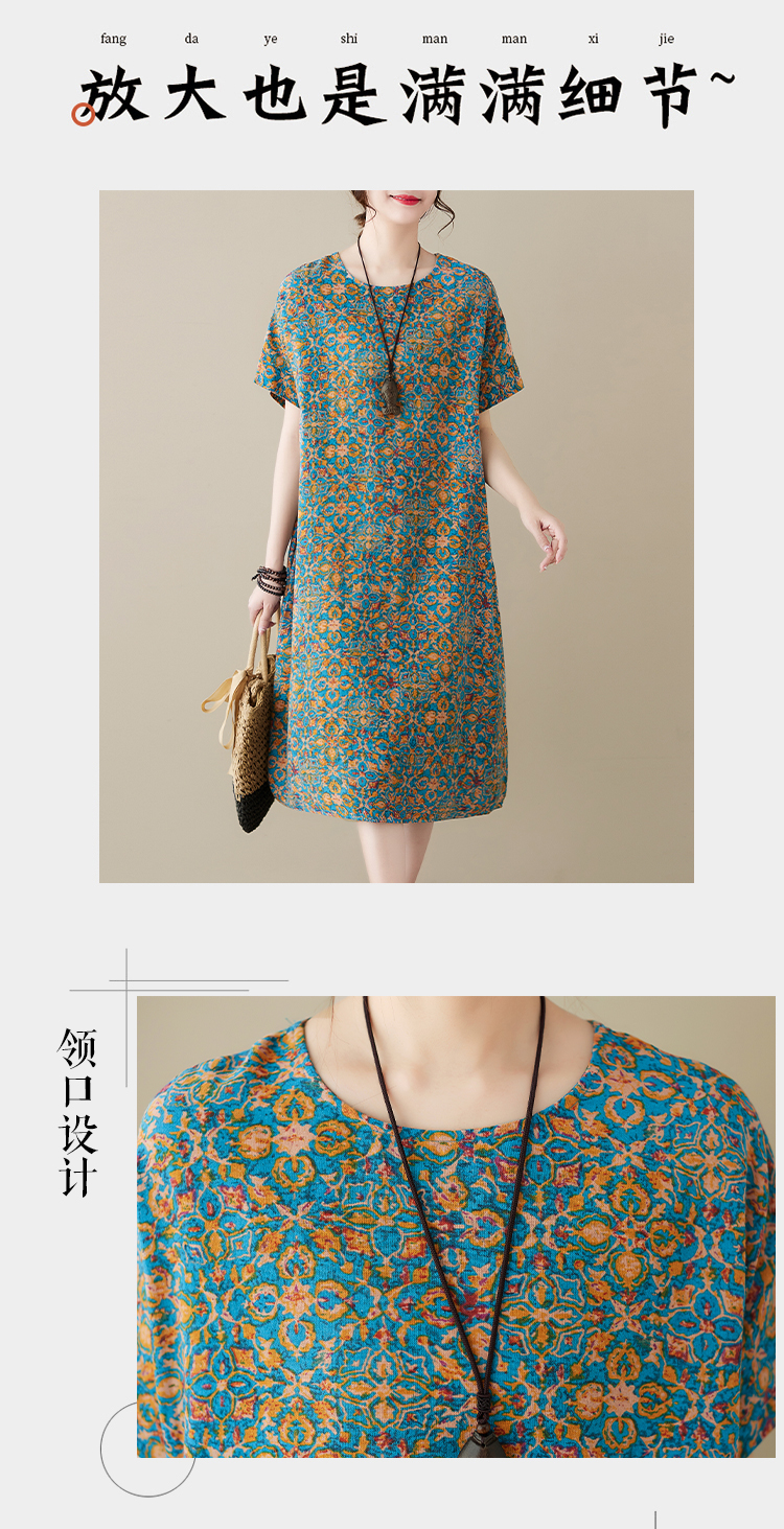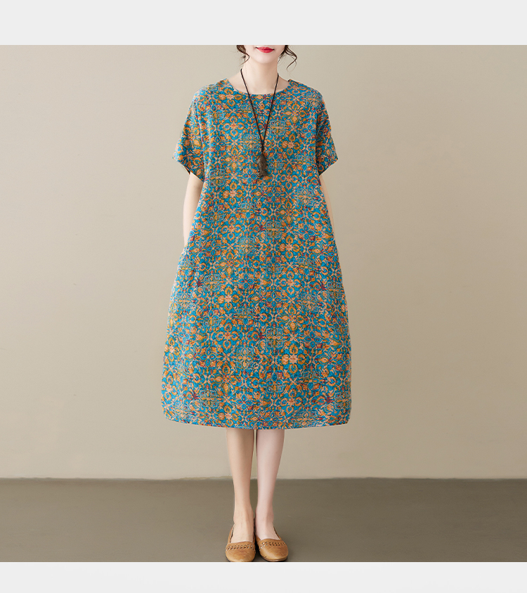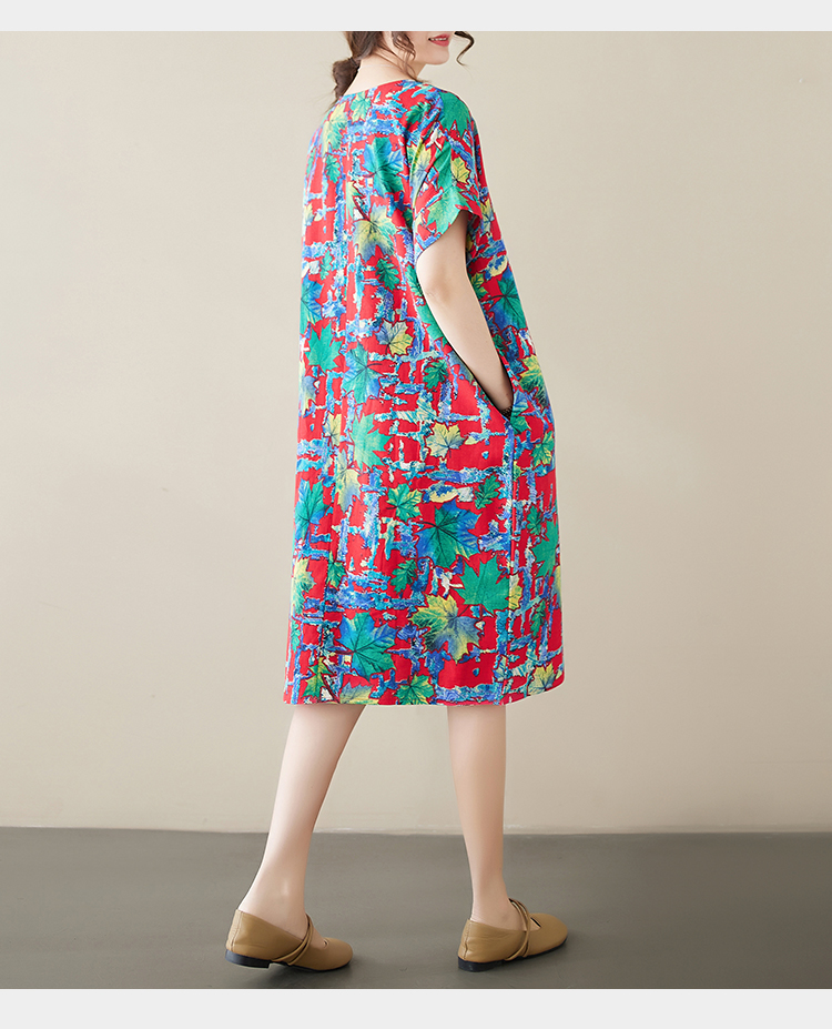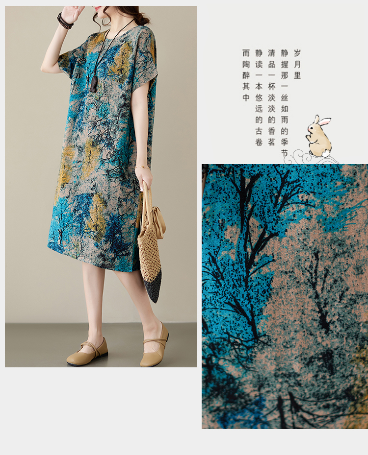 MY5607# 印花棉麻蝙蝠袖连衣裙夏季洋气减龄遮肚子连衣裙女裝貨源服裝批發