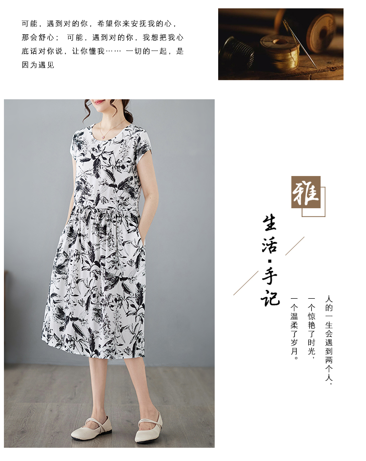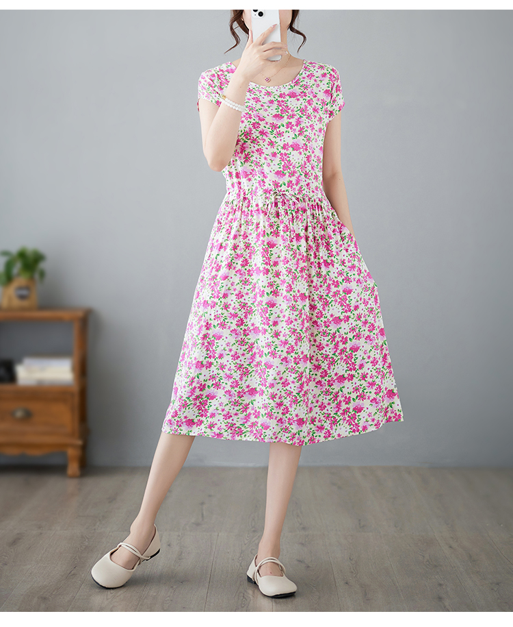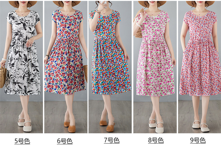 MY5608# 碎花绵绸连衣裙女新款显瘦外穿中长裙短袖人造棉大摆沙滩裙女裝貨源服裝批發
