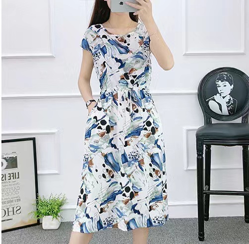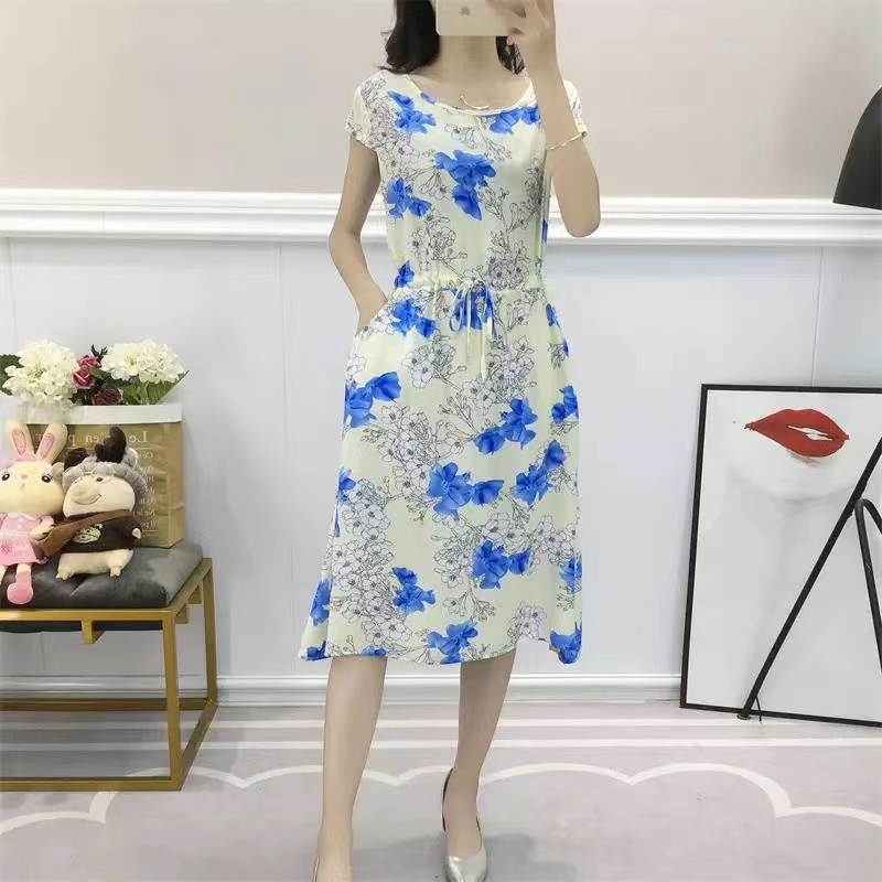 MY5609# 棉绸睡裙时尚外穿中长款裙子夏天韩版宽松短袖人造棉连衣裙女裝貨源服裝批發