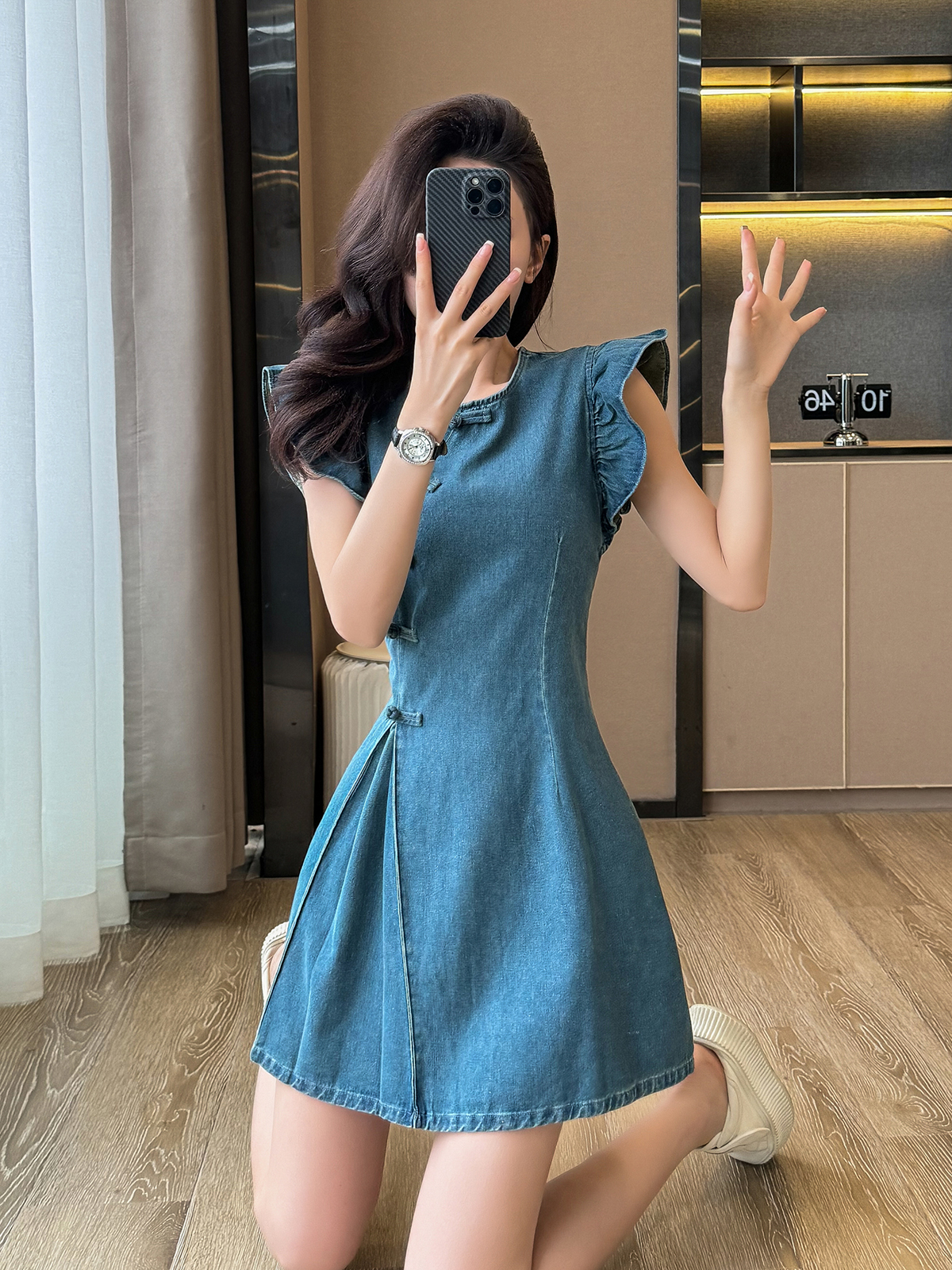 MY6245# 牛仔连衣裙短裙新中式圆领盘扣中国风a字收腰高腰显瘦女裝貨源服裝批發