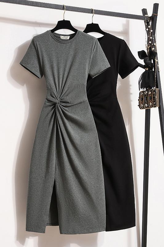 MY6542# 大码夏开叉长裙女简约休闲修身收腰褶皱不规则短袖连衣裙女裝貨源服裝批發